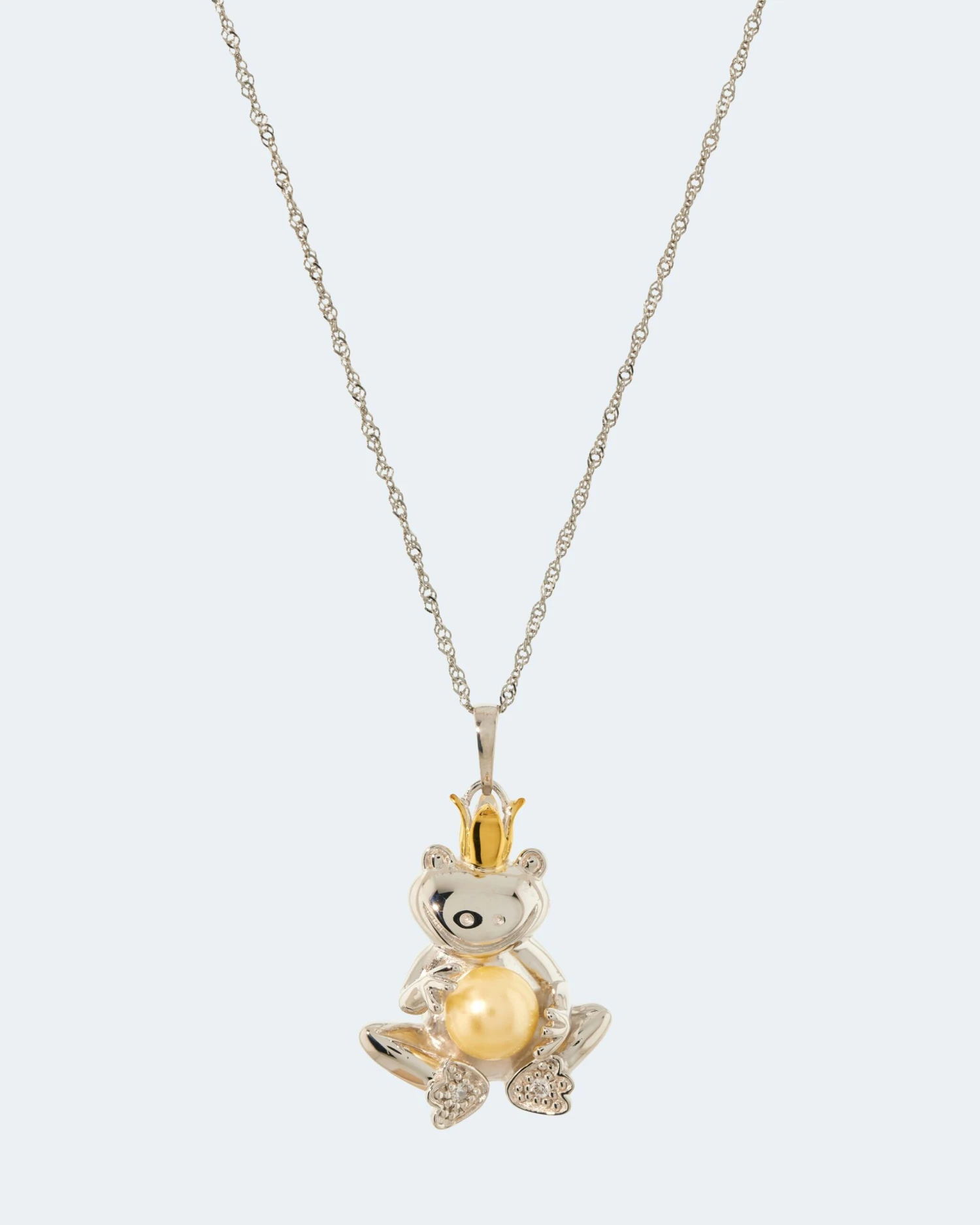 Zufrieden blickt das Kerlchen in die Welt und präsentiert und sein Kugelbäuchlein, das aus einer schönen Muschelkernperle in Champagner besteht. Und auch seine „Füße“ braucht er nicht zu verstecken. auf ihnen blitzen 2 Zirkonia, im echten Brillantschliff facettiert. Ein süßer Anblick!