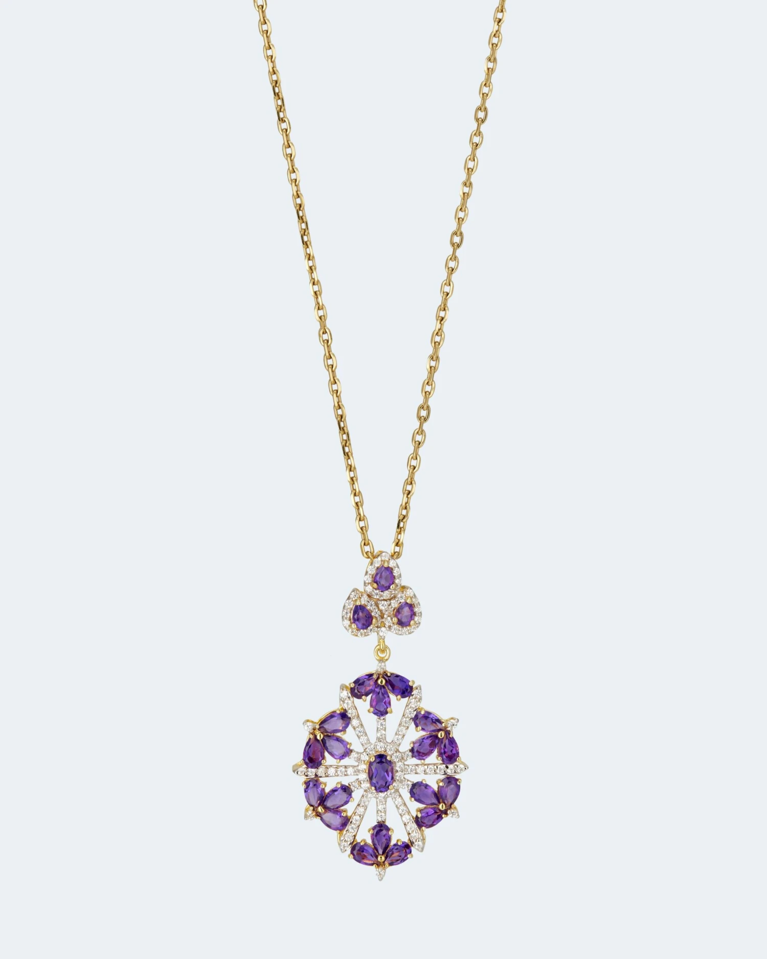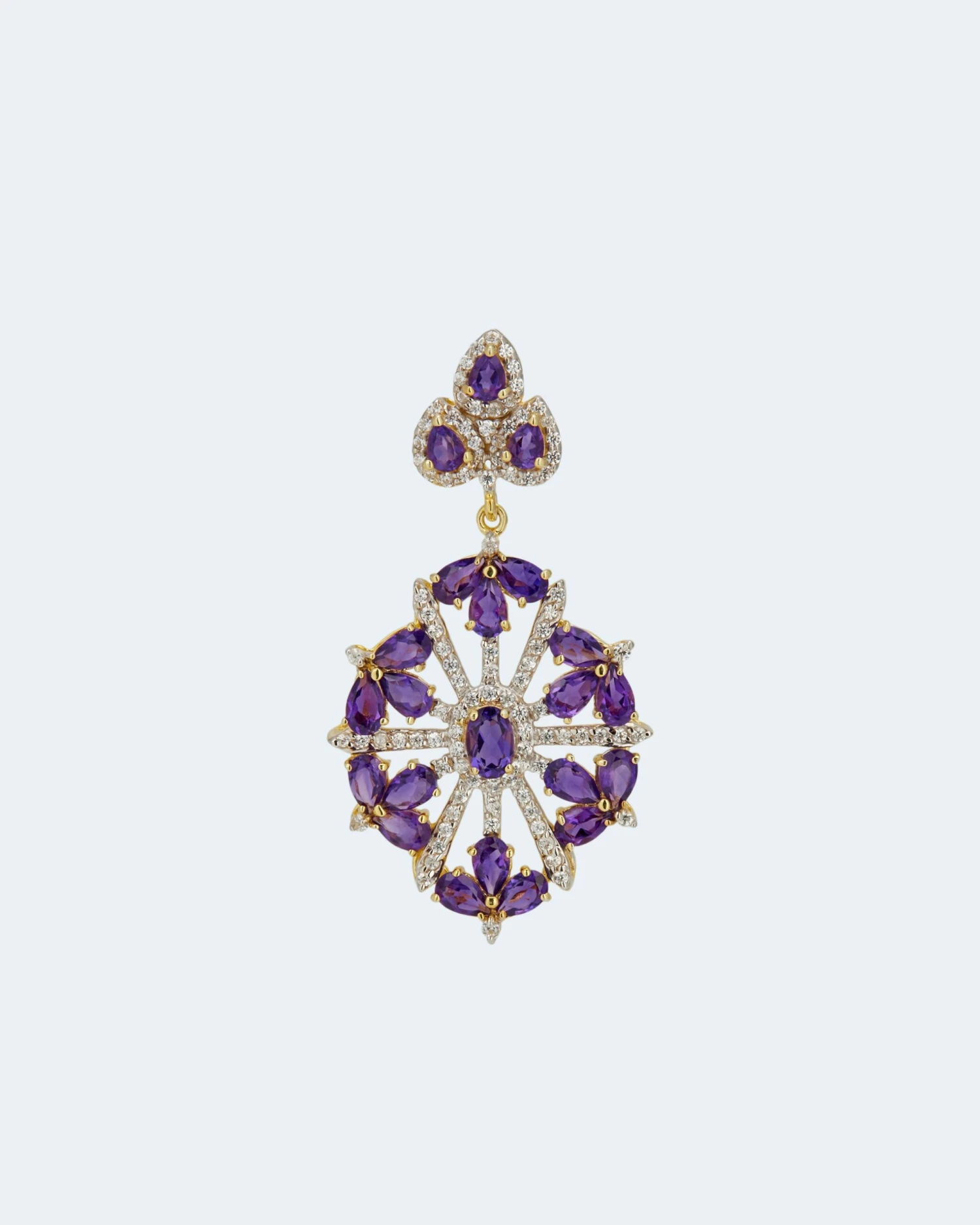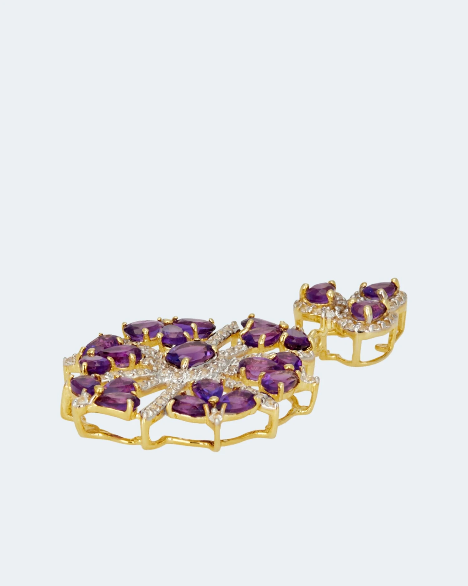 Insgesamt 22 Amethyste, zu feinen Ovalen und Tropfen geschliffen, sind in einem zweigeteilten Element verarbeitet. Der untere Teil ist durchbrochen gestaltet, wodurch er trotz seiner Größe leicht und duftig wirkt. Der gesamte Anhänger besitzt eine blütenhafte Ästhetik, wunderbar vollendet durch weiße Zirkone.