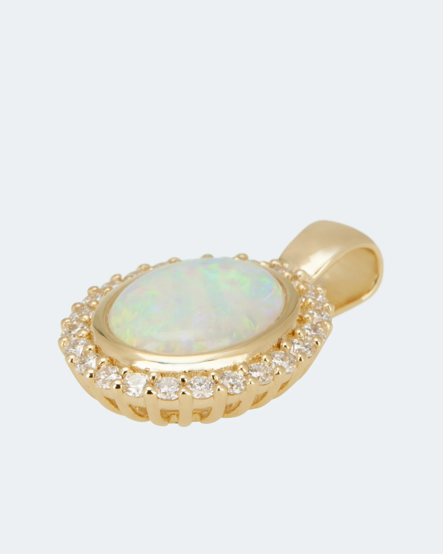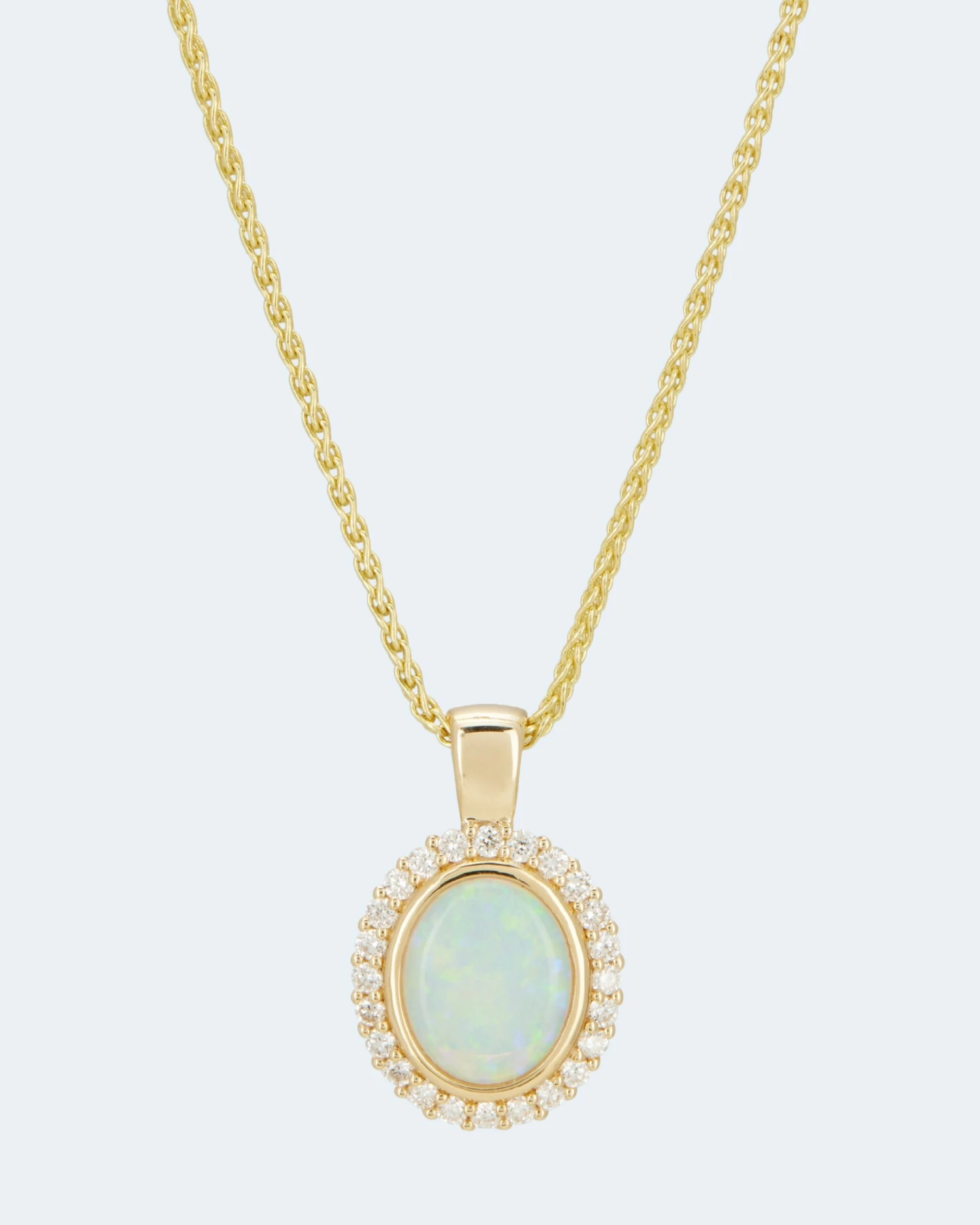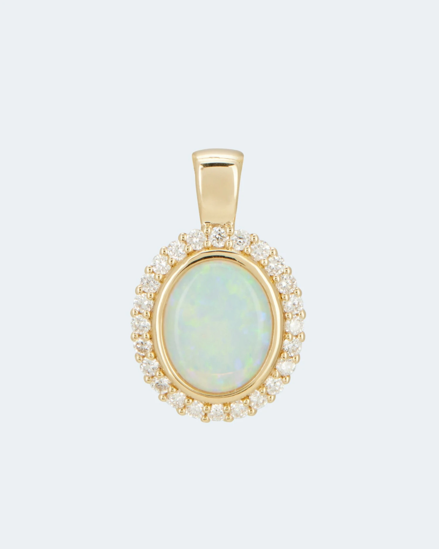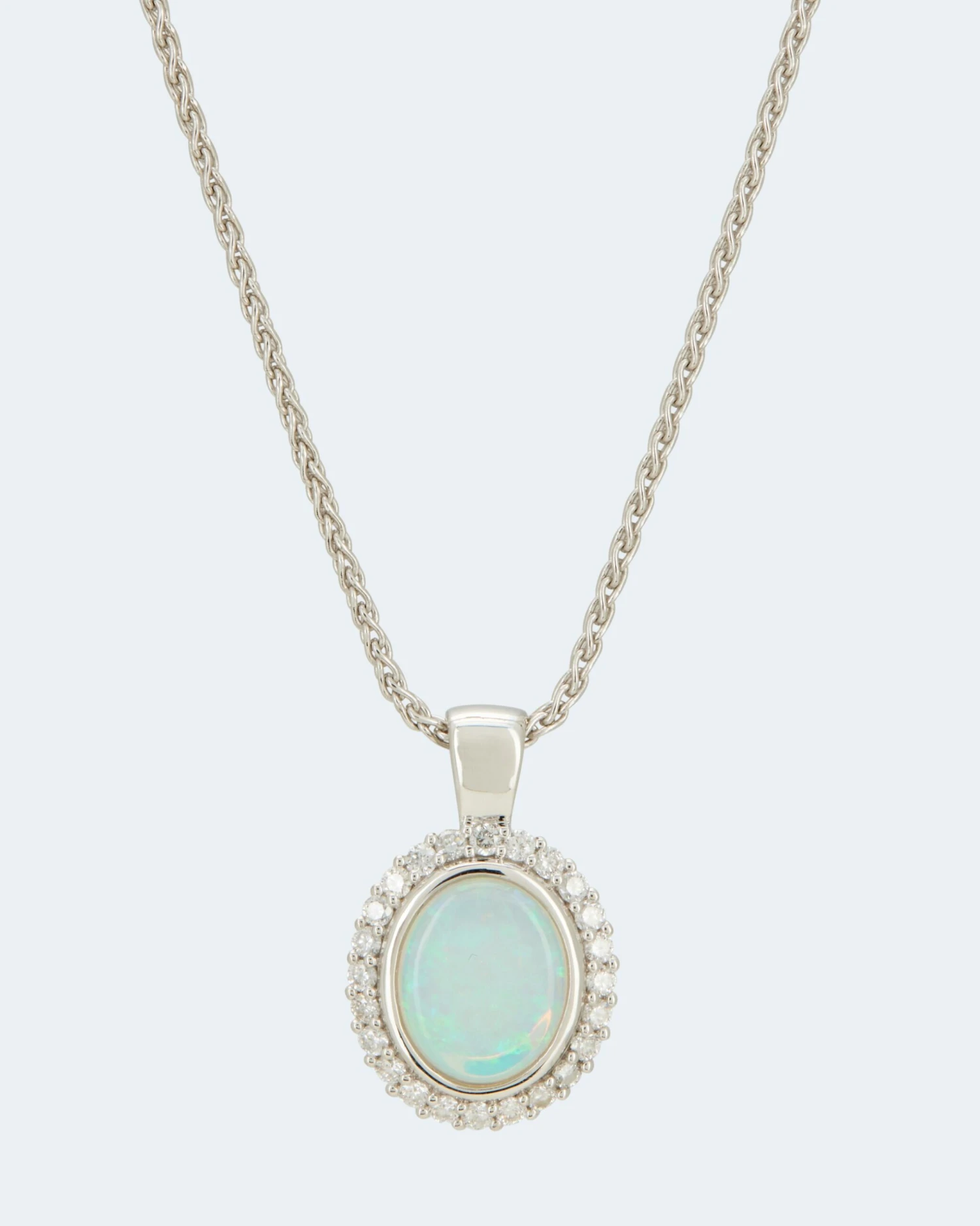 Ein Anhänger, strahlend schön wie die Sonne: Im Zentrum thront ein großer ovaler Kristallopal in einer dezenten Zargenfassung. Im Cabochonschliff veredelt, kommt sein opalisierender Schimmer optimal zur Geltung. Umringt von 24 weißen Brillanten in kleinen Krappen, die das bezaubernde Blütendesign komplett machen. Alle in sehr guter Schliffqualität und der Reinheit SI2.