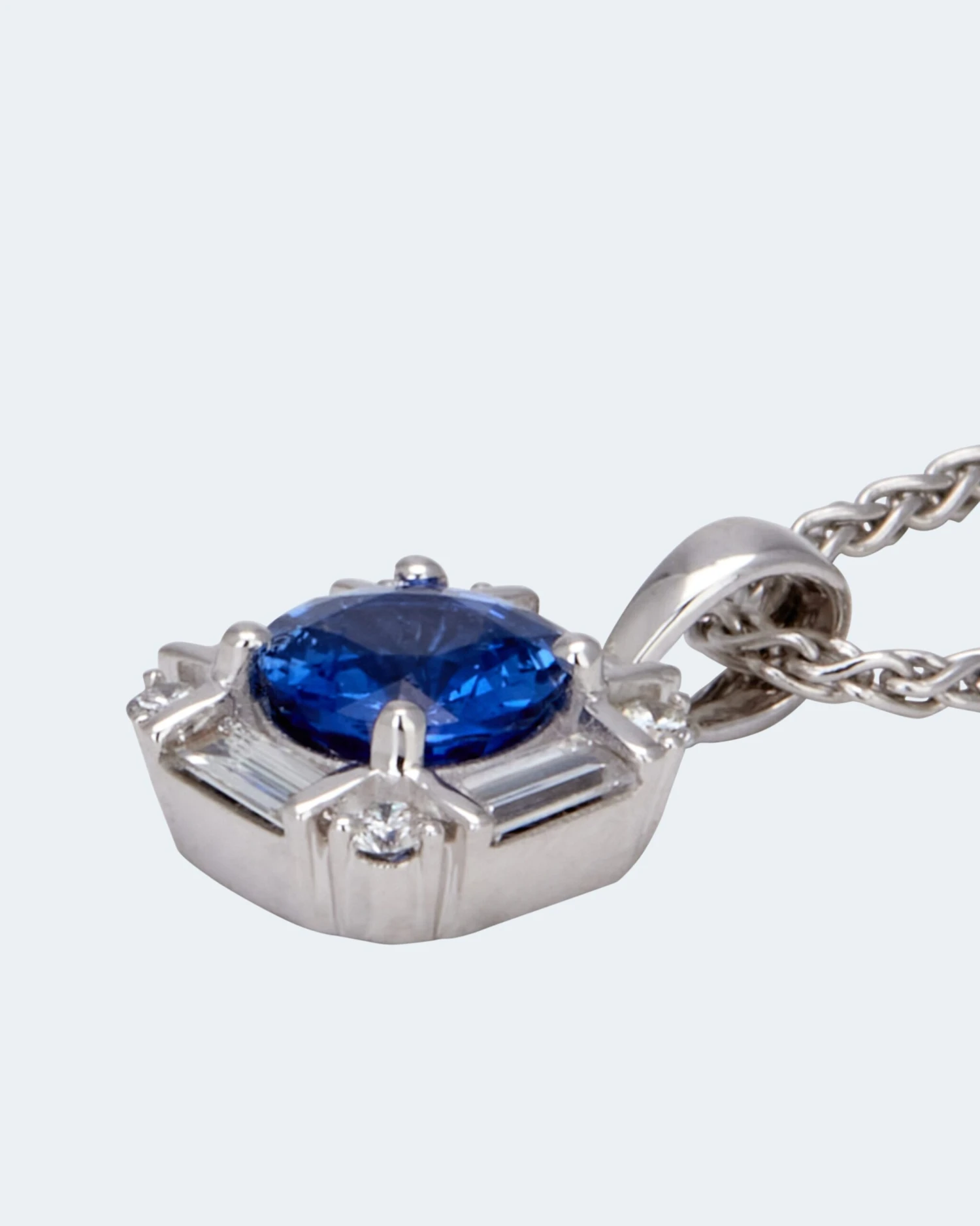 Mit diesem Schmuck-Kunstwerk machen Sie Ihr Dekolleté zu einem faszinierenden Anblick. Der Anhänger verführt mit einer äußerst edlen Komposition aus Diamanten in unterschiedlichen Formen und Schliffen sowie einem strahlenden Saphir in Kornblumenblau. Dazu kommt das besonders noble Weißgold, das die Edelsteine zur Vollendung bringt.