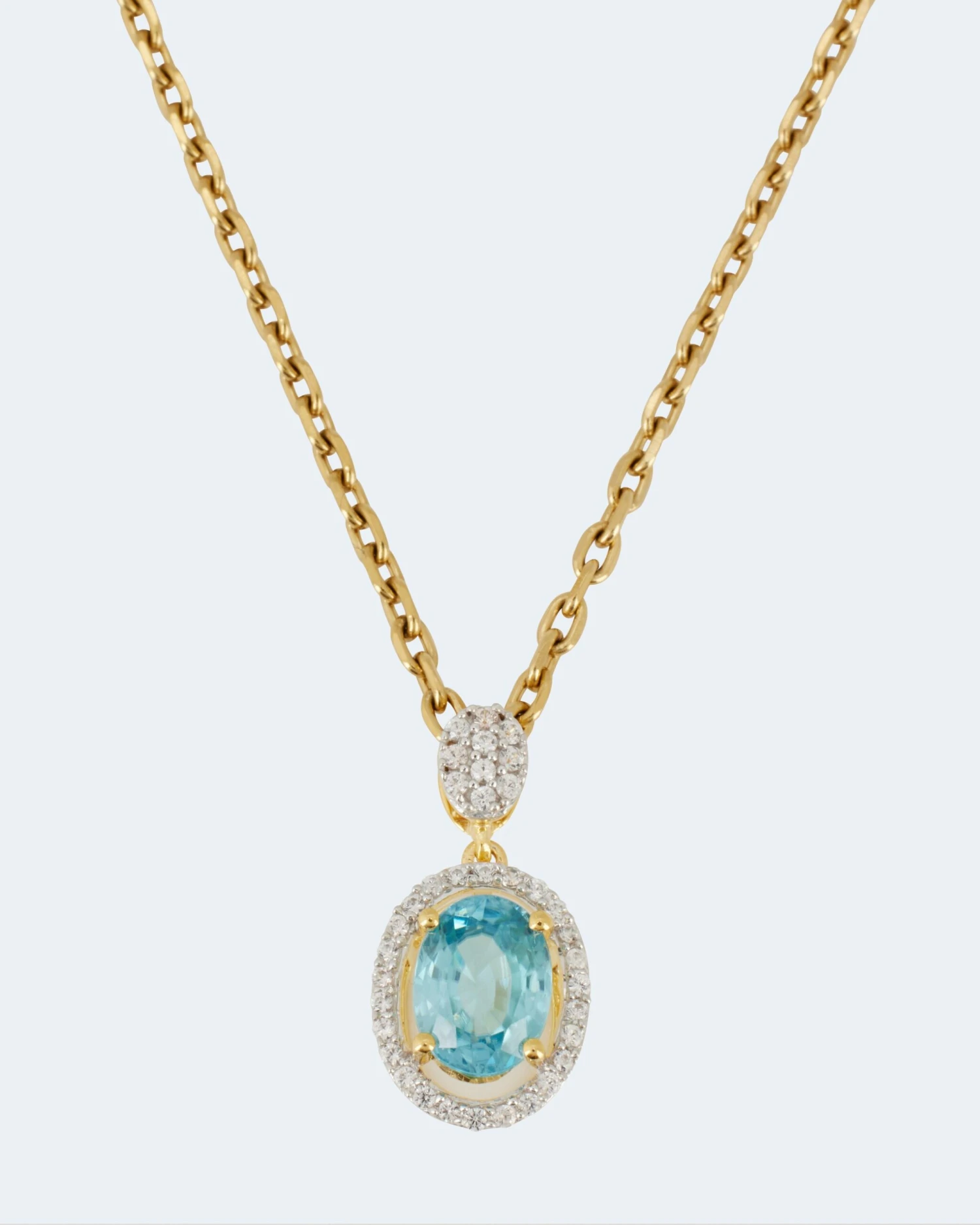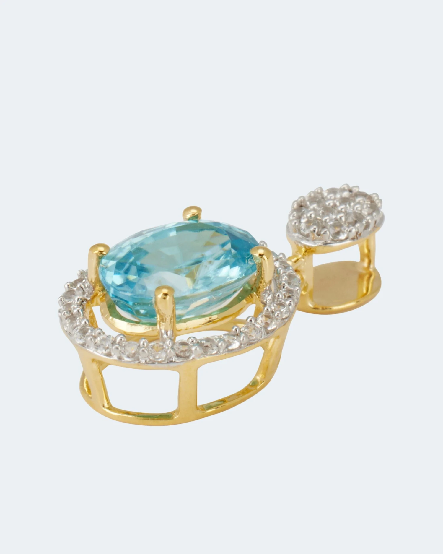 Haupt-Blickfang ist ein großer blauer Zirkon in ovaler Form, der mittig auf einem ebenfalls ovalen und beweglich aufgehängten Hänger-Element thront.