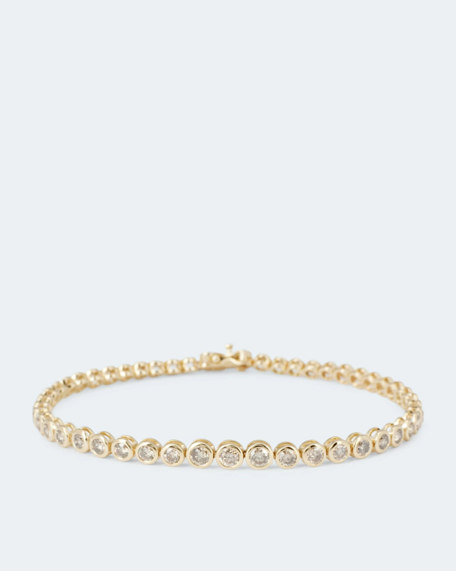 Mit diesem funkelnden Luxus-Armband am Handgelenk wird Ihr Look zu etwas ganz Besonderem und die Schönheit des Brillantarmbands macht einfach nur glücklich. Das Armband ist aus hochglanzpoliertem 585er Gelbgold und je nach Länge mit 49 oder 55 Brillanten im edlen Champagnerton ausgefasst. Die Brillanten sind im Brillantschliff veredelt, haben die Reinheit P1 und werden von zarten Krappen gehalten. Verschlossen wird das Schmuckmeisterwerk mit einem Kastenschloss mit zwei Sicherheitsachten.