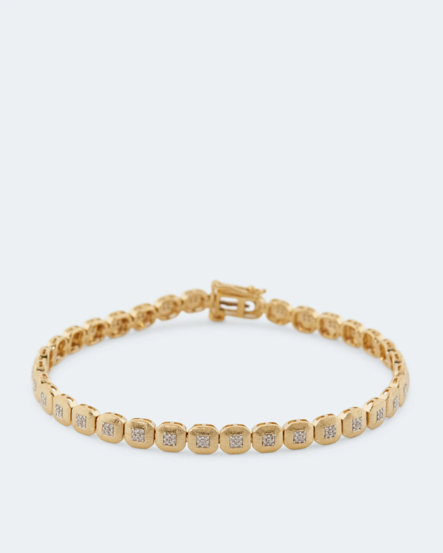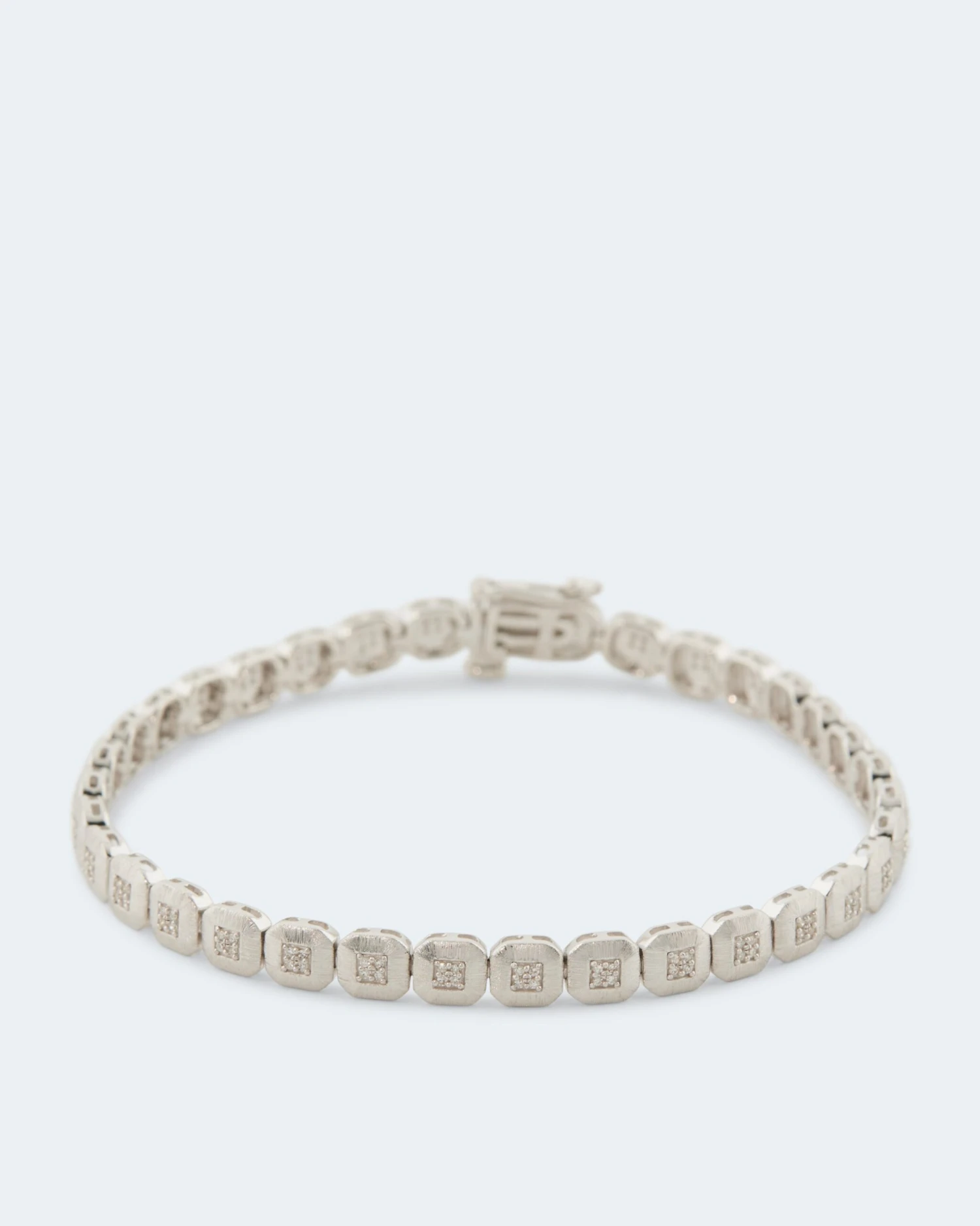 Das Armband besteht aus vielen viereckigen, kleinen Gliedern, die im Inneren mit weißen Diamanten ausgefasst sind. Die Edelsteine sind von guter Schliffqualität und besitzen die Reinheit P1. Das unglaubliche Glitzern entsteht durch den Achtkantschliff, der dafür sorgt, dass die Diamanten bei jeder Ihrer Bewegungen ein wahres Funkelfeuerwerk veranstalten.