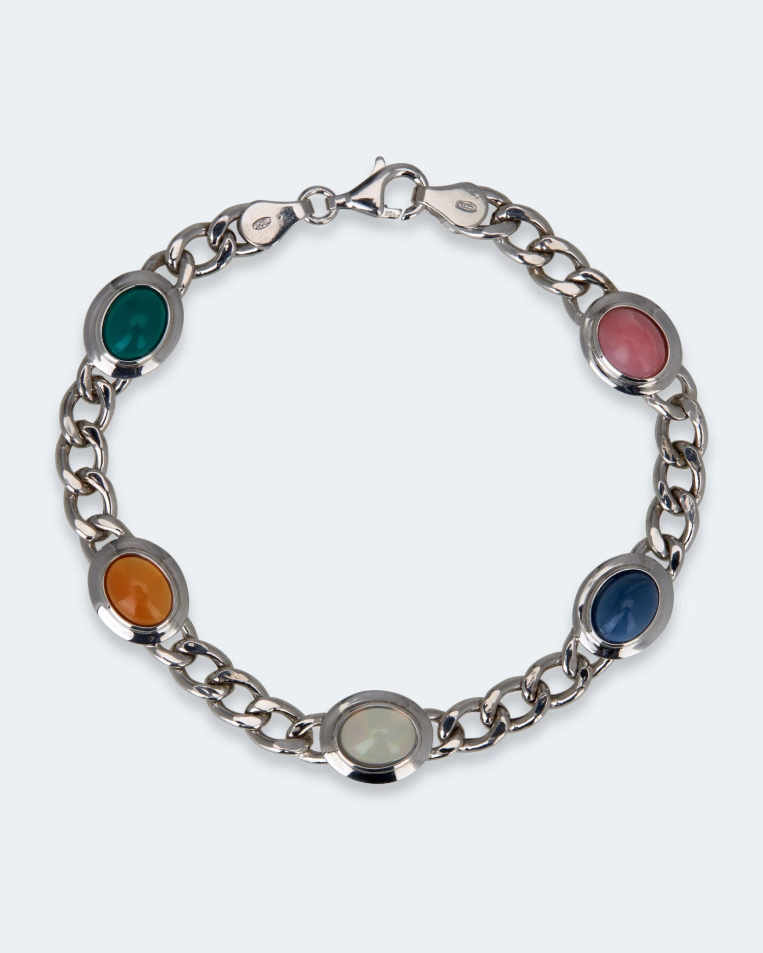 Seinen besonderen Zauber erhält das Armband durch fünf wunderschöne Opale in Rot, Blau, Grün, Pink und Weiß. Alle in ovaler Form und im Cabochon veredelt – so können sie ihr faszinierendes Opalisieren optimal entfalten. Bestellen Sie Ihr Silber-Armband wahlweise in warmer Gelb- oder kühl-eleganter Weißgoldoptik. Mit einem sicheren Karabinerverschluss. Wir versenden Ihr Armband in einem stilvollen Etui mit Zertifikat.