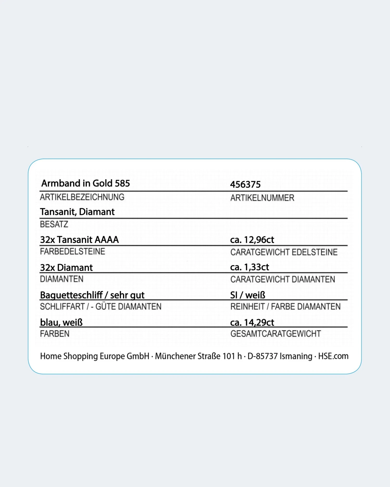 Strahlend schön und wertvoll: Das herrliche Armband aus 585er Gelbgold ist ein Schmuckstück der Superlative. Hochglanzpoliertes 585er Gelbgold trägt 32 Tansanite in AAAA-Qualität und 32 weiße Diamanten mit sehr gutem Baguetteschliff. Besonders bemerkenswert: Die ovalen Tansanite und die Diamanten in Baguetteform sitzen hochkant in ihren runden, massiv gearbeiteten Krappenfassungen. So kommt auf die Länge von ca. 19 cm die opulente Zahl von 64 Edelsteinen zustande. Das lebendige Funkeln dieser herrlichen Steine ist ein unwiderstehlicher Blickfang, ein Feuerwerk, das seinesgleichen sucht.
