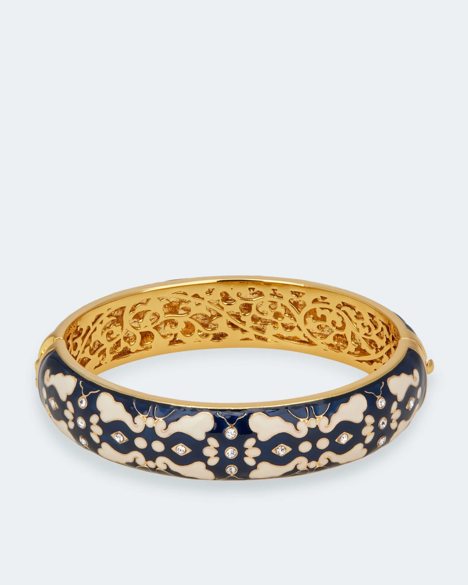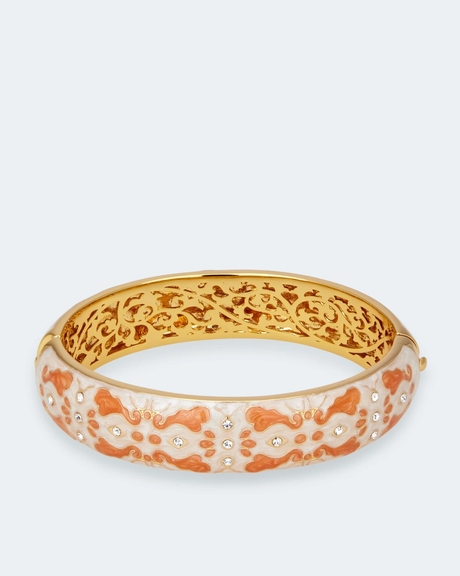 Der Armreif ist gelbvergoldet und hochglanzpoliert und wird mit einem Kastenschloss fixiert. Das Ornamentmuster ist wahlweise aus Farblack in Apricot und Weiß oder in Blau und Weiß gearbeitet. Wählen Sie die Variante, die Ihren Typ am besten unterstreicht.