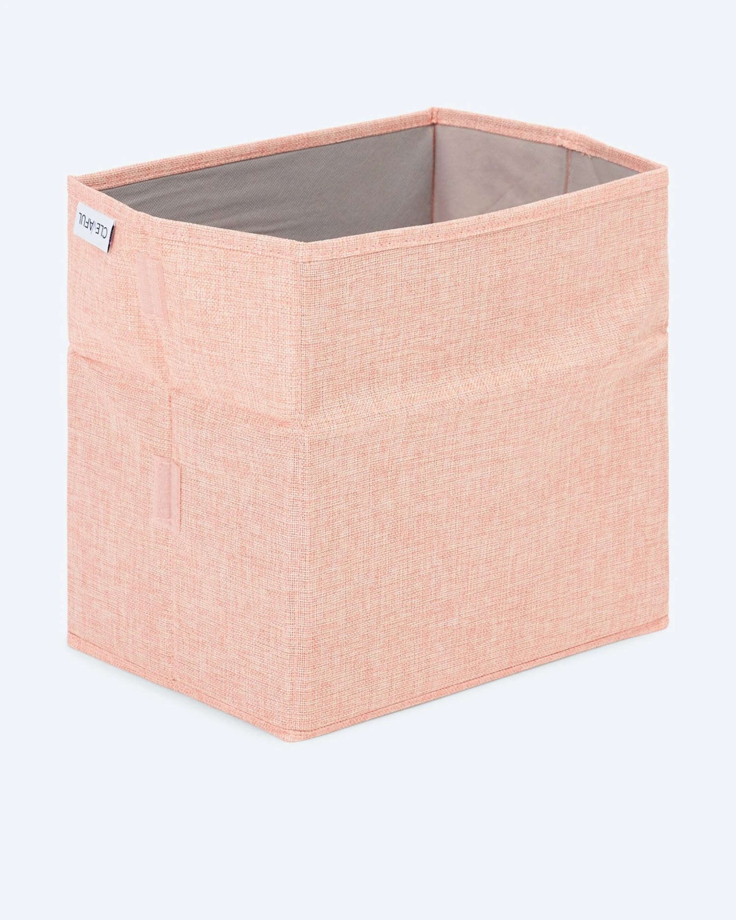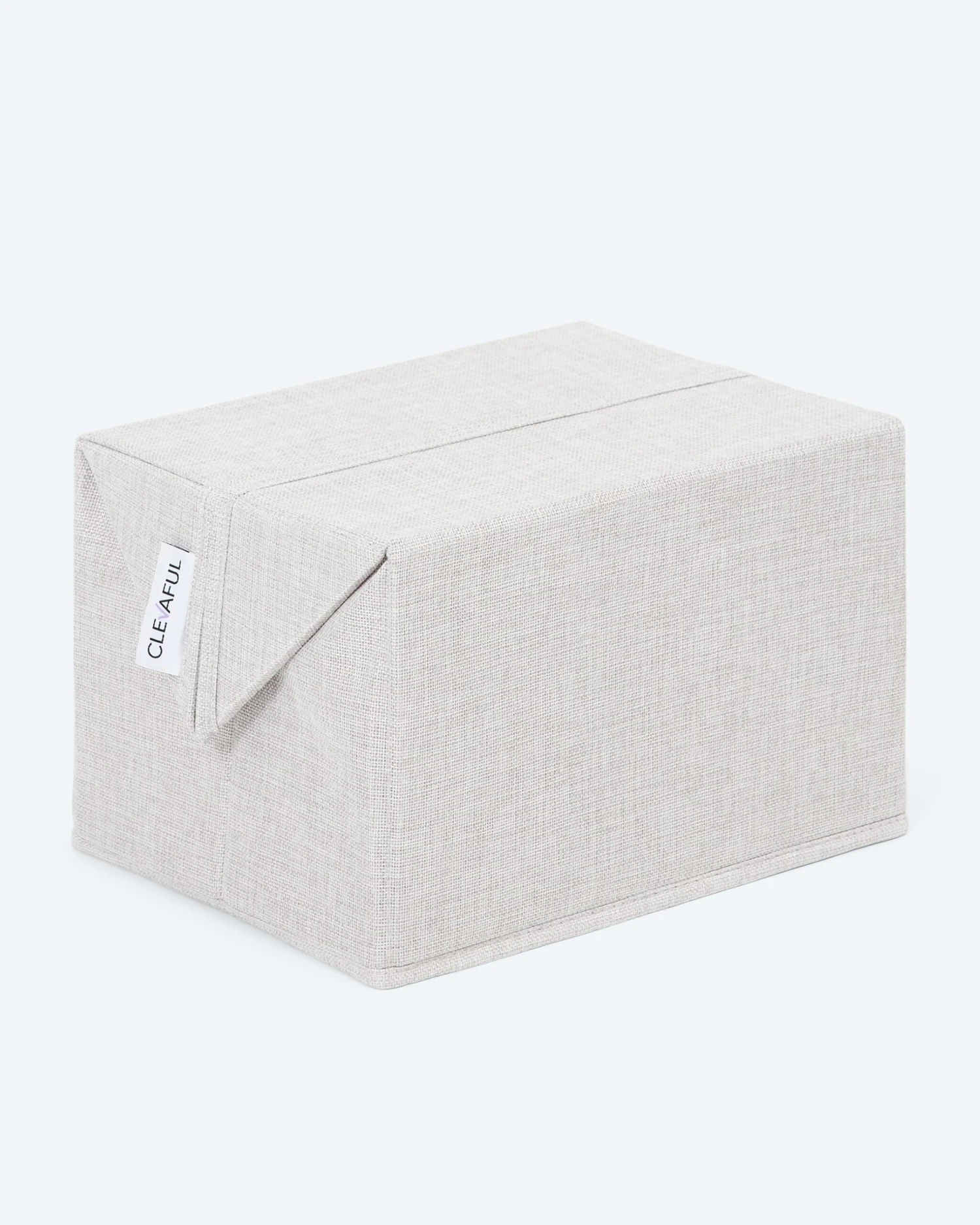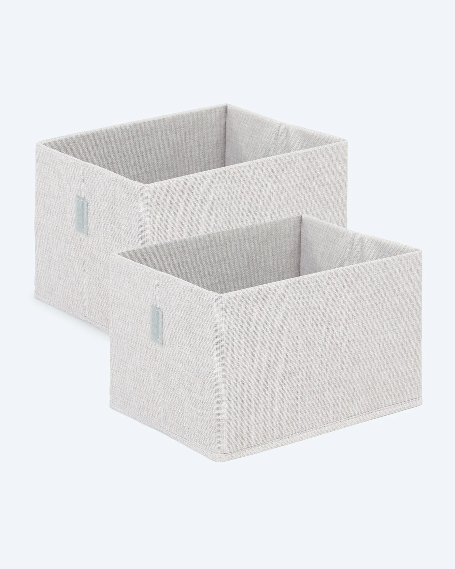 Hier erhalten Sie 2 clevere Aufbewahrungskartons in dekorativer Leinenoptik. Die machen sich gut im Regal und sorgen für Ordnung.