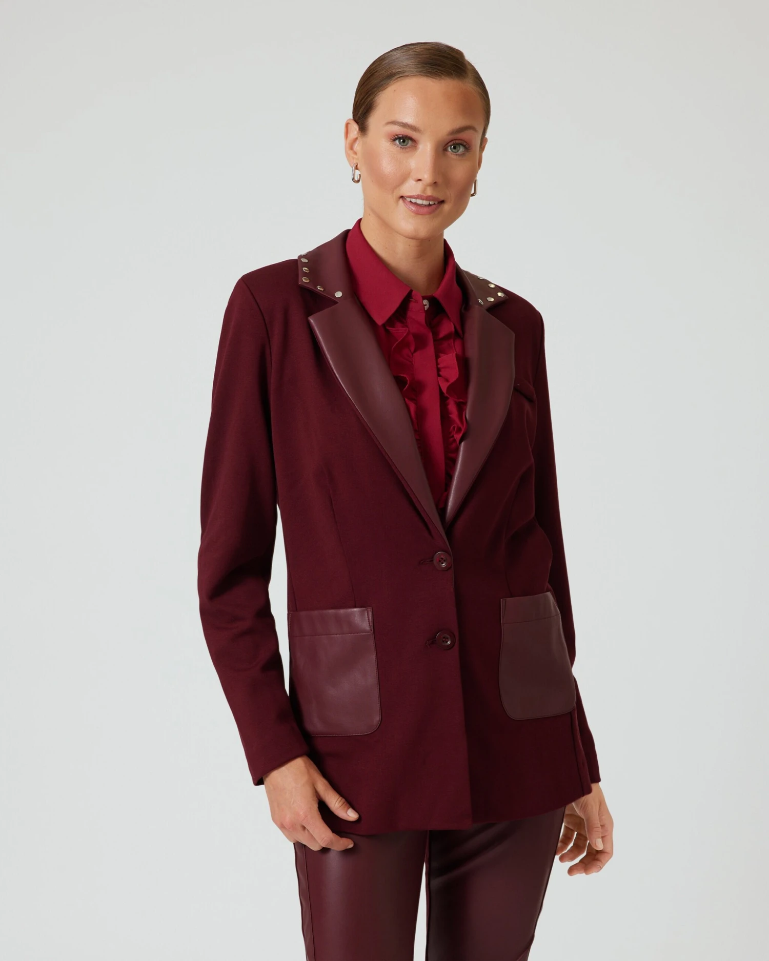 Der außergewöhnliche Designer-Blazer ist ein weiterer modischer Höhepunkt im Schaffen von Marcel Ostertag. Die In-Farbe Merlot – zum Teil in glamouröser Glanz-Optik – macht den Blazer in jeder Garderobe zum Favoriten. Zauberhaft ergänzt durch die glänzenden Nieten am Reverskragen. Die Schulterpolster und der taillierte Schnitt kreieren eine schöne feminine Silhouette. Tipp: Passende Hose unter Bestellnr. 460695.