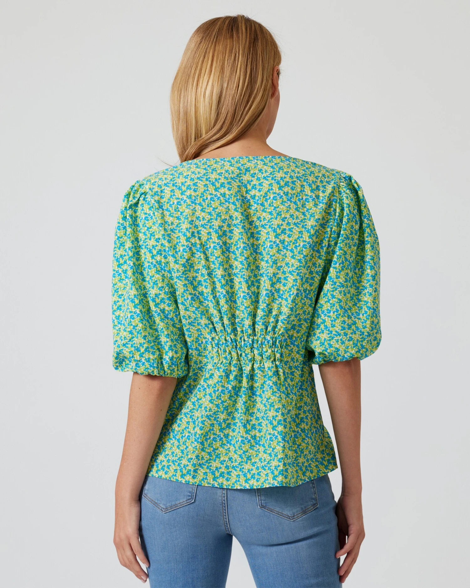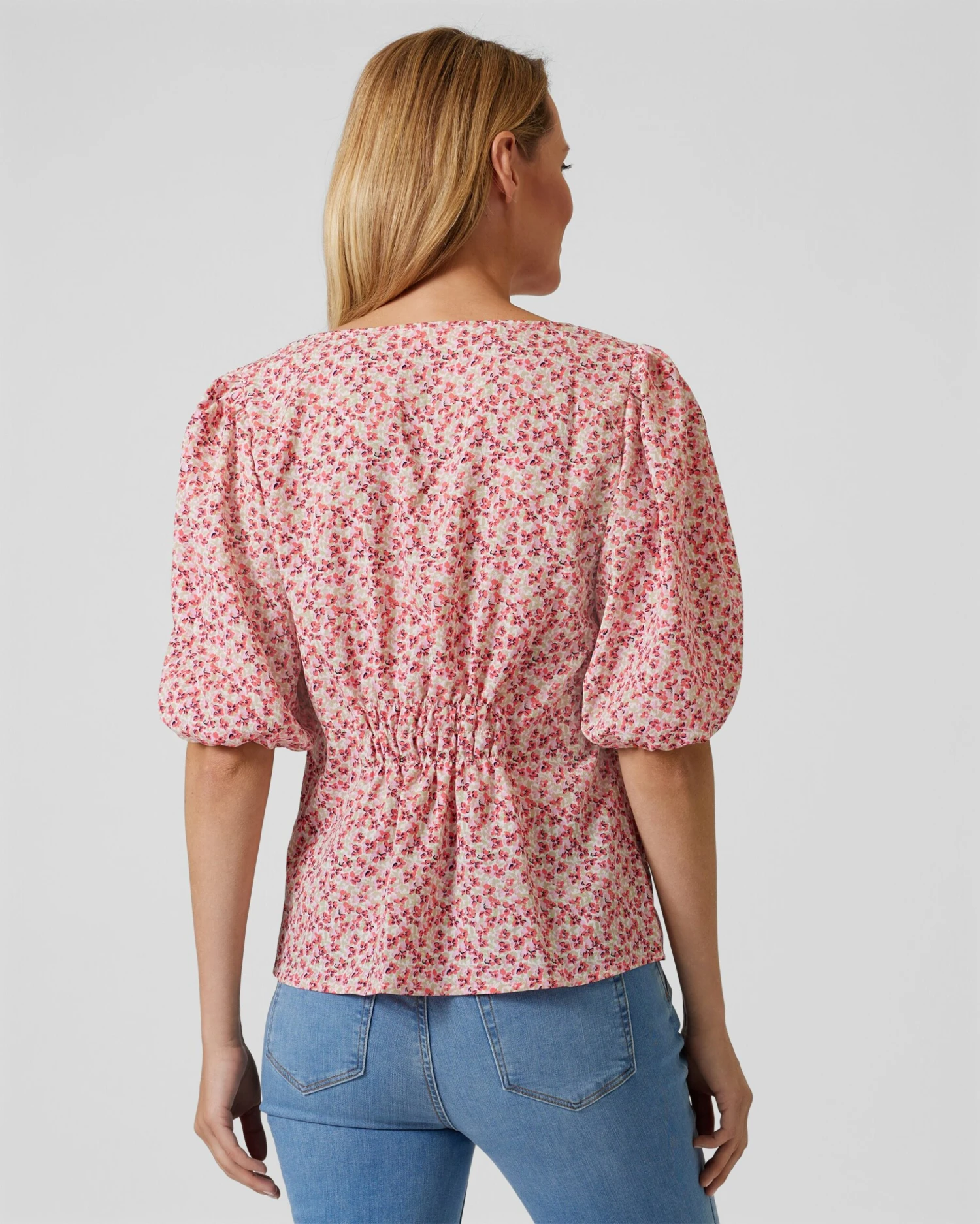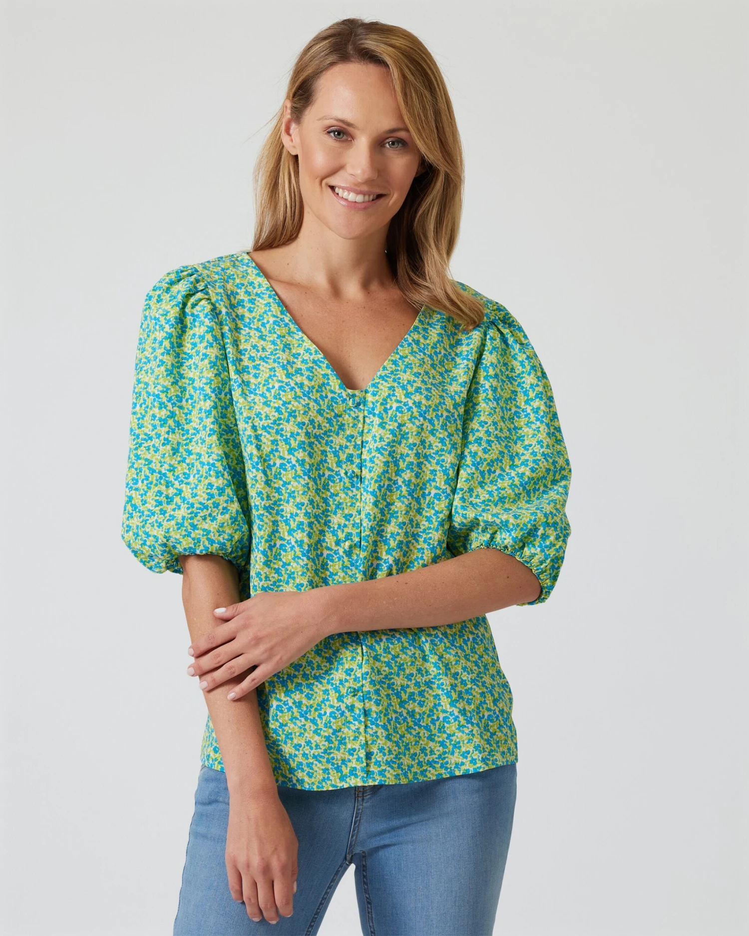 Die Bluse kommt mit einem weiten V-Ausschnitt zu Ihnen. Zusammen mit den weiten Ballonärmeln in halber Länge sorgt er für luftigen Chic und passt perfekt zu warmen Tagen.