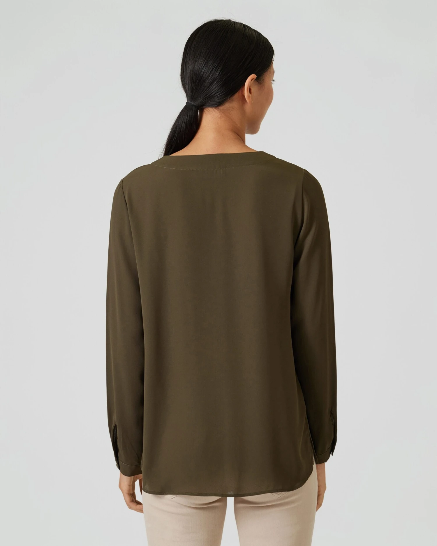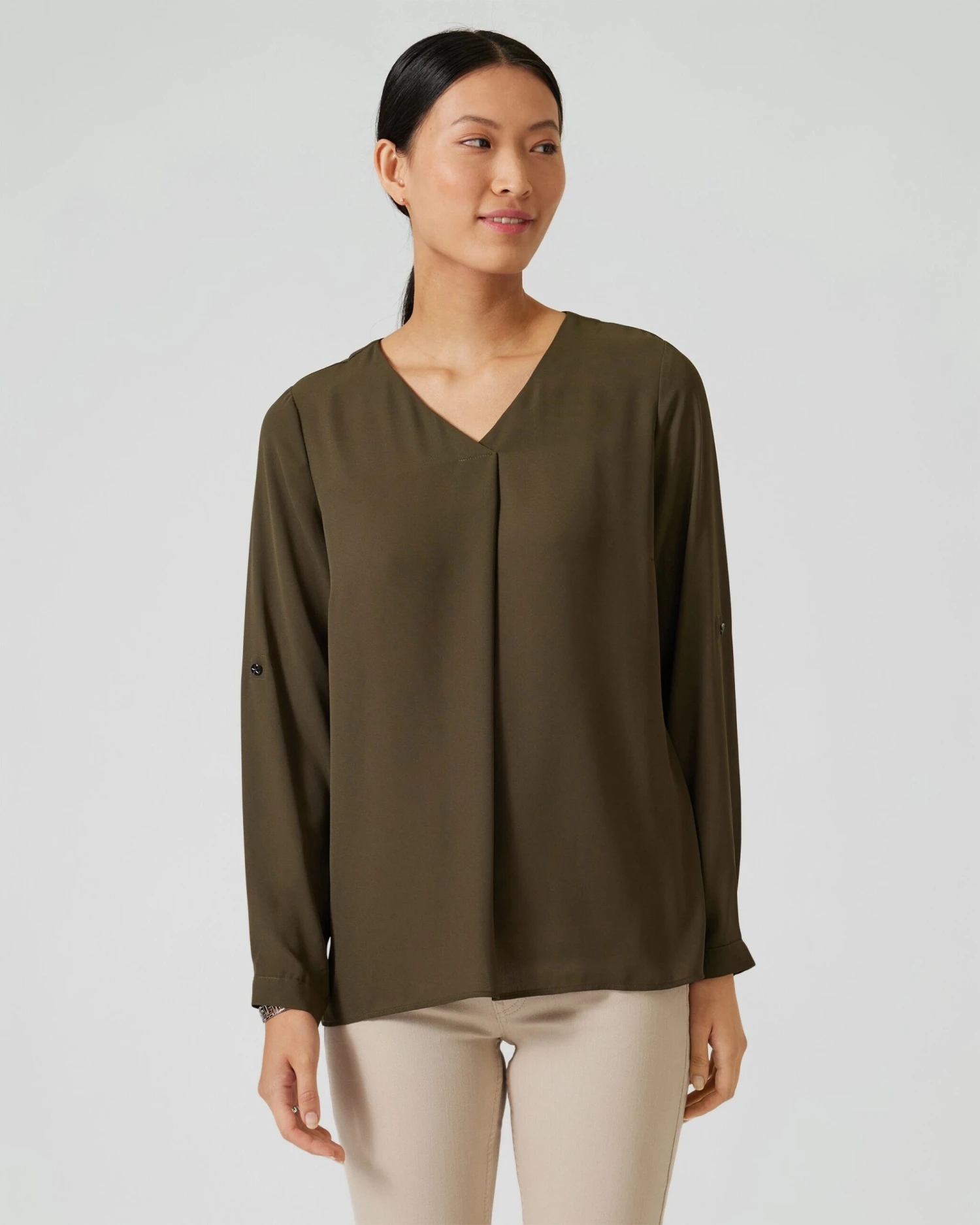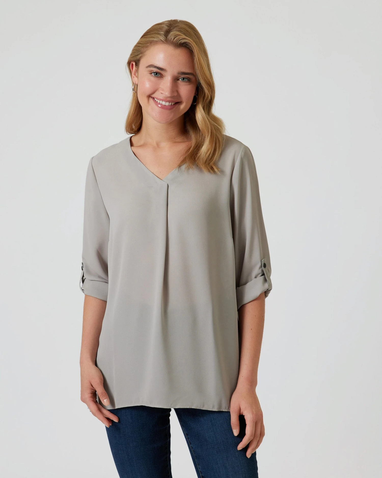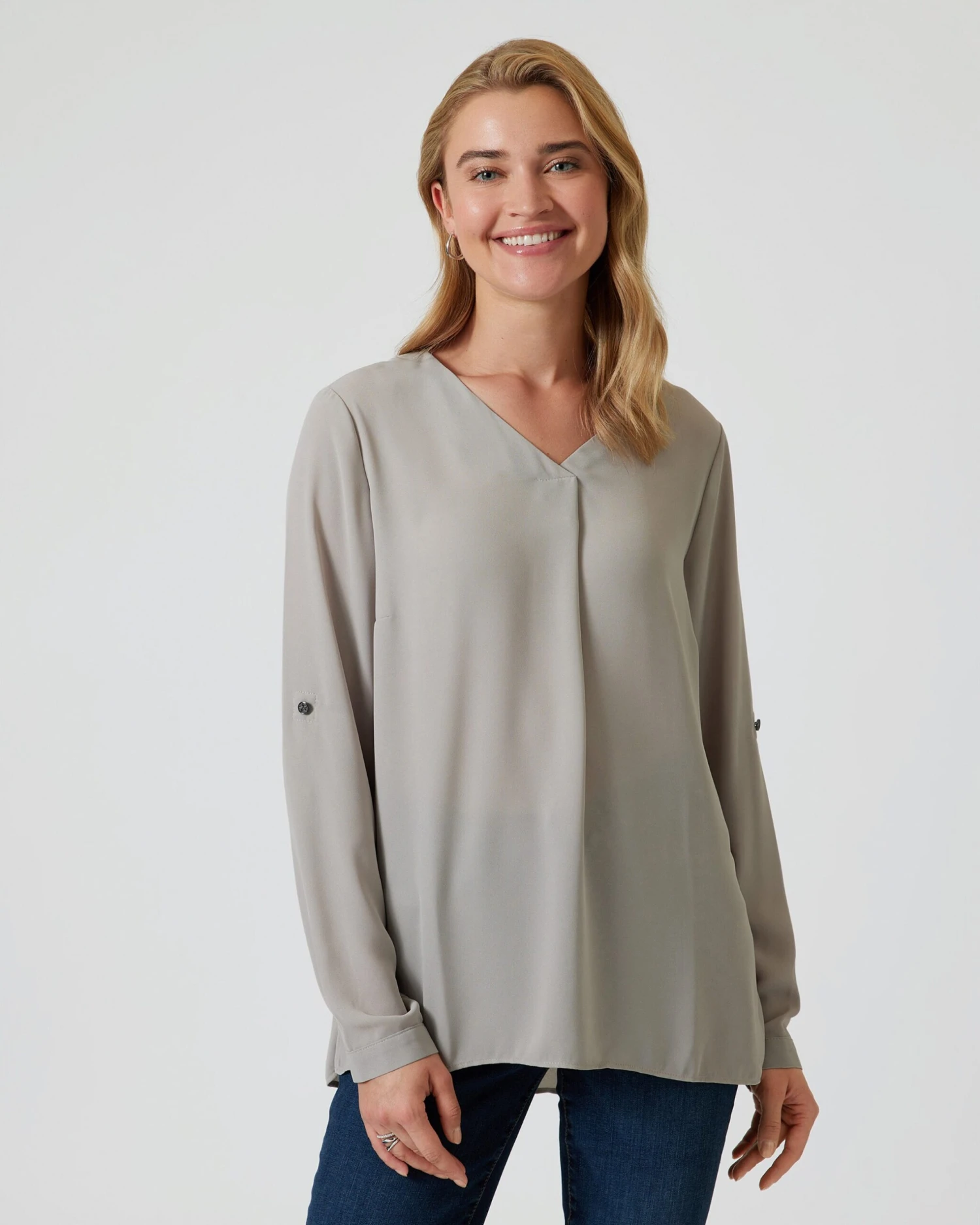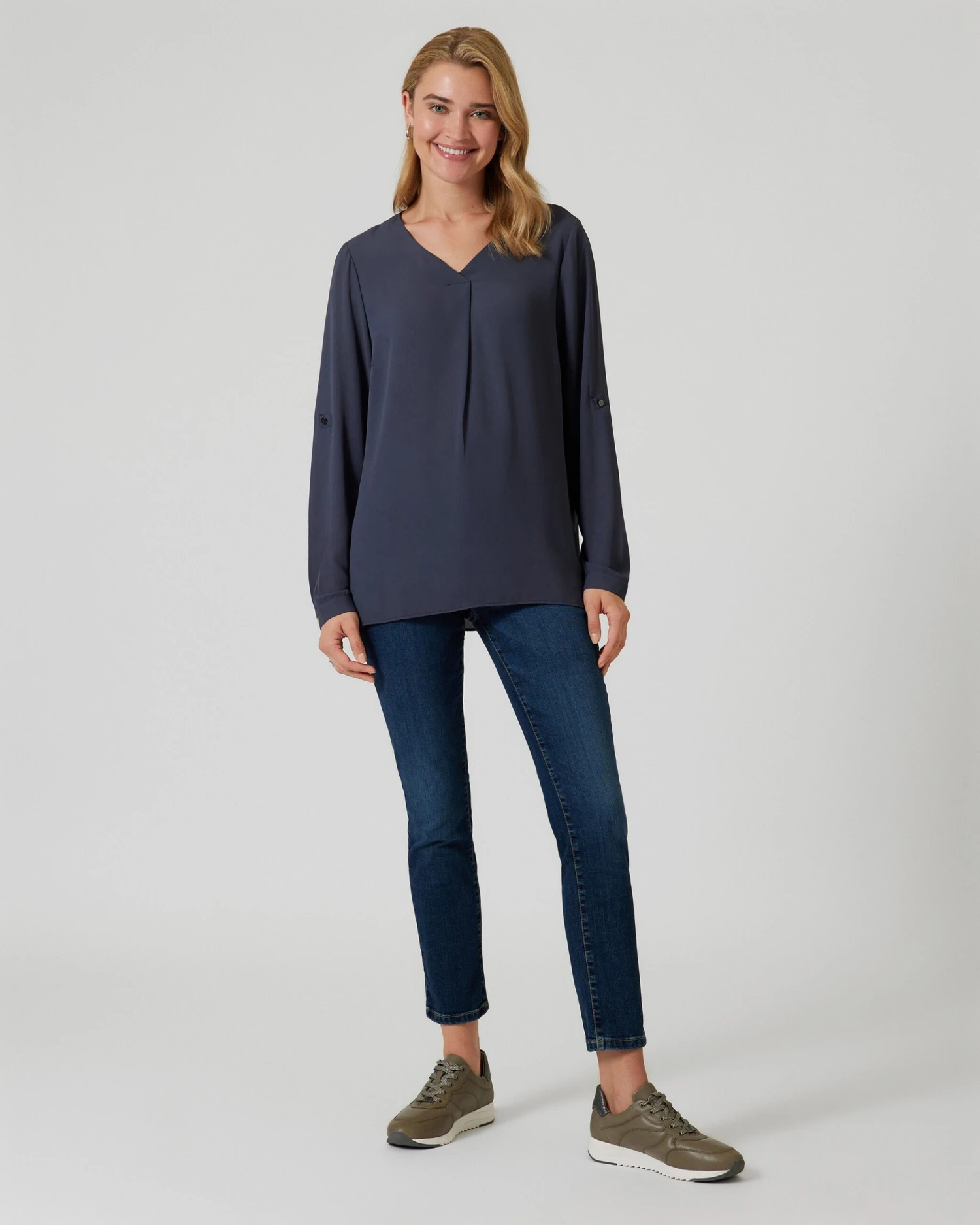 Die Bluse hat einen schönen V-Ausschnitt; darunter ist der Stoff in eine Falte gelegt. Das bedeutet für Sie etwas mehr Weite am Körper.