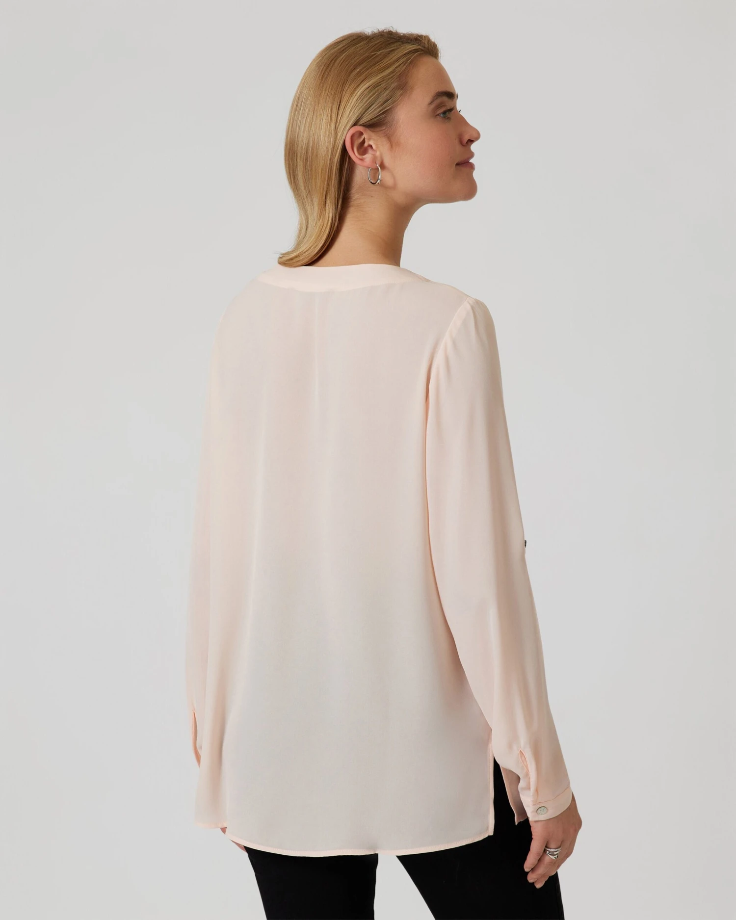 Lange Ärmel zum Krempeln und V-Ausschnitt mit Falte