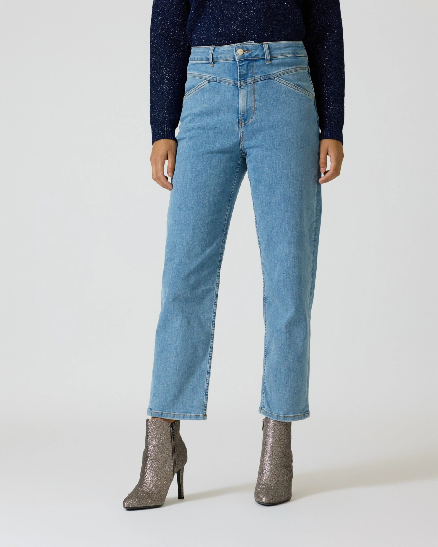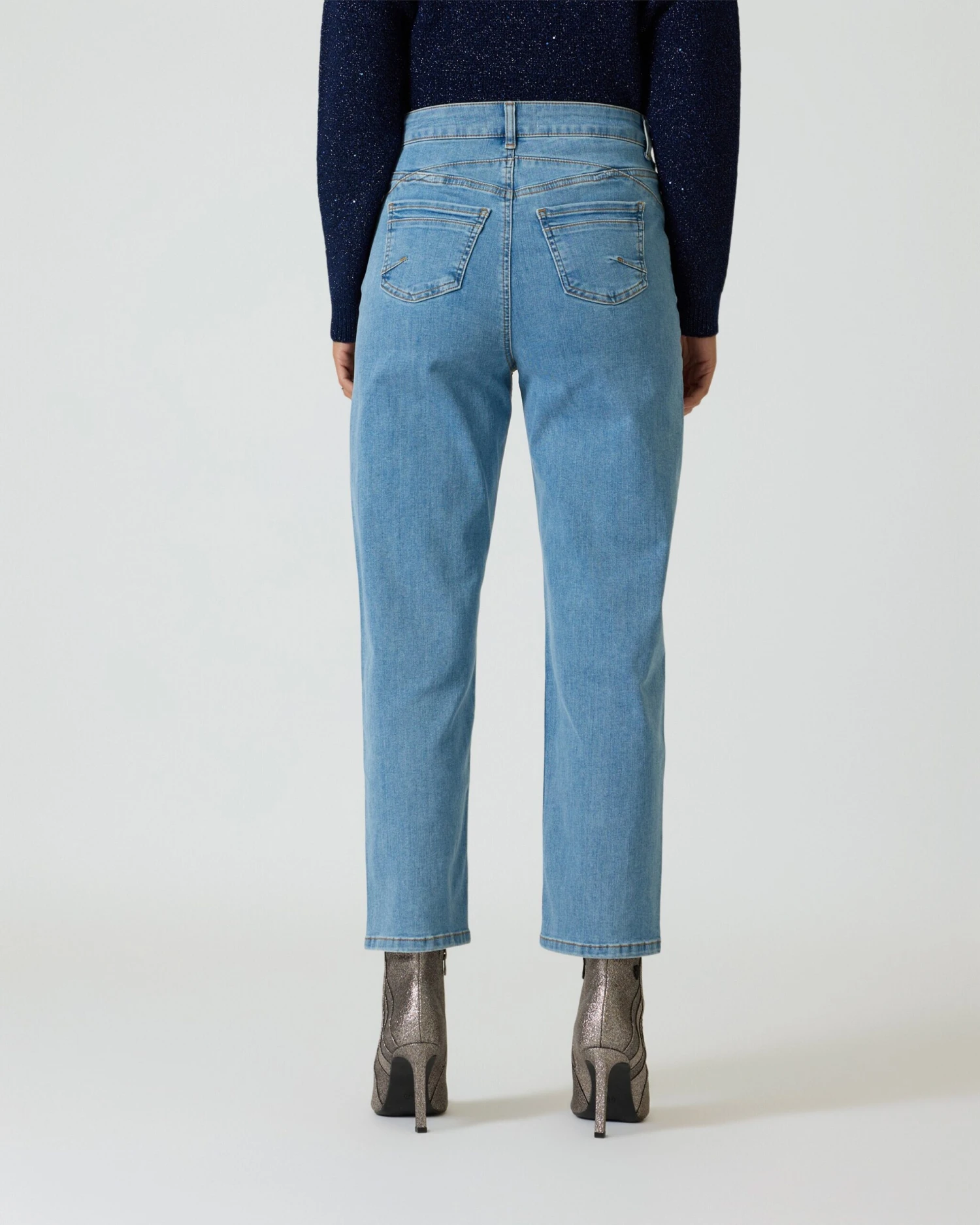 Boyfriend Jeans sind Damenhosen, die durch ihre weite Passform den Eindruck einer Männerhose machen. Sie haben einen lässig-weiten Schnitt, eine etwas tiefsitzendere Bundhöhe und zaubern eine schlanke Silhouette. Diese Jeans hier reicht bis unterhalb der Wade und wird mit Knopf und Reißverschluss verschlossen. Unterhalb des Bundes mit Gürtelschlaufen ist ein Sattel eingearbeitet, der eine super Figur formt. Seitliche Taschen und Gesäßtaschen machen das Design komplett. Freuen Sie sich auf eine tolle Jeans, die immer passt und jedes Abenteuer mitmacht.