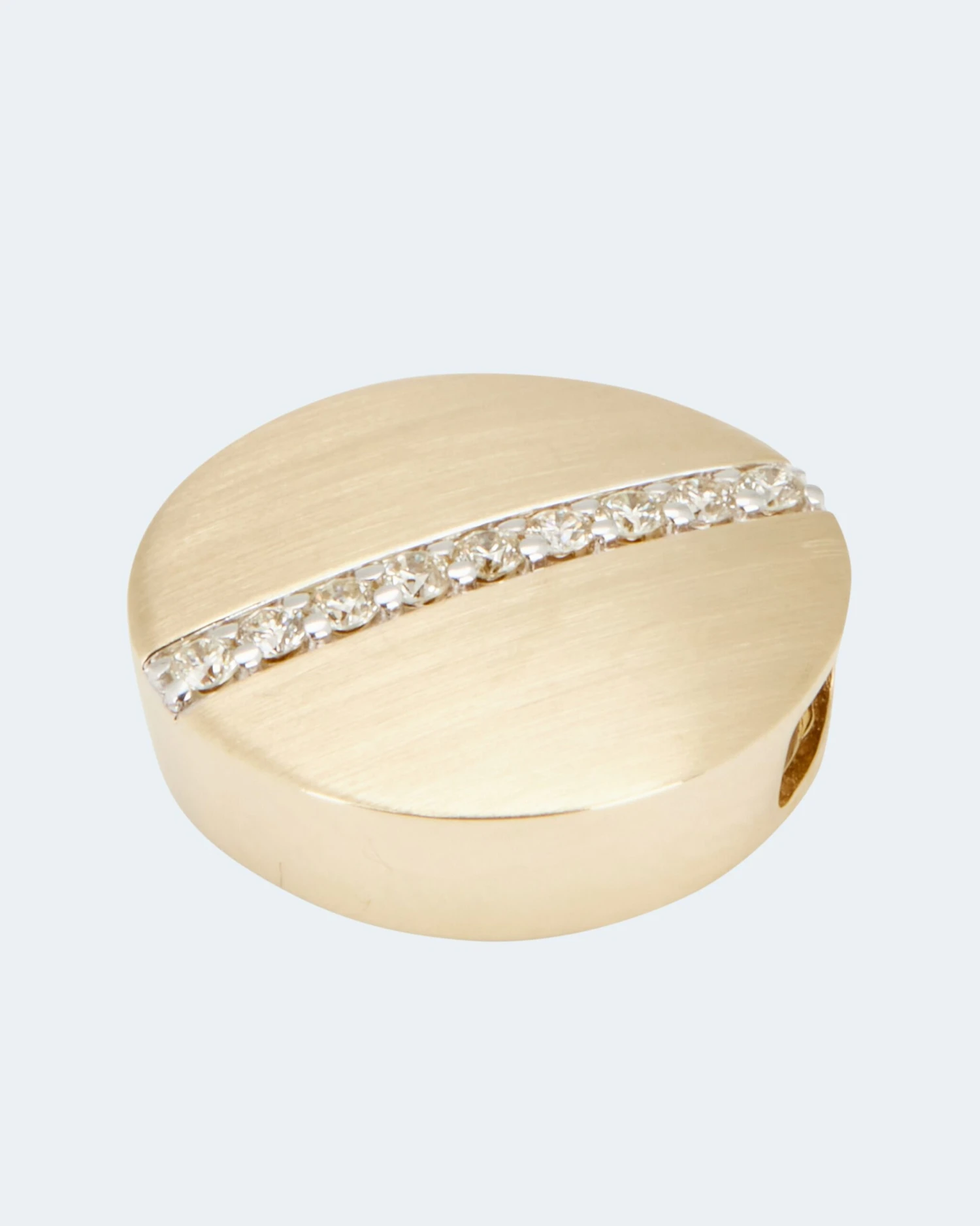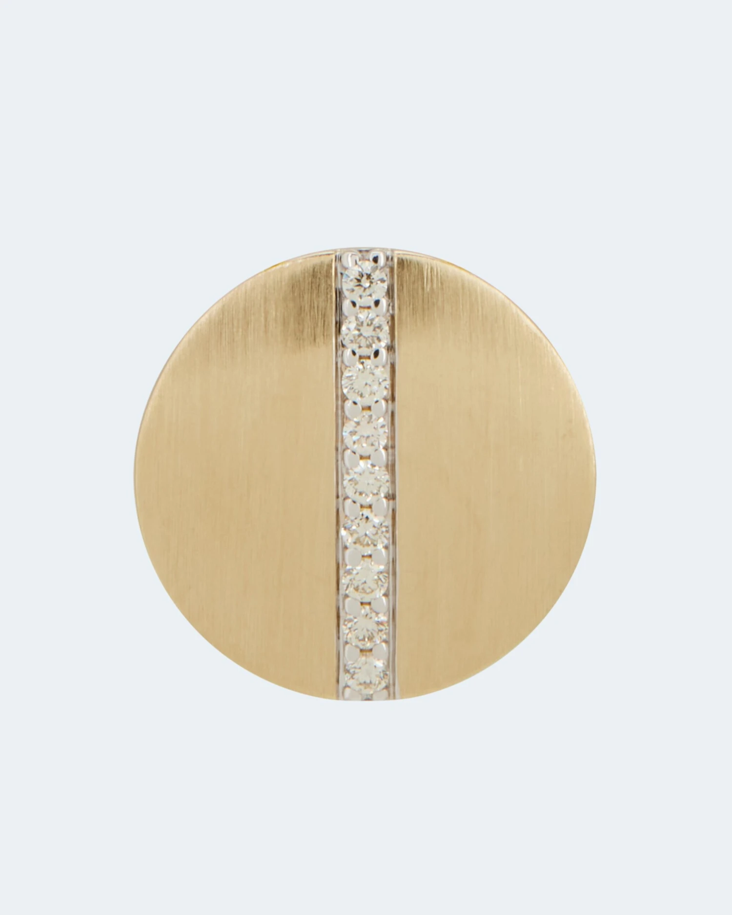 Dieser Anhänger in runder Form ist einzigartig. Wunderschön ist die schlicht-elegante, aber doch auffallende Gestaltung mit der vertikalen Brillantreihe, die den Anhänger optisch in zwei Hälften teilt. Die lupenreinen, gleich großen Brillanten in getöntem Weiß haben alle eine sehr gute Schliffqualität und sind klassisch im Pavé gefasst. Der Anhänger ist aus feinstem 585er Gelbgold geschmiedet und auf der Vorderseite edel mattiert, bzw. gebürstet. Seitlich und auf der Rückseite ist er hochglanzpoliert.