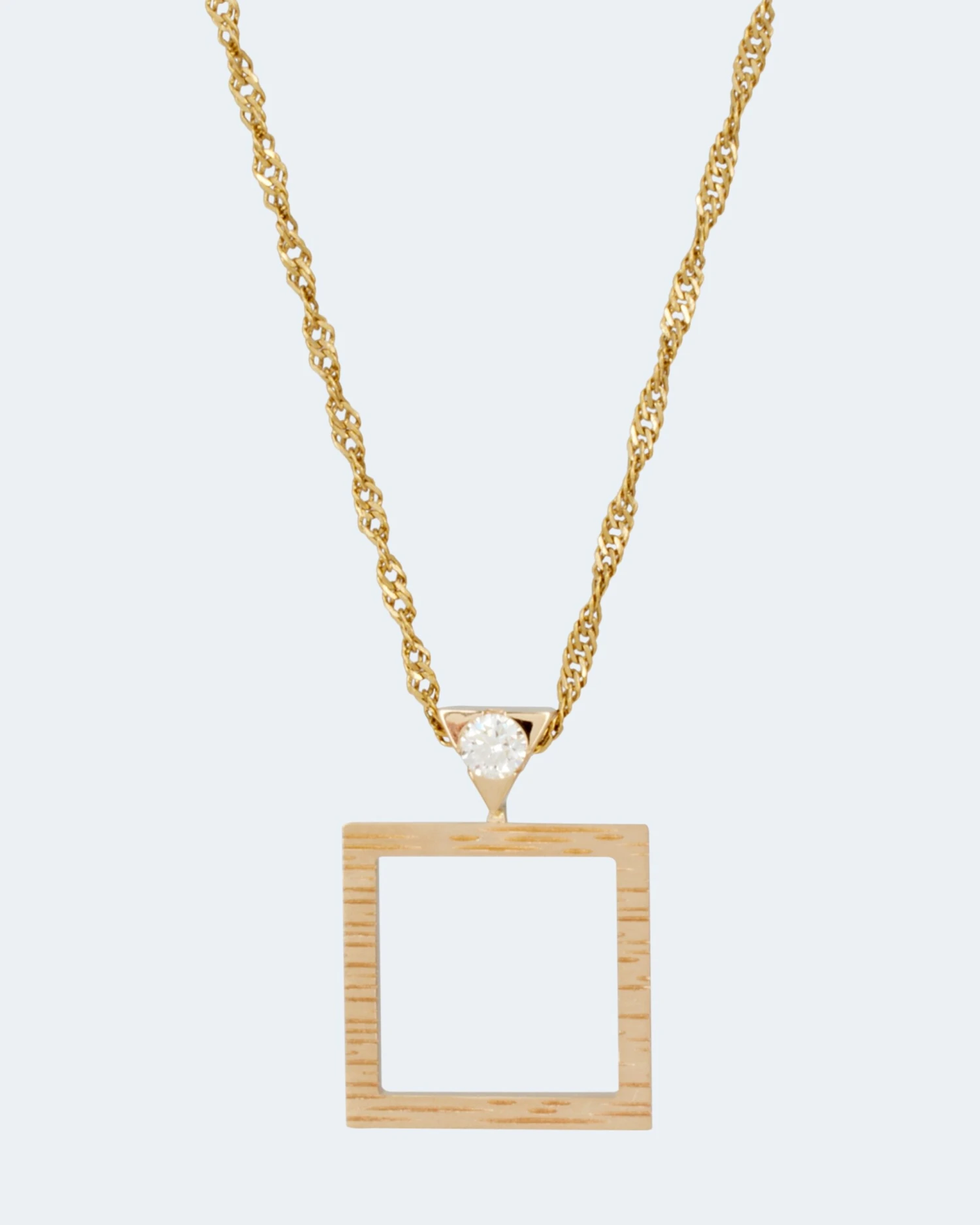 Dieses Schmuckstück vereint anspruchsvolles Design und zeitlose Eleganz auf höchstem Niveau. Das strukturierte 585er Gelbgold verleiht dem Anhänger eine einzigartige Textur und einen luxuriösen Glanz. Das Viereck-Design wirkt wie ein modernes Kunstwerk soller Luftigkeit. Der lupenreine Brillant, welcher die Anhängeröse ziert, fängt das Licht magisch ein und sorgt für einen funkelnden Akzent. Mit seiner hochwertigen Verarbeitung und dem edlen Material wird dieser Anhänger zu einem atemberaubenden Blickfang. Ob als Geschenk oder um sich selbst zu verwöhnen – sichern Sie sich jetzt unseren Anhänger und tragen Sie ein Stück puren Luxus bei sich!