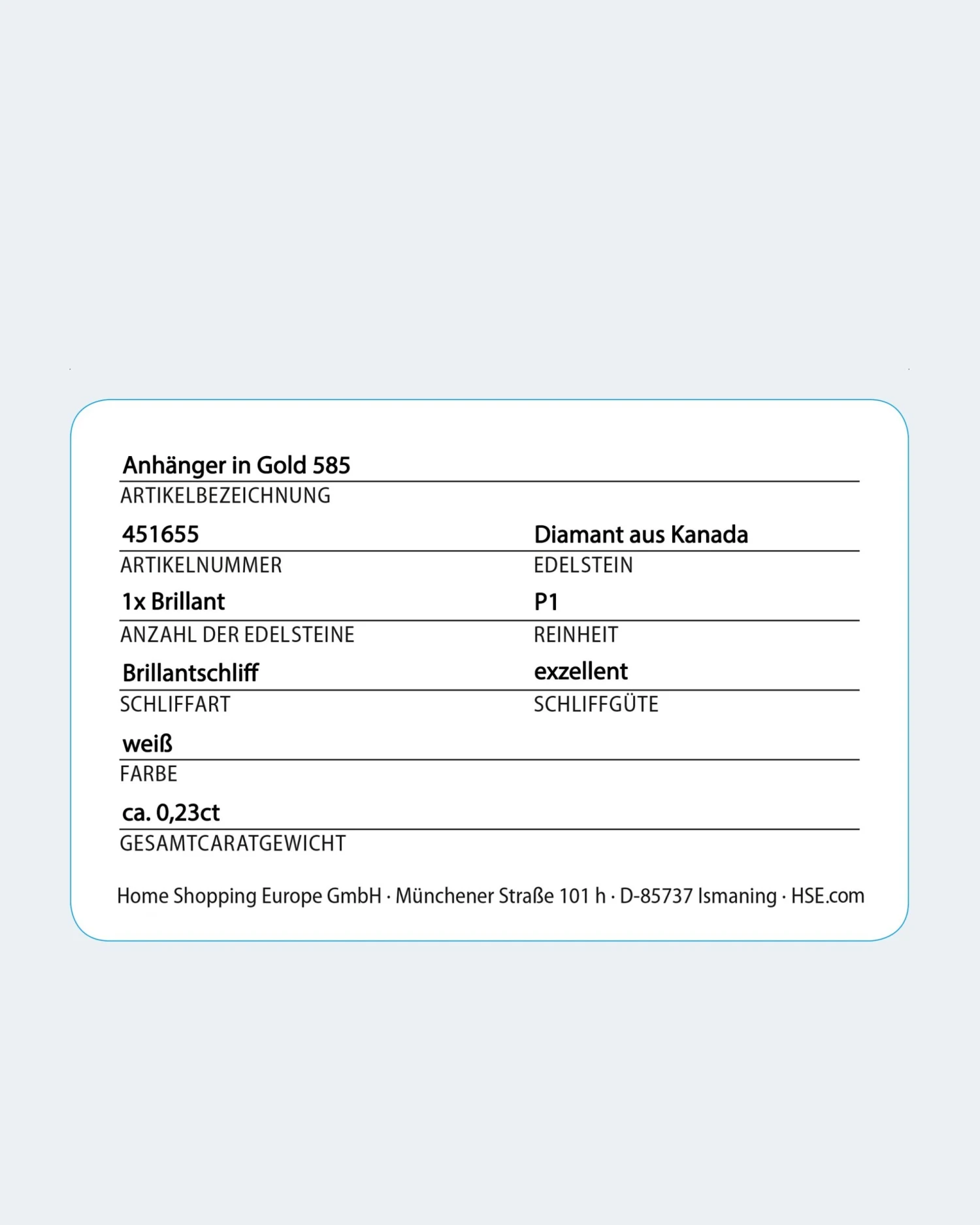 Sein schlicht-elegantes Solitär-Design macht diesen Anhänger aus hochglanzpoliertem 585er Gelb- oder Weißgold zu einem unwiderstehlichen Eyecatcher. Der eingesetzte Brillant ist eines der raren Exemplare aus kanadischer Förderung. Der Stein mit exzellentem Schliff in der Reinheit P1 sitzt in einer Spannfassung. Dadurch scheint er inmitten des Anhängers zu schweben. Und dank des Brillantschliffs funkelt er spektakulär und bringt Ihre Augen zum Leuchten.