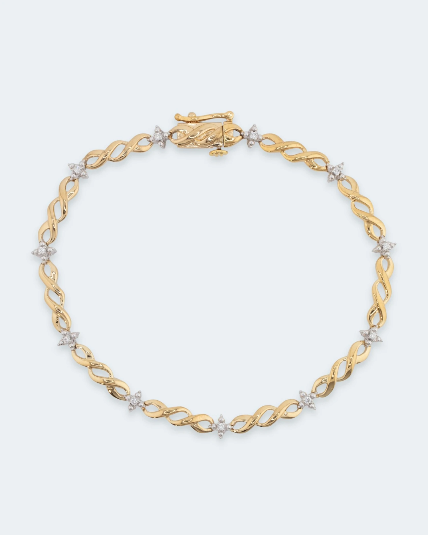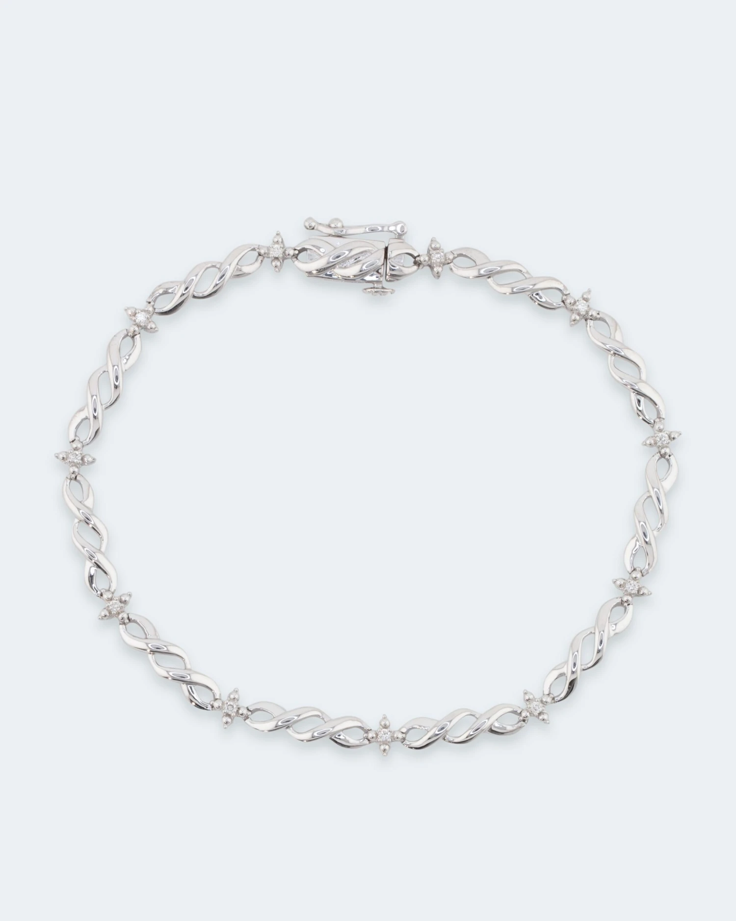 Das Armband besteht aus geschwungenen Kettenelementen, zwischen denen in regelmäßigen Abständen 11 Brillanten ihr Strahlen und ihren Glanz verströmen. So entsteht ein Design, das die Blicke schon von Weitem anzieht.