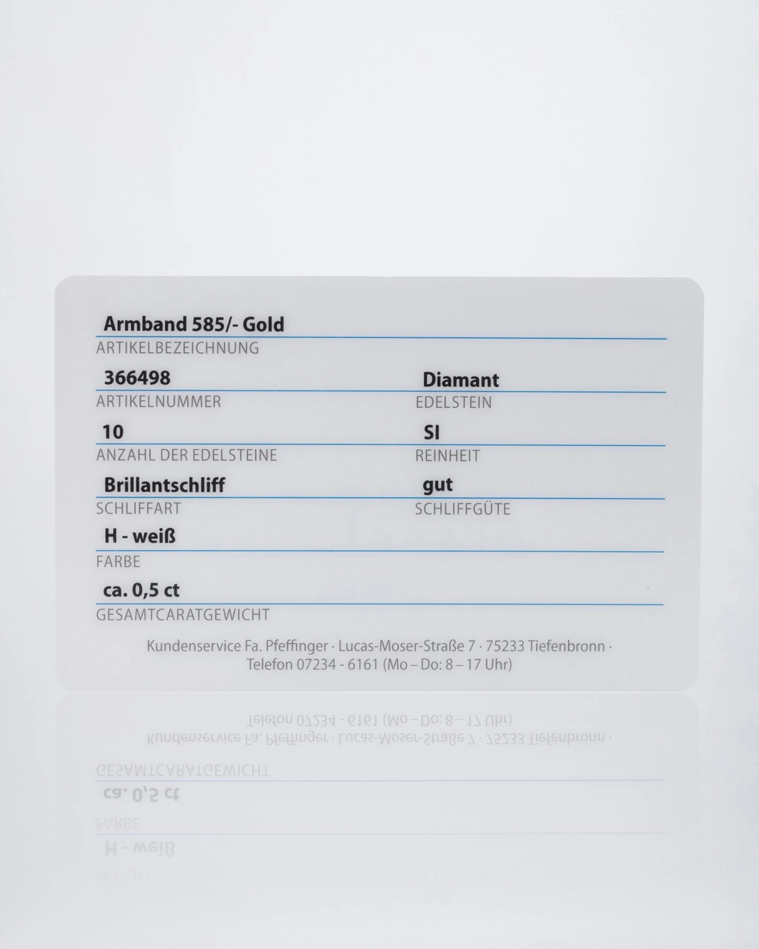 Beim Anblick dieses Armbands aus der Linie „Pfeffinger Brillanten“ schlägt Ihr Herz höher? Kein Wunder, das Accessoire aus hochglanzpoliertem 585er Gold zur Wahl ist bezaubernd. Sie erhalten das Armband in Weißgold, Gelbgold oder Bicolor. Es ist mit zehn Brillanten in Zargenfassungen ausstaffiert. Die runden weißen Edelsteine sind im Brillantschliff mit 56 Facetten und einer Tafel veredelt. Ihre Schliffgüte ist gut. Die Brillanten sind von allererster Güte und verfügen über die Reinheit SI.