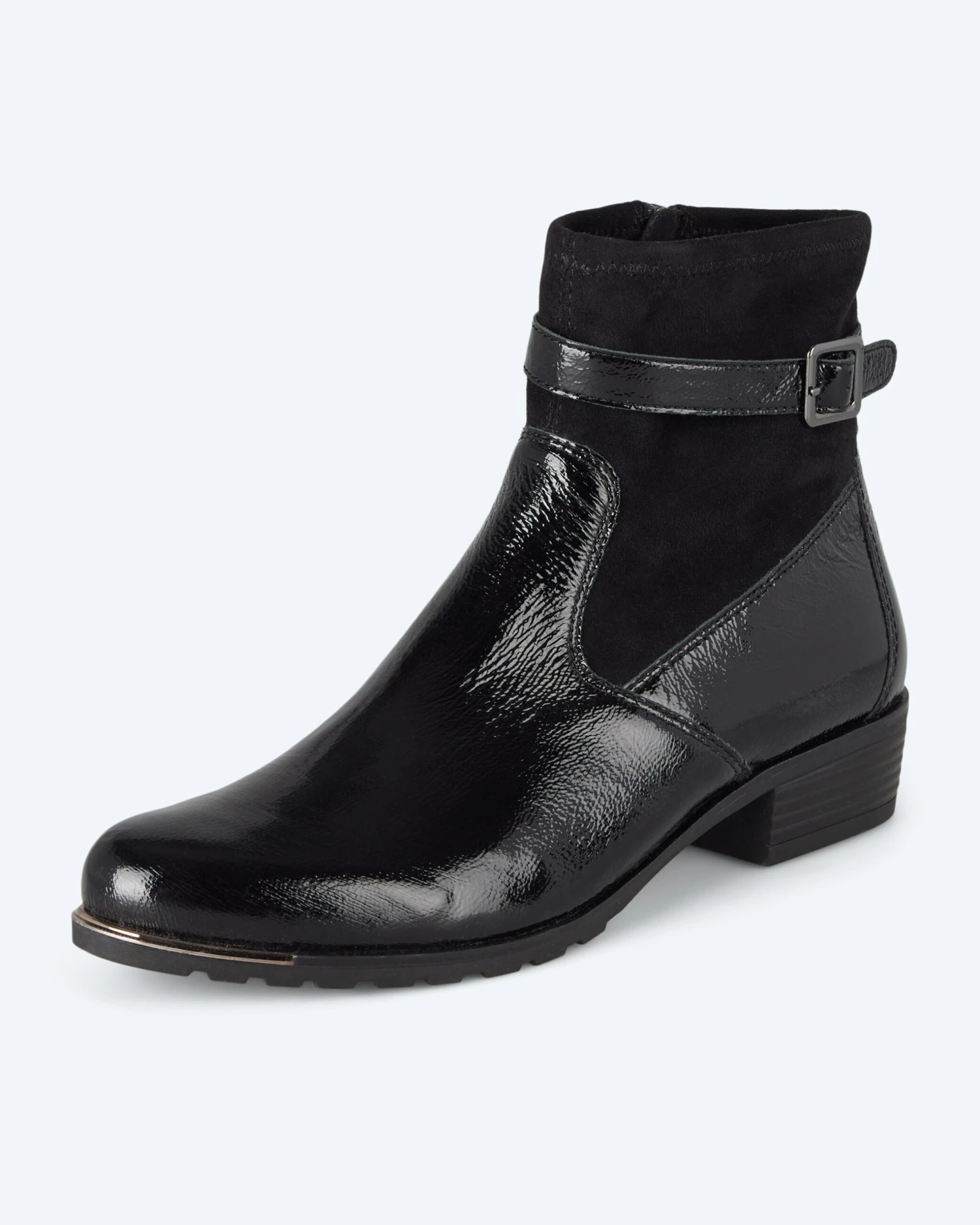 Entdecken Sie den perfekten Begleiter für stilvolle Auftritte: Diese Damen Boots vereinen Eleganz, Komfort und Individualität auf einzigartige Weise und werden Ihr Outfit gekonnt abrunden. Der Materialmix aus Leder und Stretchmaterial verleiht den Boots eine moderne Optik und sorgt gleichzeitig für einen angenehmen Tragekomfort. Das hochwertige Leder ist langlebig, während das Stretchmaterial für Flexibilität und Bewegungsfreiheit sorgt. Die dezente Metallapplikation an der Spitze setzt einen subtilen Akzent. Der Ledergürtel am Schaft sorgt für die individuelle Note. Ein kleiner Blockabsatz sorgt für einen sicheren Stand und rundet das elegante Design ab. Der Innenreißverschluss ermöglicht ein bequemes An- und Ausziehen, während die On Air Laufsohle Dämpfung und Stabilität bei jedem Schritt bietet.