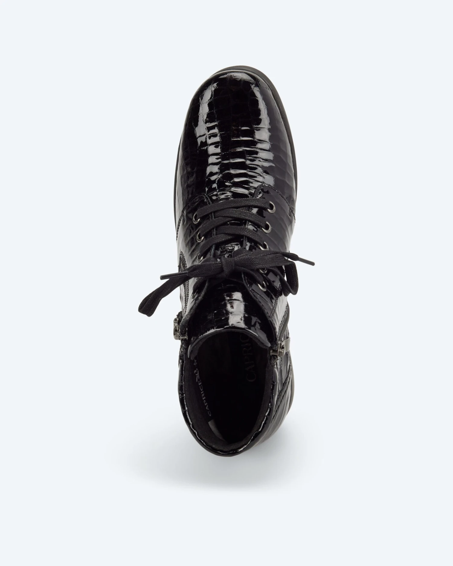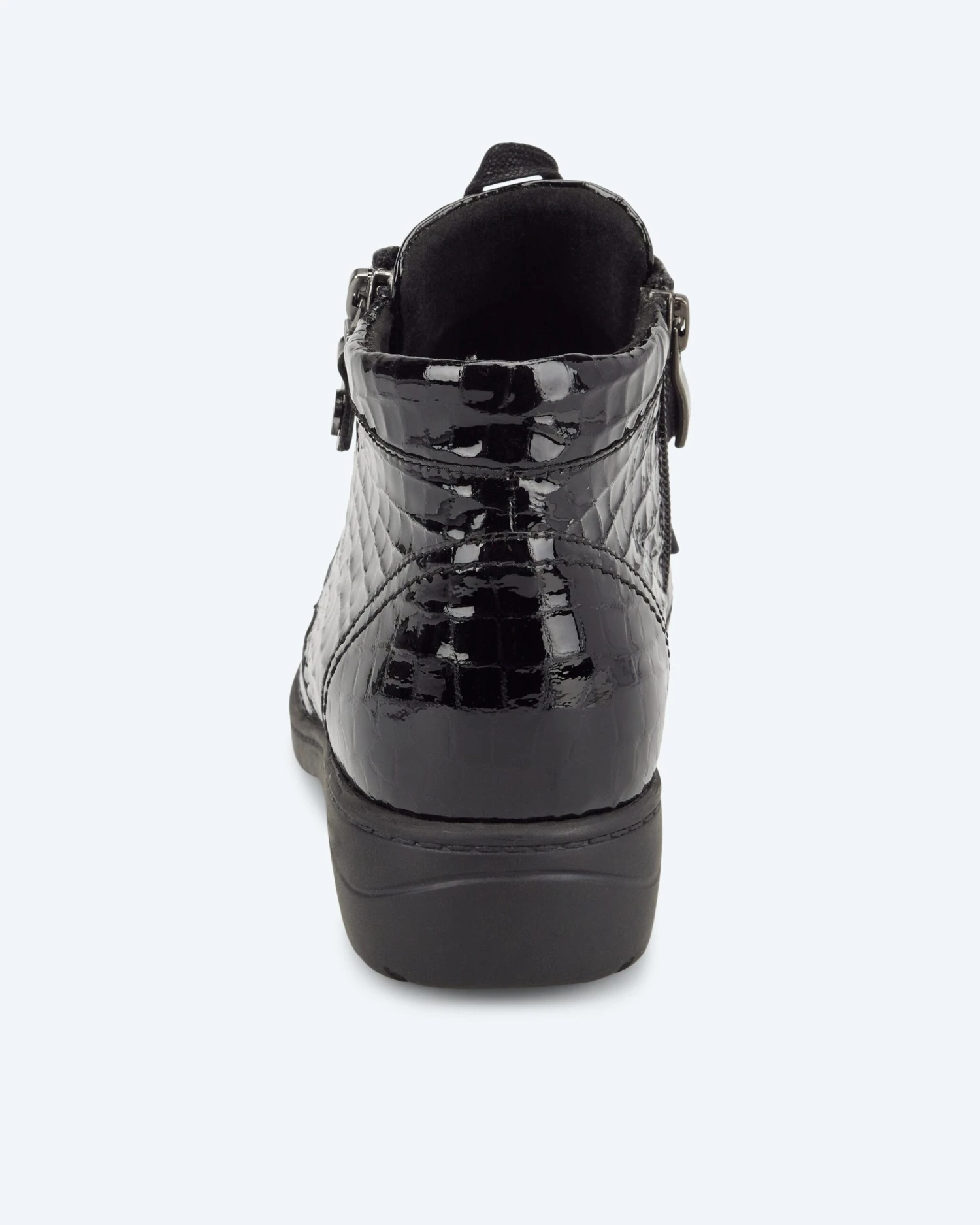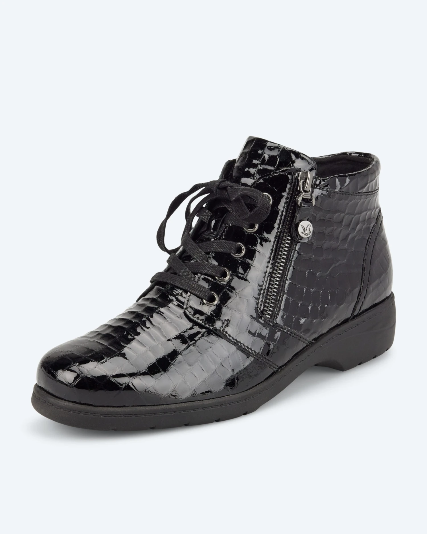 Dieser stilvolle Boot ist ein edler Begleiter, der Ihr Outfit im Handumdrehen aufwertet: Die Oberfläche glänzt durch die hochwertige Lackleder-Optik, raffiniert ergänzt durch eine feine Kroko-Struktur. Ein echtes Mode-Highlight, das auch in Ihrem Kleiderschrank nicht fehlen sollte.