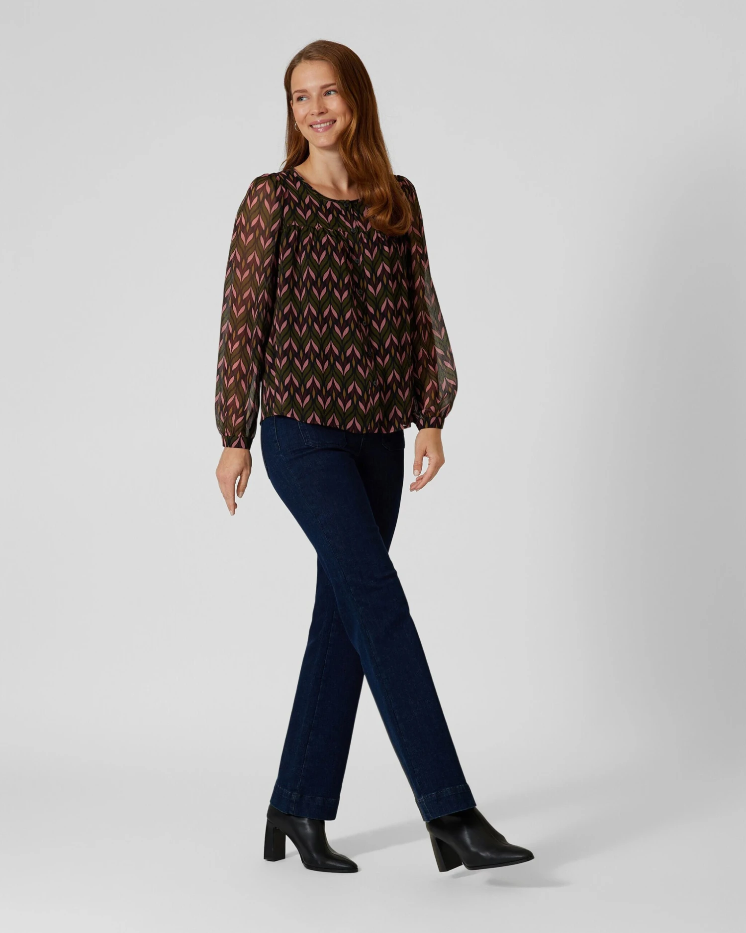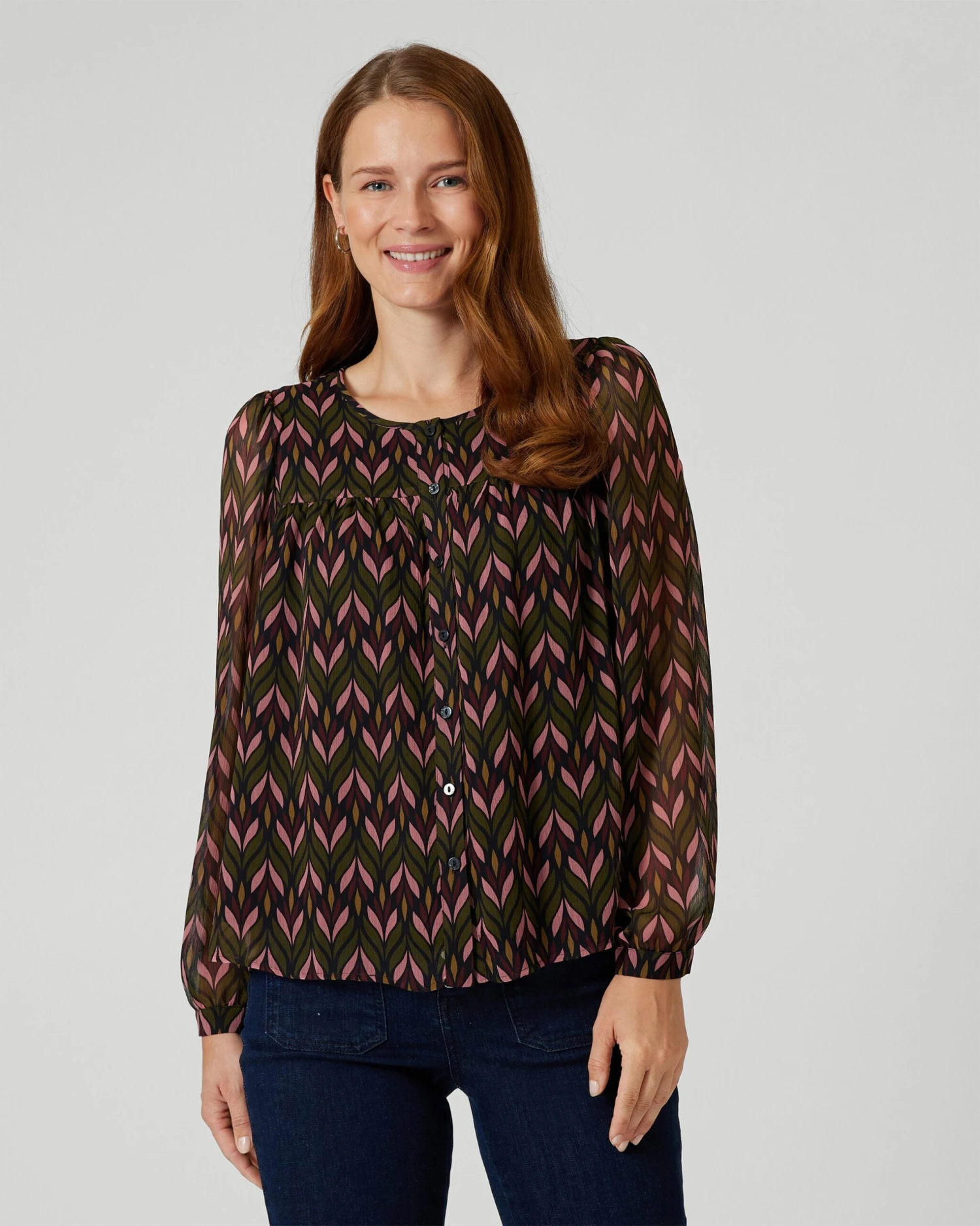 Sehr elegant ist das fantasievolle Grafikmuster, mit dem das Obermaterial aus Chiffon allover bedruckt ist. Das Chiffon ist leicht transparent, daher ist die Bluse mit einem trageangenehmen Viskosefutter gearbeitet.