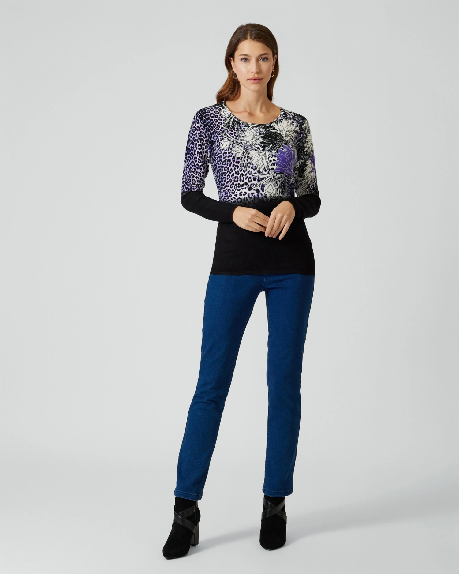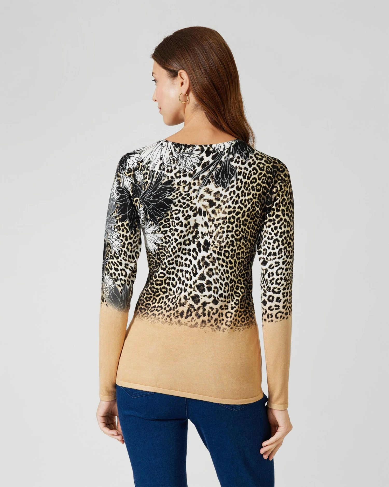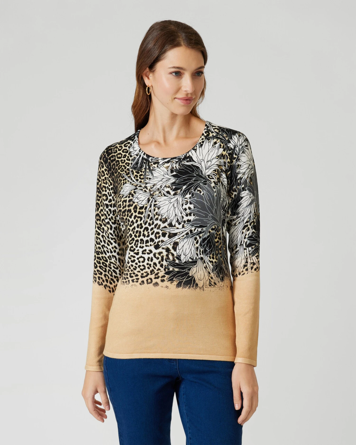 Dieser wunderschöne Pullover ist genau das Richtige für ein Daily-Outfit mit elegantem Touch. Das Design besticht durch den kunstvollen Print mit Animal- und Blütenelementen, welches im oberen Teil zu sehen ist. Das untere Drittel ist unifarben und macht den Pulli zu einem optischen Figurschmeichler!