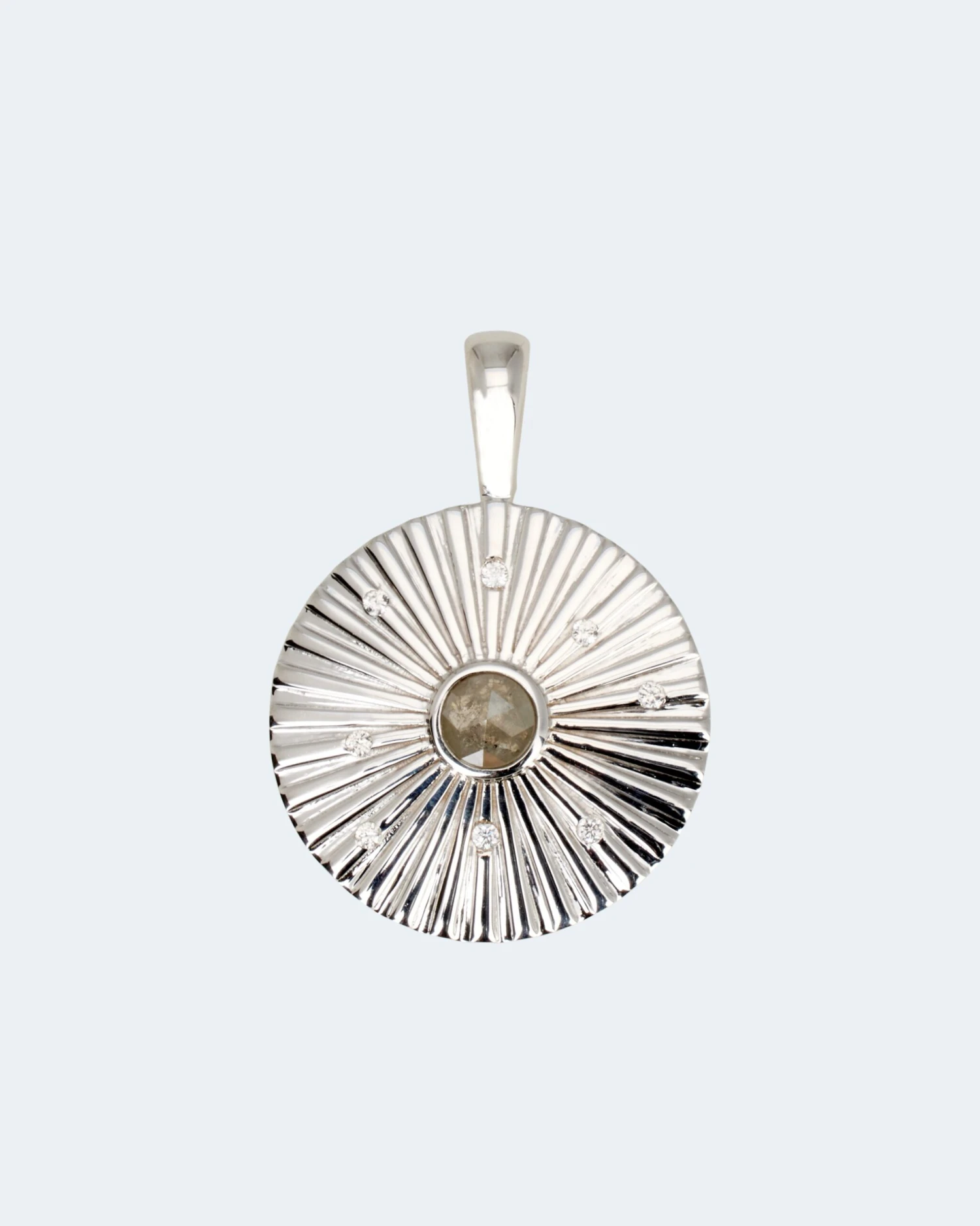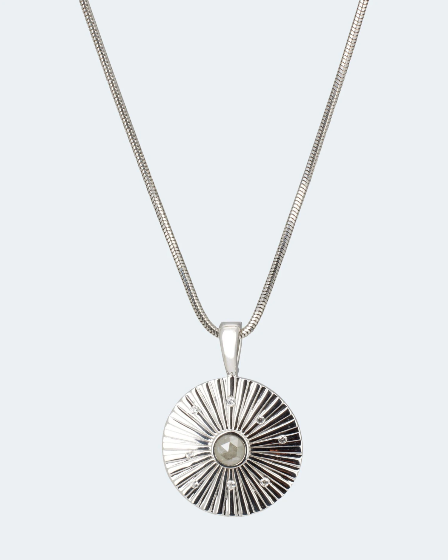 Der detailverliebt gestaltete Silberanhänger erinnert an eine DVD: Federleicht und filigran wirkt das fein strukturierte Design in runder Scheibenform – und lädt in Ihrem Dekolleté zum Hingucken ein. Im Zentrum thront ein platingrauer Diamant im seltenen Rosenschliff, sicher in eine Zarge gefasst. Rund um den Mittelstein sind außerdem acht weiße Zirkone in die Oberfläche eingerieben. Dank der praktischen Clipöse baumelt der Anhänger mit nur einem Handgriff an seiner Kette – ohne umständlich herumzufummeln.