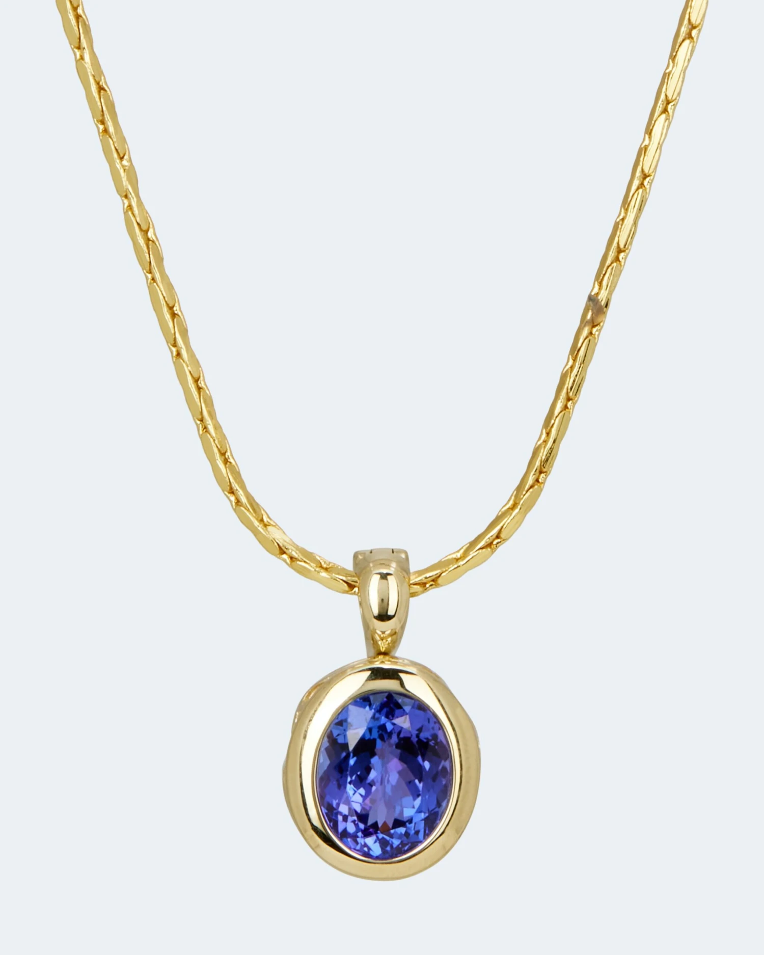 Das Herzstück dieses Anhängers ist ein großer und wunderschön geschliffener Tansanit in ovaler Form. Sein intensiv leuchtendes Blau in feinster AAAA-Farbqualität ist ein hinreißender Blickmagnet in Ihrem Dekolleté. Unterhalb der Zargenfassung ist das glänzende 585er Gelbgold aufwendig durchbrochen gearbeitet. Sichern Sie sich diese Schmuck-Rarität, deren zeitlose Extraklasse Sie noch in vielen Jahren begeistern wird.