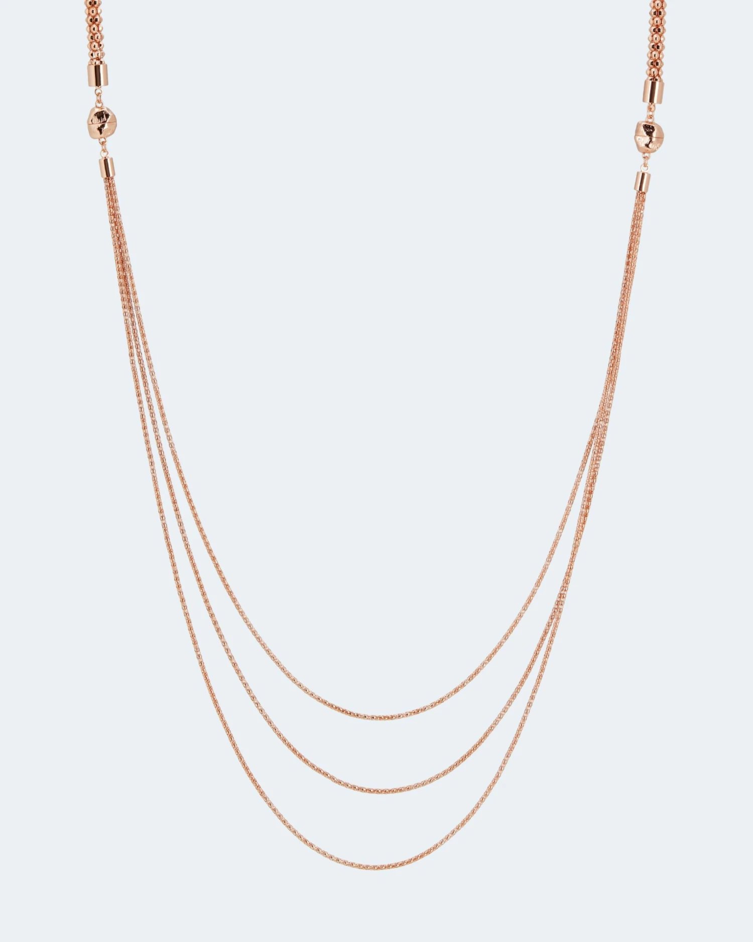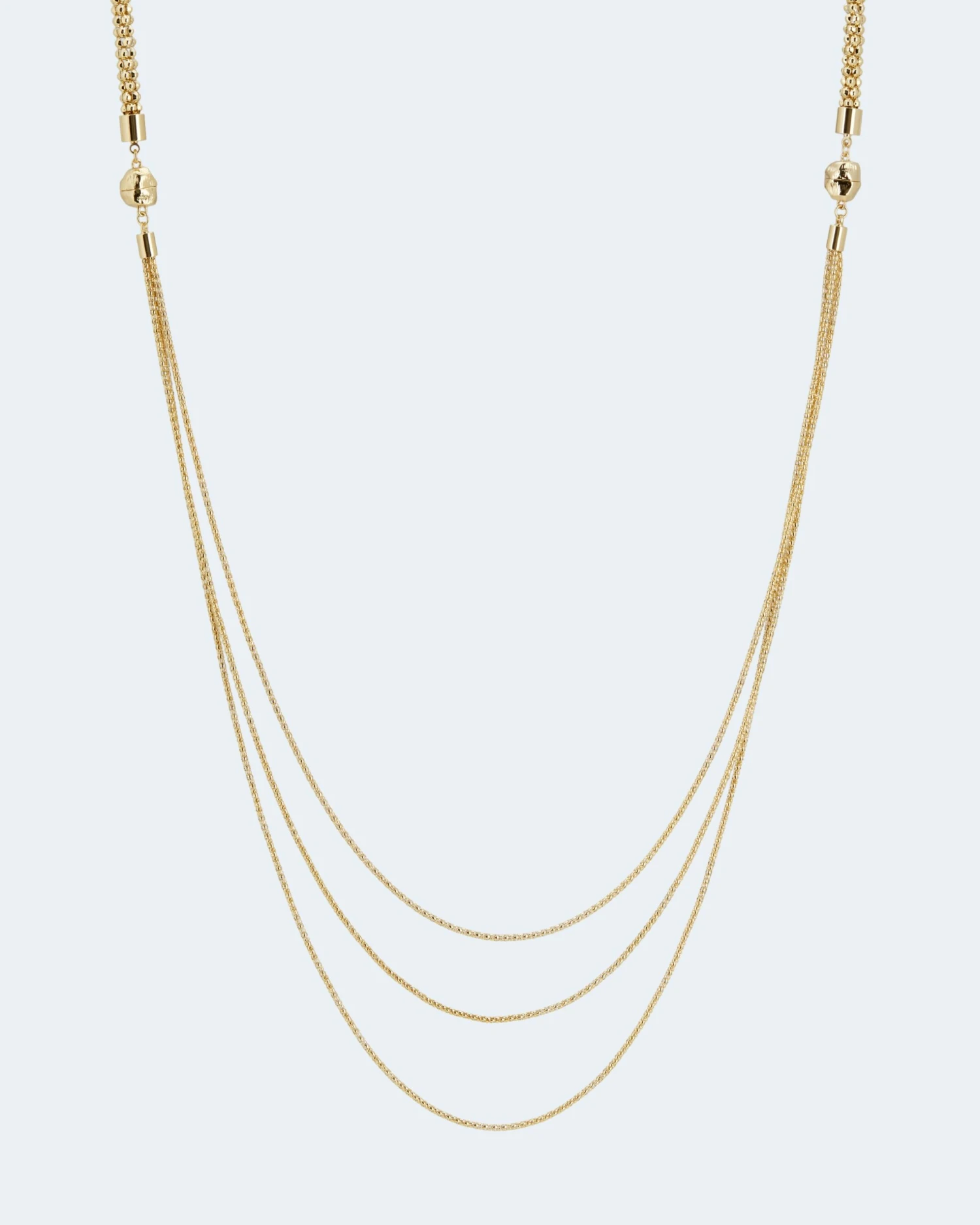 Im vorderen Bereich besteht das Collier aus drei zarten Kettchen, die links und rechts an einem Kugel-Element befestigt sind. Oberhalb der Kugeln gibt es nur noch einen Kettenstrang, der deutlich stärker gestaltet ist.