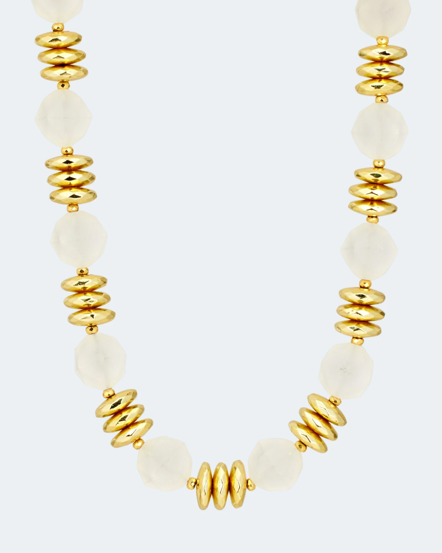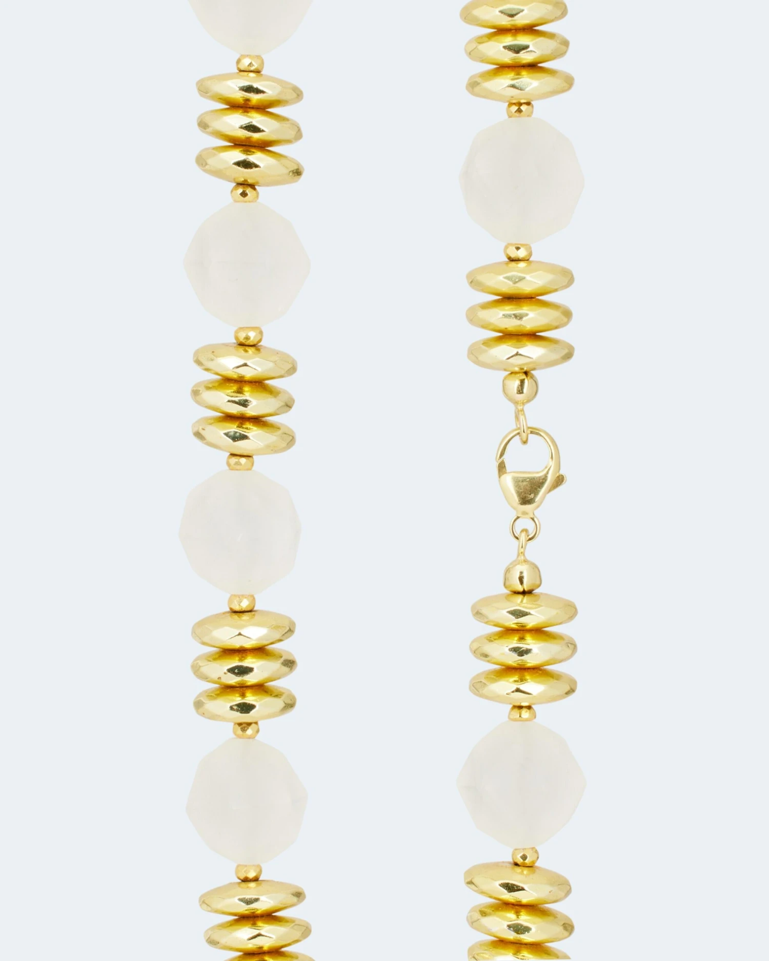 Wertvoller Edelsteinschmuck ist Ihre Leidenschaft? Dann sind Sie hier goldrichtig: Das einmalige Collier besteht aus vielen weißen Bergkristall-Kugeln sowie zahlreichen goldfarbenen Hämatit-Rondellen. Alle Steine sind facettiert, für hinreißende Funkel-Effekte bei jedem Lichteinfall. Zwischen die großen Bergkristalle sind jeweils fünf Hämatite gefädelt – so ergibt sich ein auffallender und einfach unwiderstehlicher Blickfang für Ihr Dekolleté.