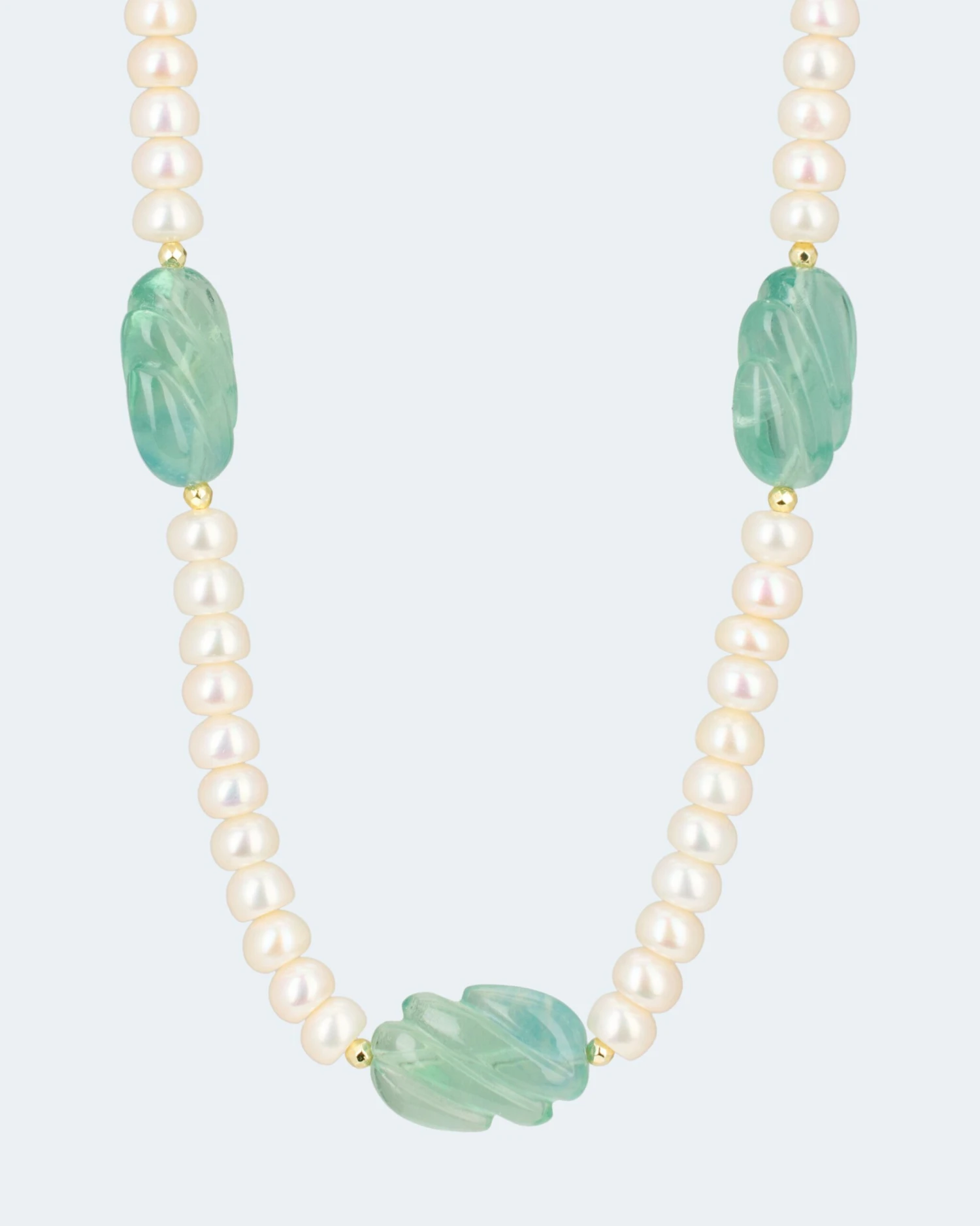 Das eindrucksvolle, dreifarbige Collier aus der Linie „Sogni d’oro Classic“ kombiniert auf wunderbare Weise Süßwasserzuchtperlen, gravierten Fluorit und Hämatit-Kugeln. Die Edelsteine und Perlen in noblem Weiß, zartem Grün und warmem Gold werden an Ihrem Hals zum schillernden Blickfang. Gönnen Sie sich dieses Schmuck-Accessoire und kombinieren Sie es zu Ihren Sommer-Outfits. Auf leicht gebräunter Haut kommt es besonders schön zur Geltung.