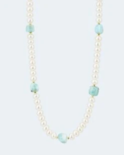 | Edelsteine/Perlen: | Süßwasserzuchtperlen, weiß 5x Larimar, türkis Hämatit (beh.), goldfarben alle zus. ca. 190,0 ct | |