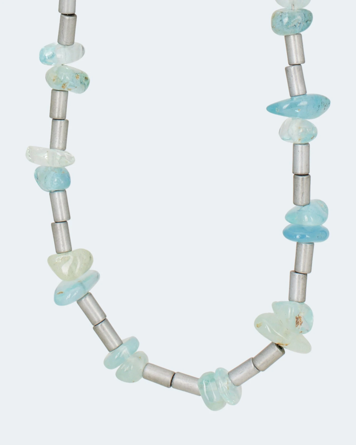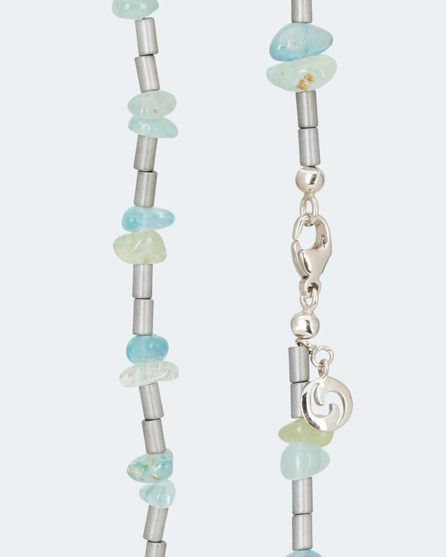 | Edelsteine: | Milky Aquamarin, blau Hämatit (beh.), grau auf ummantelten Stahldraht gefädelt | |