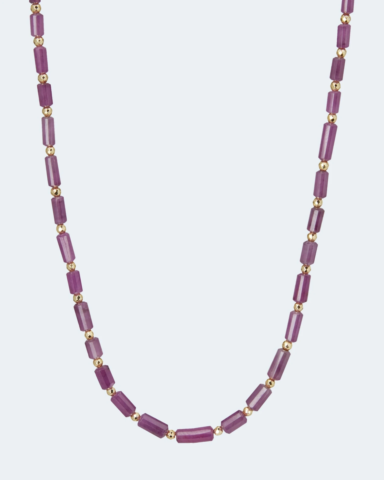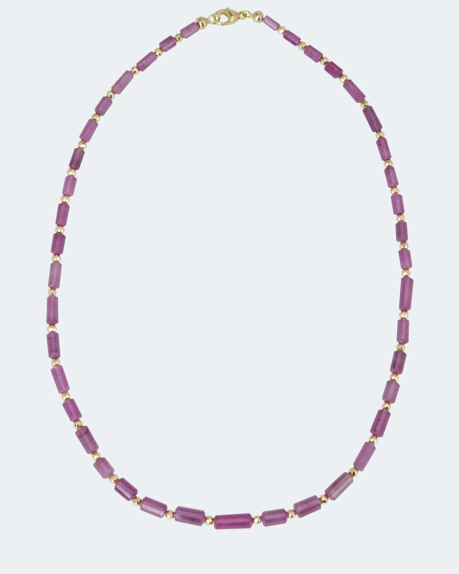 Zahllose leuchtend rote Rubin-Rondelle sorgen bei diesem Collier für schlichte Eleganz. Einen wunderschönen Kontrast bilden die goldfarbenen Hämatitkugeln, die zwischen die Rubine gefädelt sind.