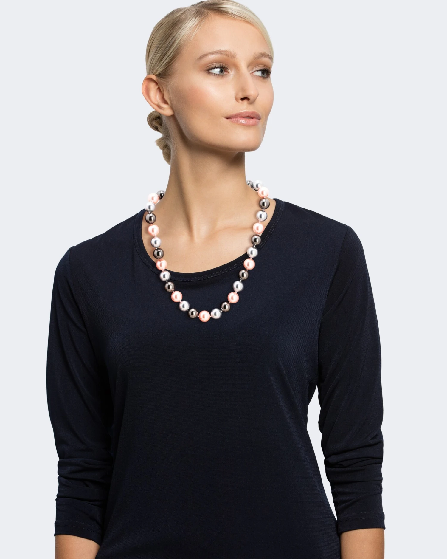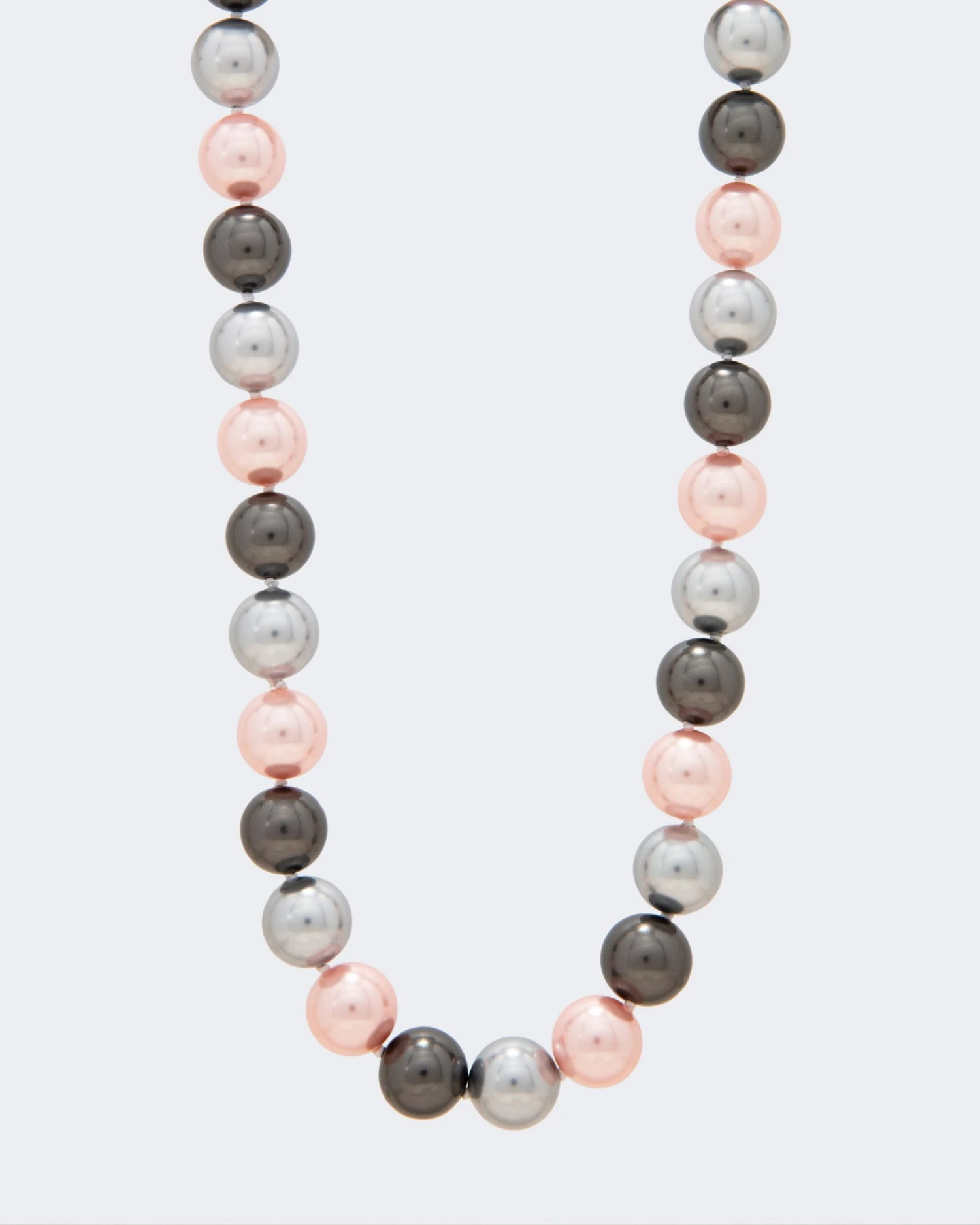 Dieses Perlencollier aus der Kollektion von Rita Pfeffinger ist aus besonders großen Muschelkernperlen gefädelt. Die wunderschön schimmernden Perlen sind in der Farb-Reihenfolge Anthrazit, Rosé und Grau aufgefädelt.