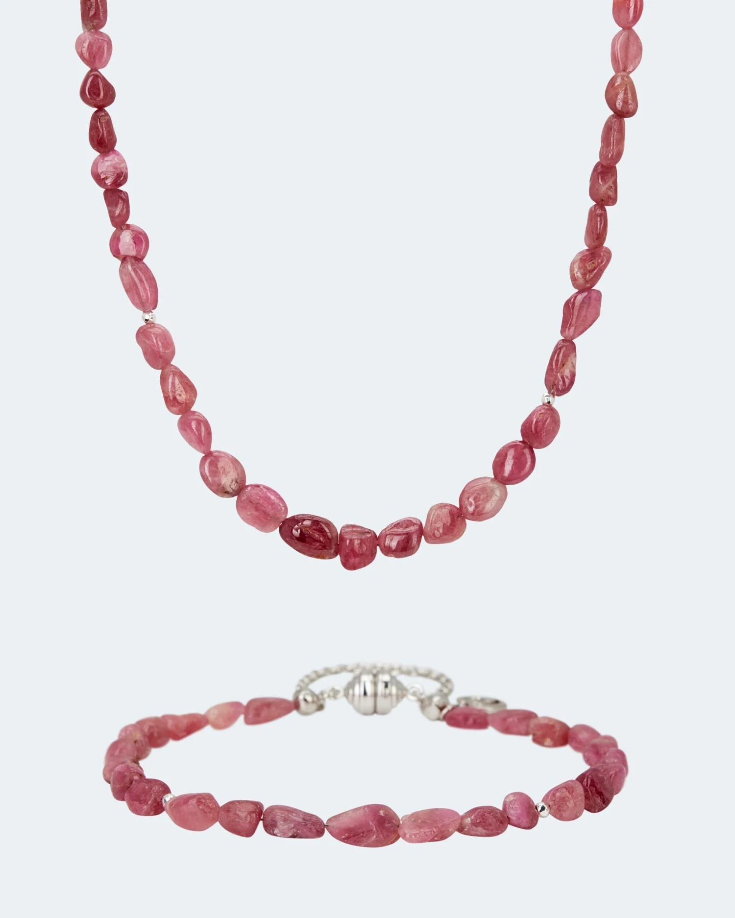 Jeder Turmalin auf diesem Schmuckset ist naturbelassen und damit ein unverwechselbares Unikat. Die Turmaline in diversen Pinktönen sind glatt poliert, so erstrahlt ihre Maserung besonders eindrucksvoll. Zwischen den Turmalinen blitzen facettierte Hämatit-Kugeln in Grau hervor. Schmücken Sie Dekolleté und Handgelenk mit der pinkfarbenen Edelsteinflut – und genießen Sie wie das Set Ihren Look harmonisch abrundet.