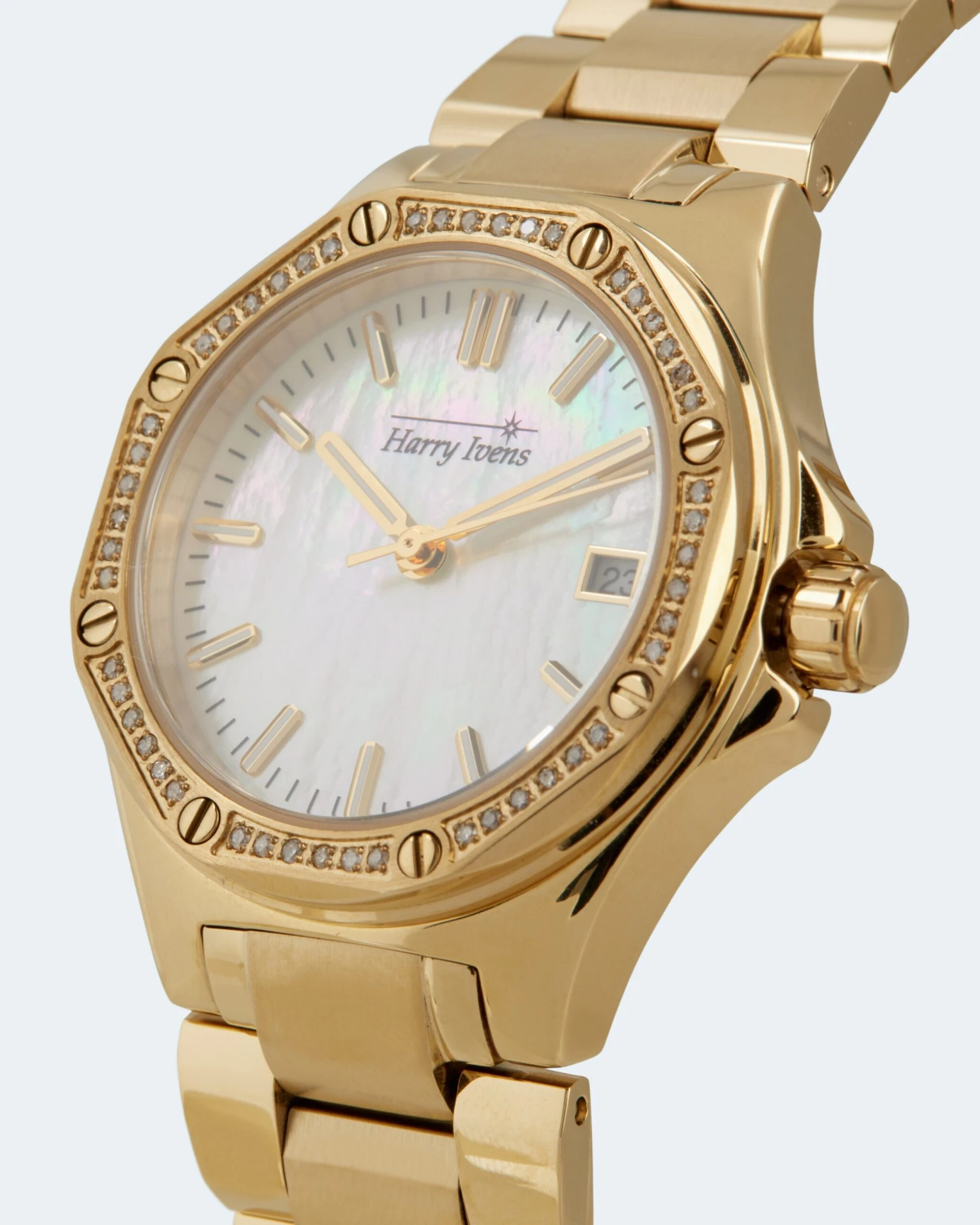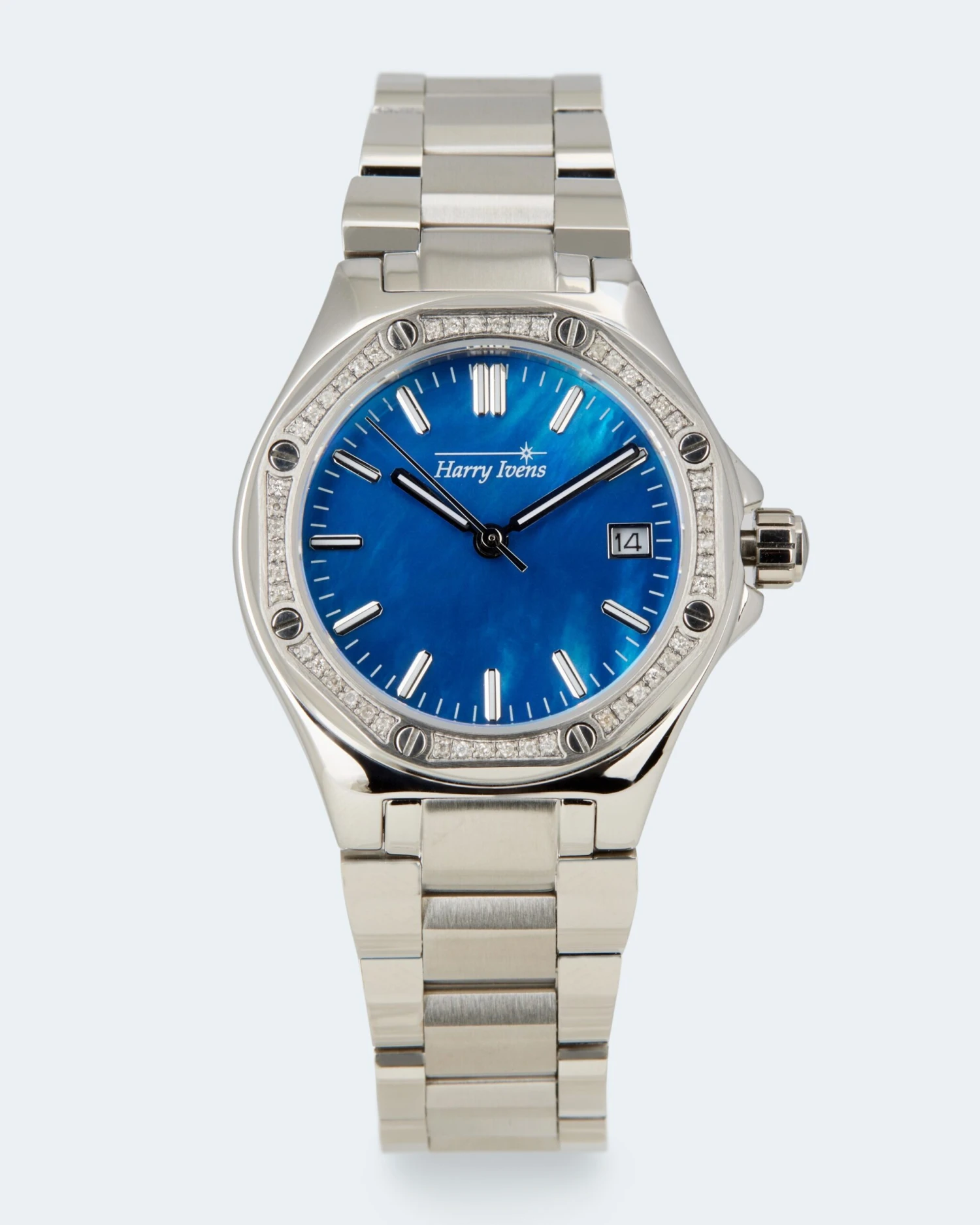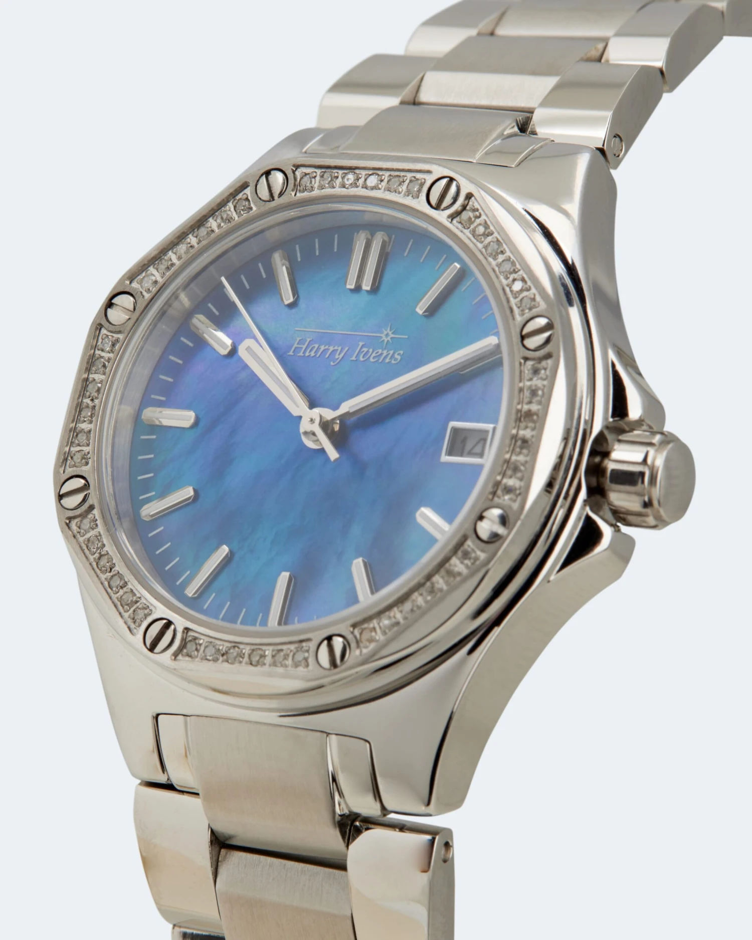 Allein das schlichte Zifferblatt in hellem Weiß oder strahlendem Blau mit attraktivem Metallic-Effekt ist ein Eyecatcher. Auf der Lünette glitzern 48 weiße Diamanten im Achtkantschliff. Jeweils 6 Diamanten sind in einer Reihe in Krappen gefasst und werden von Schraubenköpfen in Legierungsfarbe zu beiden Seiten begrenzt. Für alle Stunden außer 3 stehen Strichindexe. Auf 3 Uhr sitzt die Datumsanzeige. Auch alle Minuten sind durch Strichindexe markiert. Das Harry Ivens Logo unter 12 Uhr rundet das Ensemble ab.