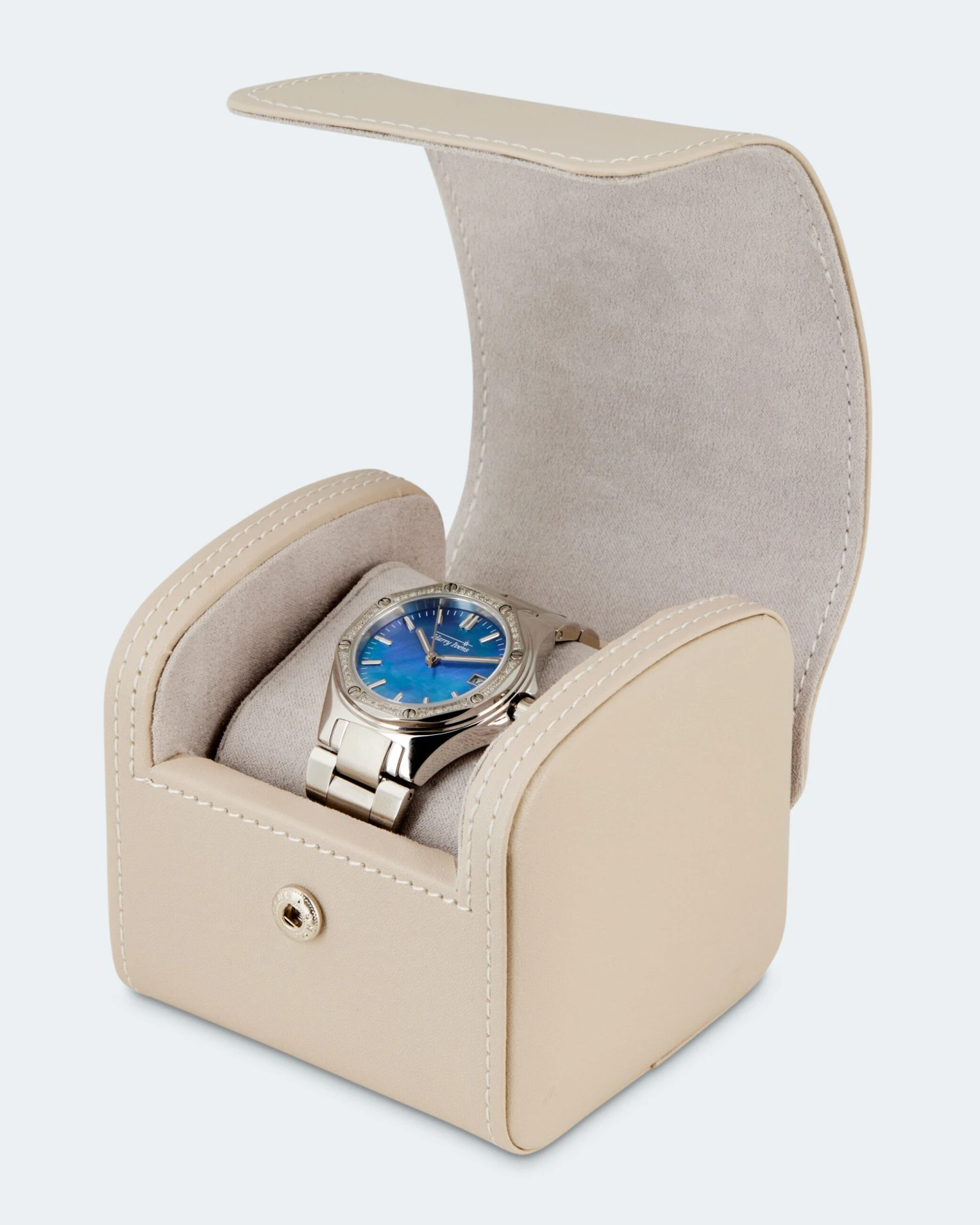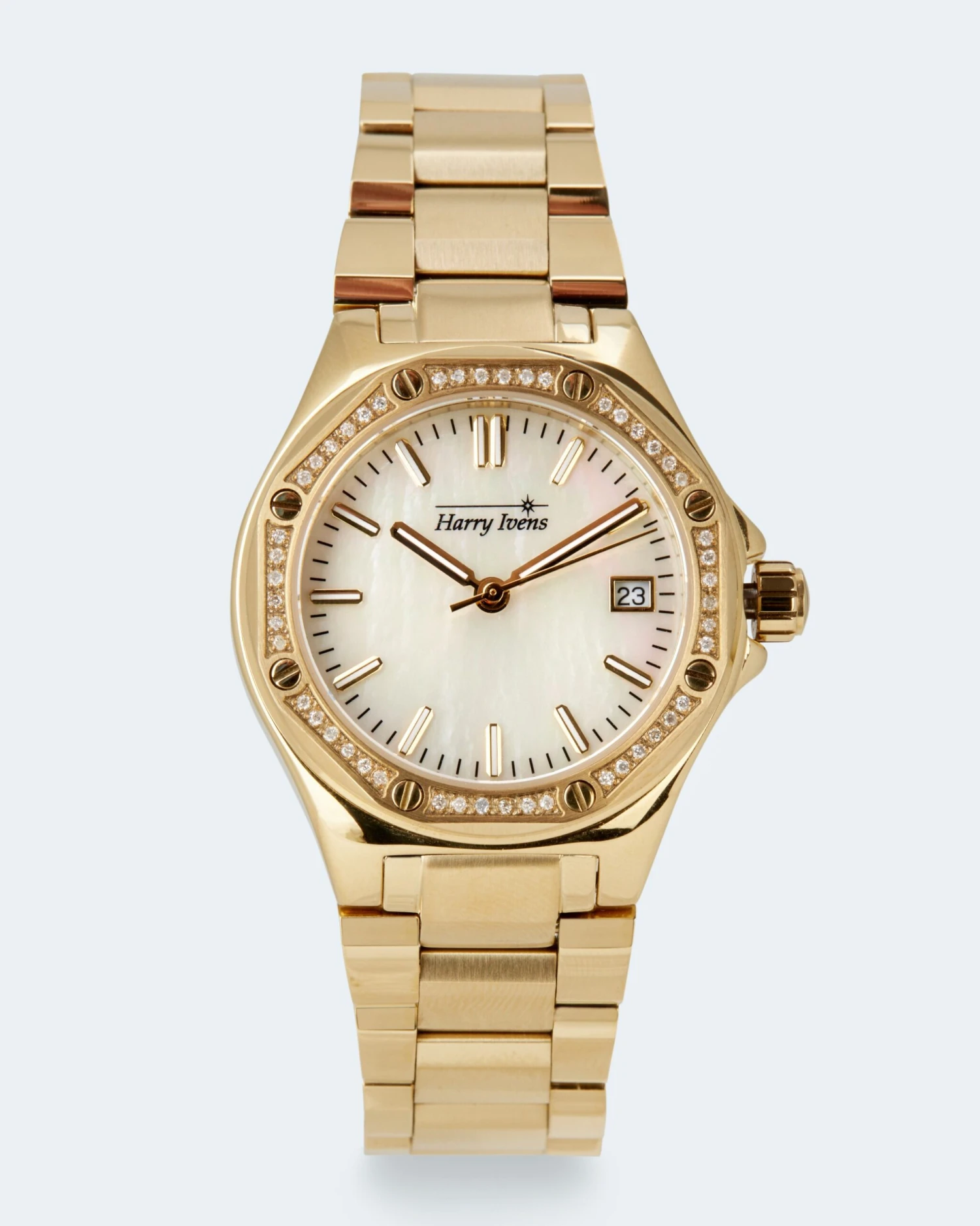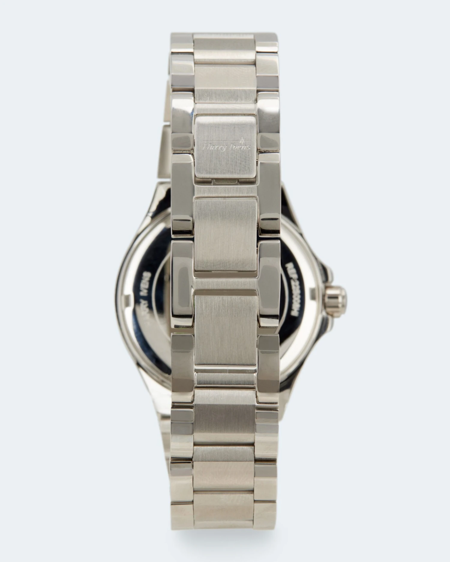 Allein das schlichte Zifferblatt in hellem Weiß oder strahlendem Blau mit attraktivem Metallic-Effekt ist ein Eyecatcher. Auf der Lünette glitzern 48 weiße Diamanten im Achtkantschliff. Jeweils 6 Diamanten sind in einer Reihe in Krappen gefasst und werden von Schraubenköpfen in Legierungsfarbe zu beiden Seiten begrenzt. Für alle Stunden außer 3 stehen Strichindexe. Auf 3 Uhr sitzt die Datumsanzeige. Auch alle Minuten sind durch Strichindexe markiert. Das Harry Ivens Logo unter 12 Uhr rundet das Ensemble ab.
