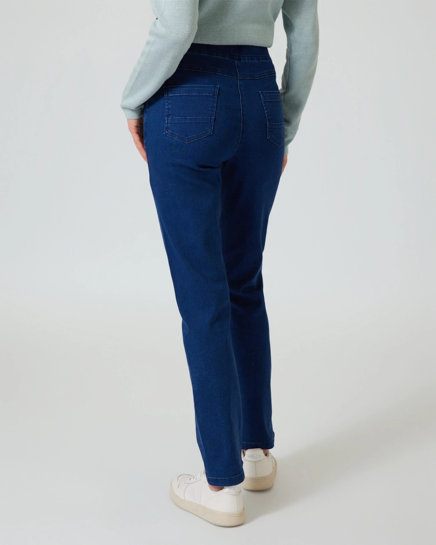 Die Schlupfhose mit dem langen, geraden Bein und dem breiten elastischen Bund kommt im zeitlos modernen Jeans-Style daher. Sie ist super komfortabel und sieht auch noch toll aus. Mit zwei schmalen Eingrifftaschen vorne, zwei aufgesetzten Gesäßtaschen und dem traditionellen Sattel nimmt das Design den klassischen Jeans-Stil auf und übersetzt ihn in ein wunderbar bequemes, dehnbares Modell mit schmaler Silhouette.