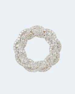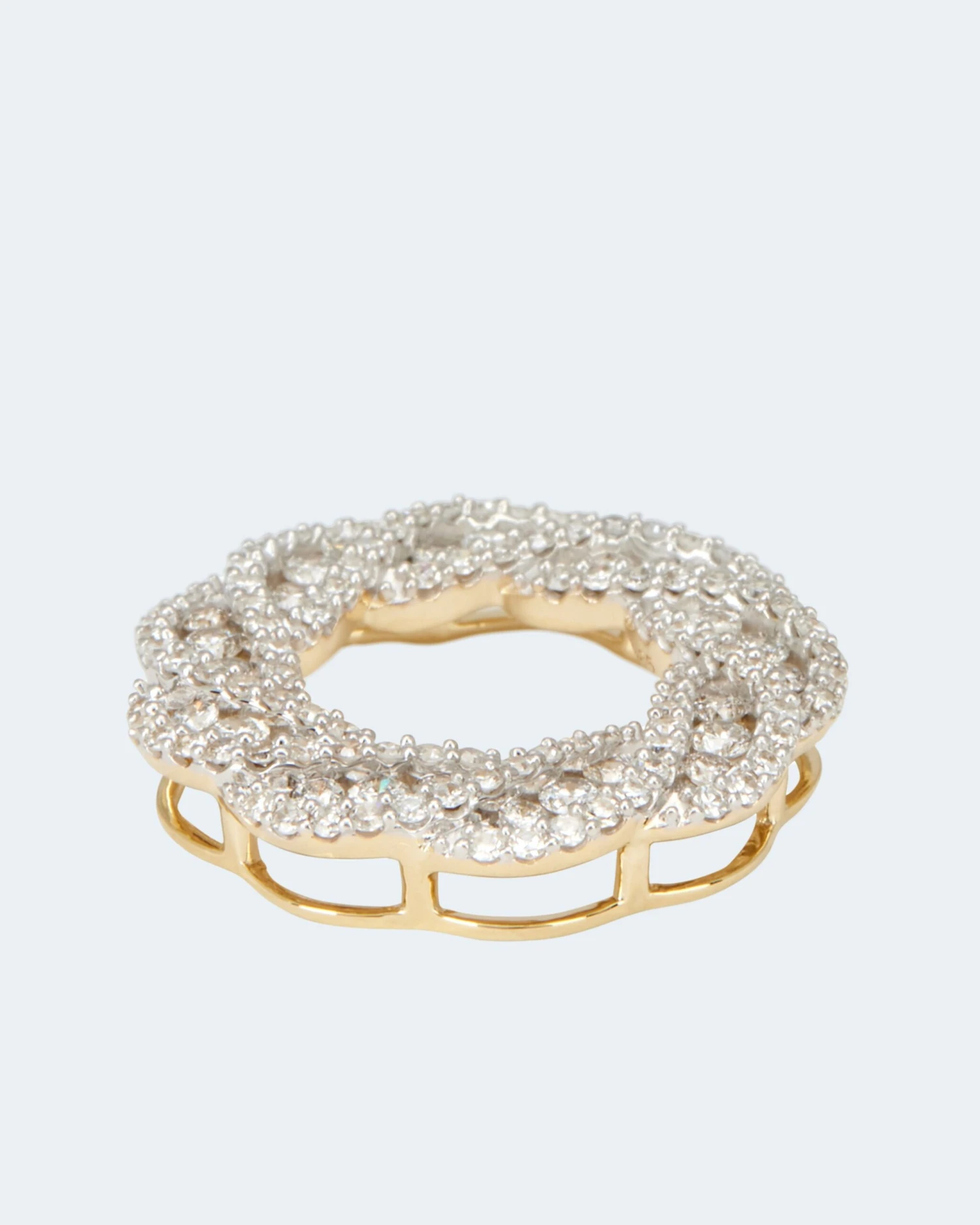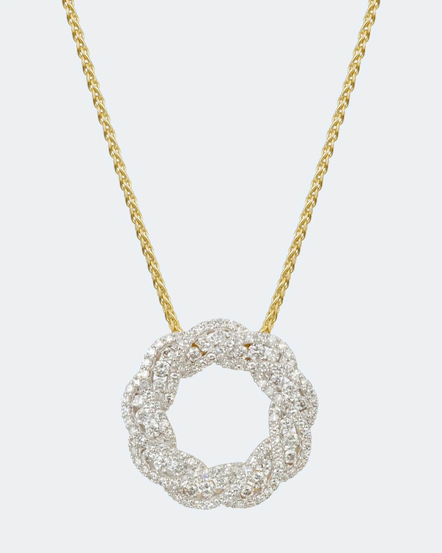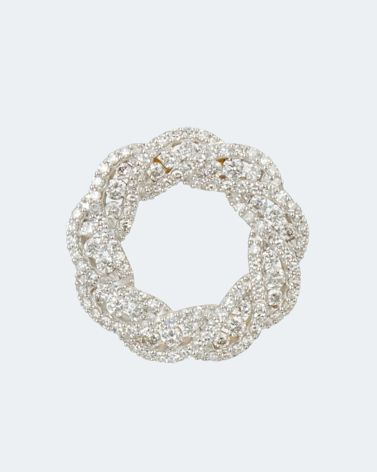 Der Anhänger in gewellter Ringform ist über und über mit insgesamt 27 Brillanten und 99 Diamanten besetzt. Alle in guter Schliffqualität und der Reinheit P1.