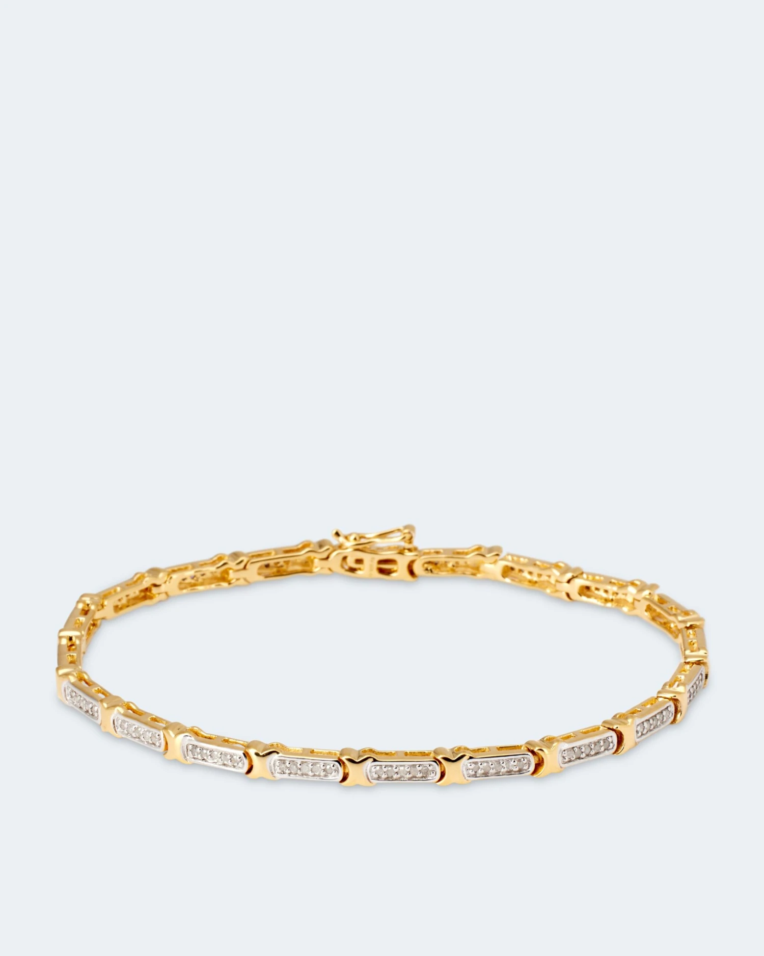 Zeitlose Eleganz mit einem modernen Twist, dieses Armband ist das perfekte Accessoire zu jedem Outfit – von sportlichen Looks bis zur feinen Abendgarderobe. Ausgefasst ist es mit 100 weißen Diamanten in der Reinheit P2, klassisch im Achtkantschliff veredelt. Die gleich großen Steinchen sind in 20 Fünfergruppen in kleine Krappen gefasst. Das Edelmetall in hochwertiger Gelbgoldoptik macht das exklusive Design komplett.