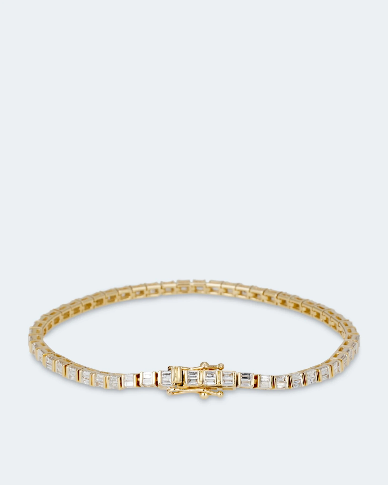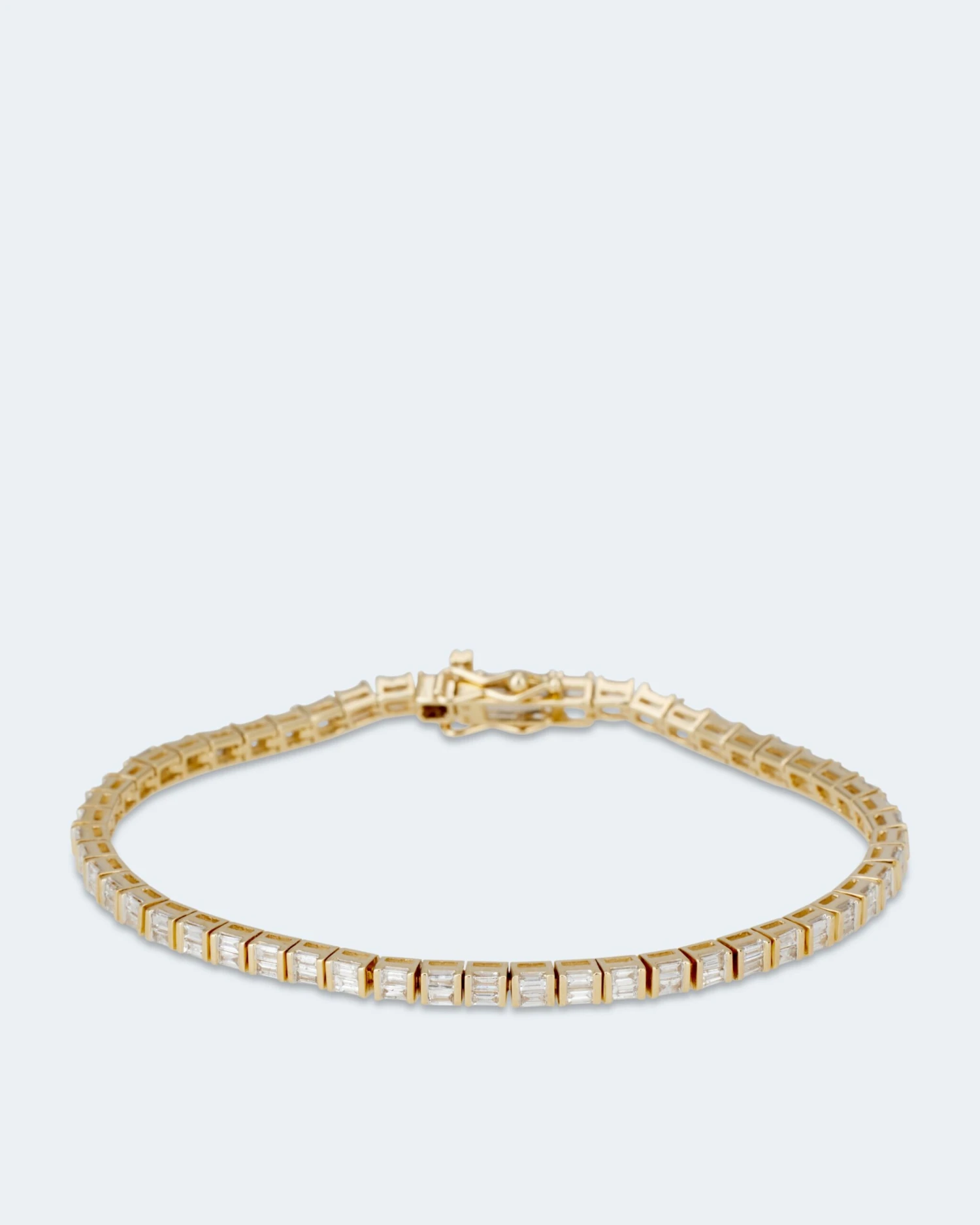 Dieses Schmuckstück strahlt pure Eleganz und verführerischen Glamour aus. Jeder einzelne der 108 Diamanten wurde sorgfältig ausgewählt und in das hochwertige 585er Gold eingefasst. Der aufwendige Baguetteschliff sorgt dabei für ein faszinierendes Funkeln. Gehalten werden die kleinen Kostbarkeiten von einer wertvollen Kanalfassung. Das Resultat ist eine brillante Komposition mit 2,00 Karat Edelsteingewicht, die jeden Blick einfängt. Mit seiner luxuriösen Ausstrahlung ist dieses Armband das perfekte Accessoire für besondere Anlässe oder um Ihrem Alltags-Outfit einen Hauch von Raffinesse zu verleihen. Lassen auch Sie sich von dem Glanz verzaubern.