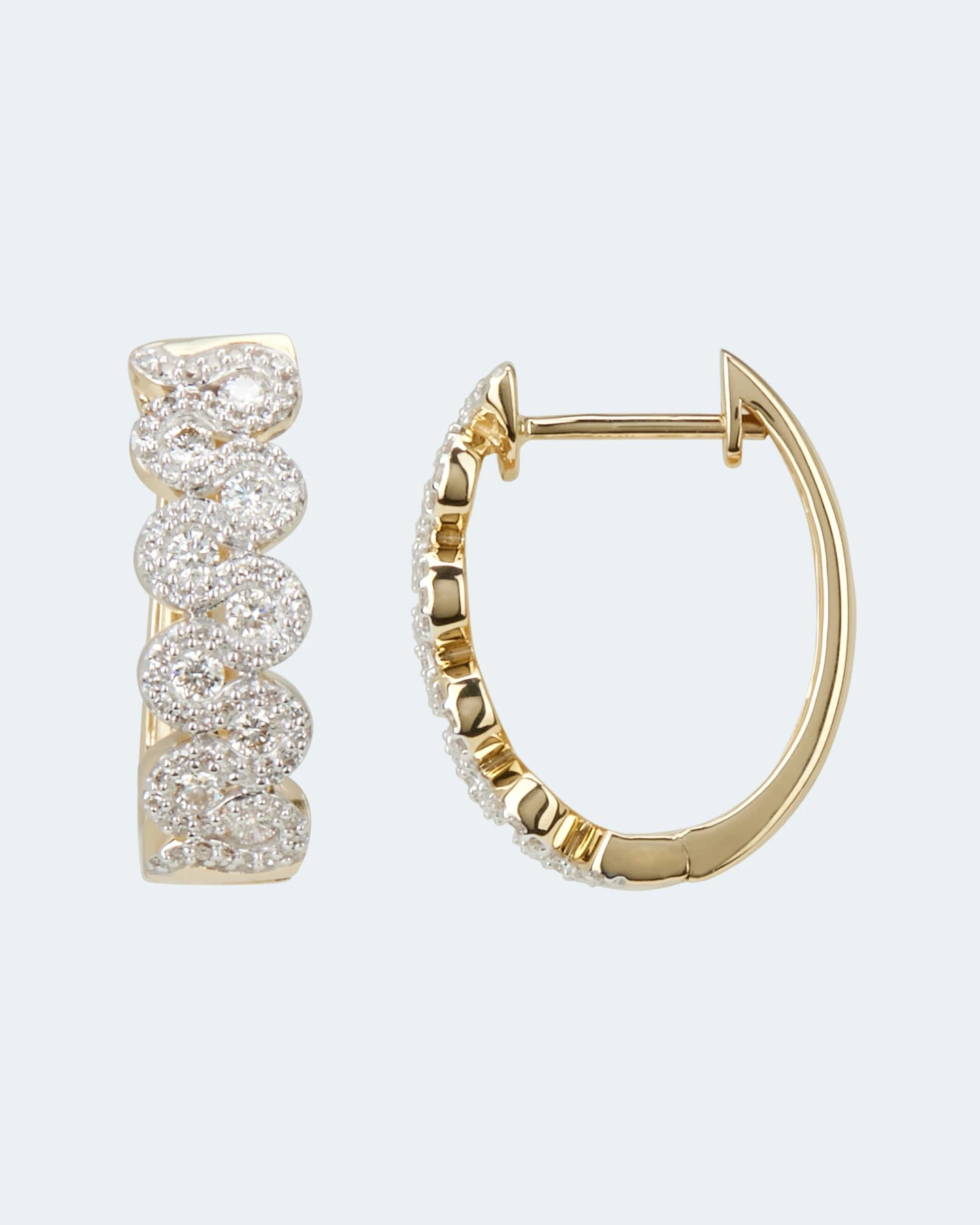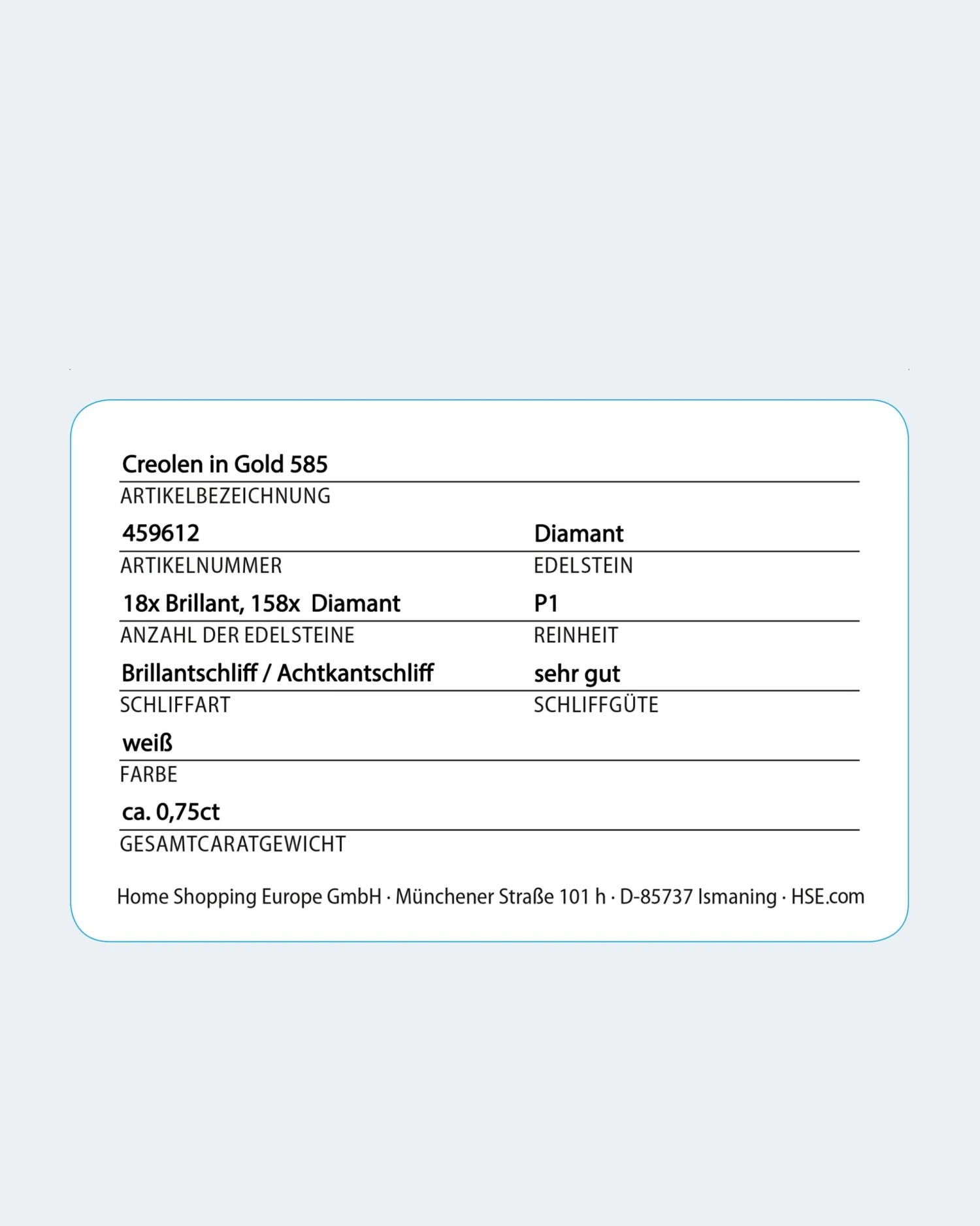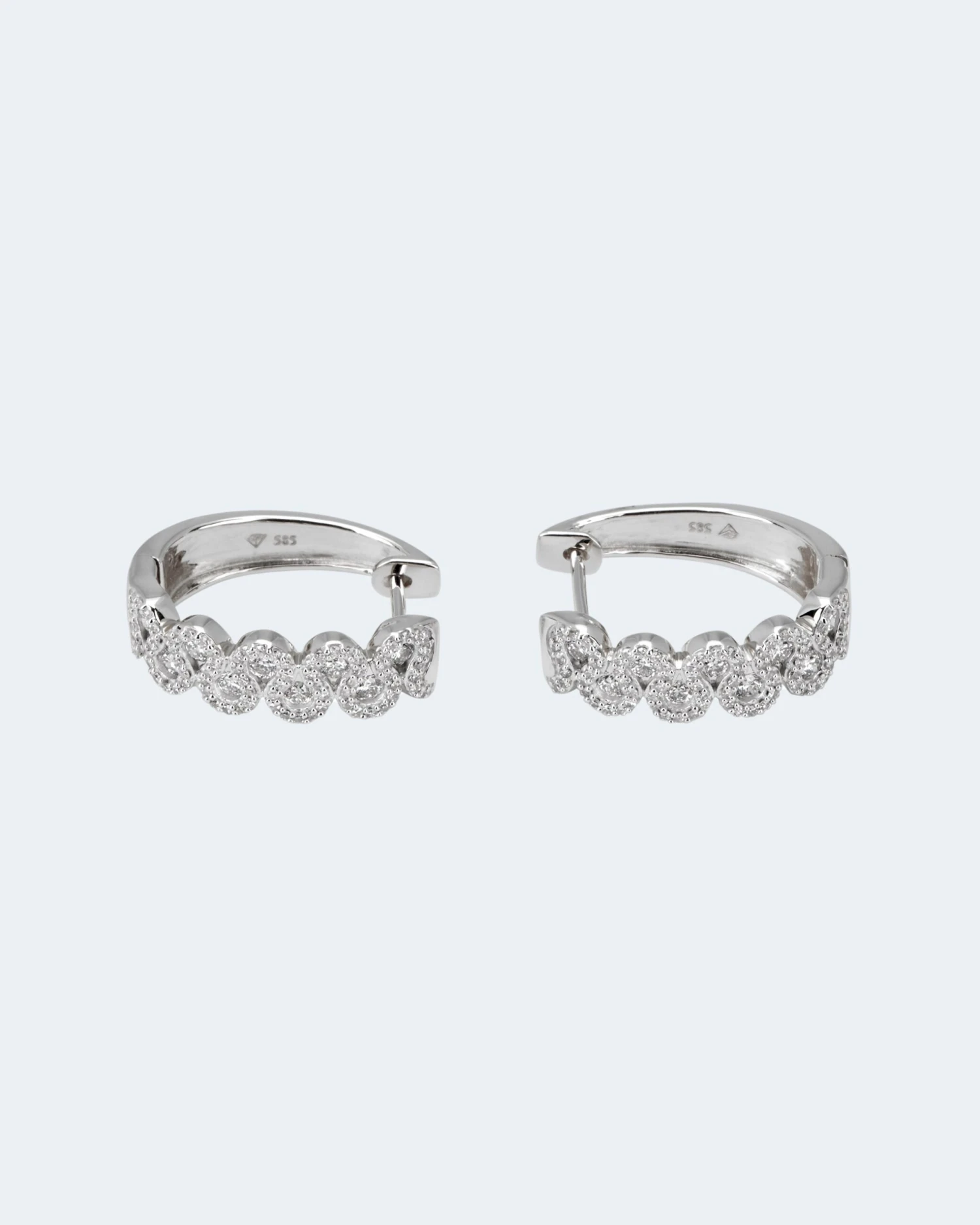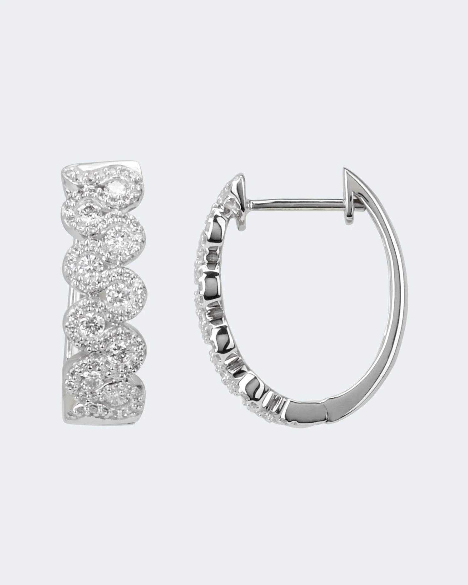 Die weißen Edelsteine in gutem Schliff und der Reinheit P1 verteilen sich über die geschwungenen Bänder, die sich über die gesamte Vorderseite der Creolen schlängeln.