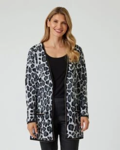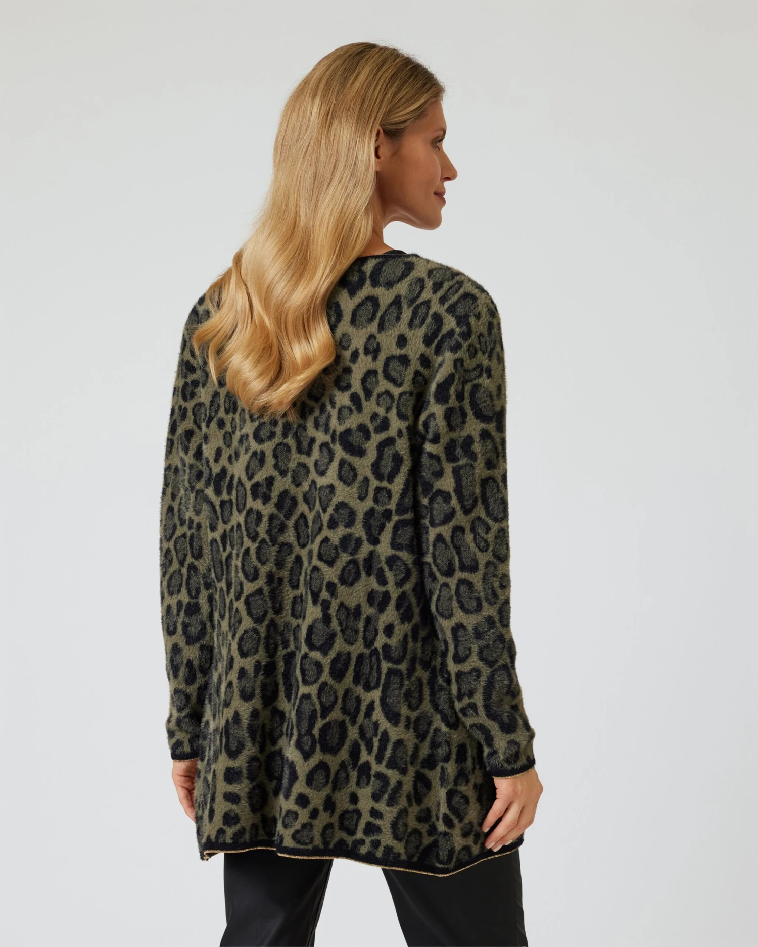 Dieser Cardigan ist ein absolutes Must-have für alle Fashion-Liebhaberinnen. Das Flauschgarn sorgt für ein unglaublich weiches und gemütliches Tragegefühl, das Sie warm durch die kalten Tage begleitet. Der aufregende Animal-Print verleiht dem Cardigan einen Hauch von Wildheit und zieht alle Blicke auf sich. Die Kontrastborte setzt einen zusätzlichen Akzent. Ideal: Sie können den Cardigan blitzschnell überziehen, da er keine Knöpfe oder Verschlüsse hat – perfekt für einen lässigen Look.