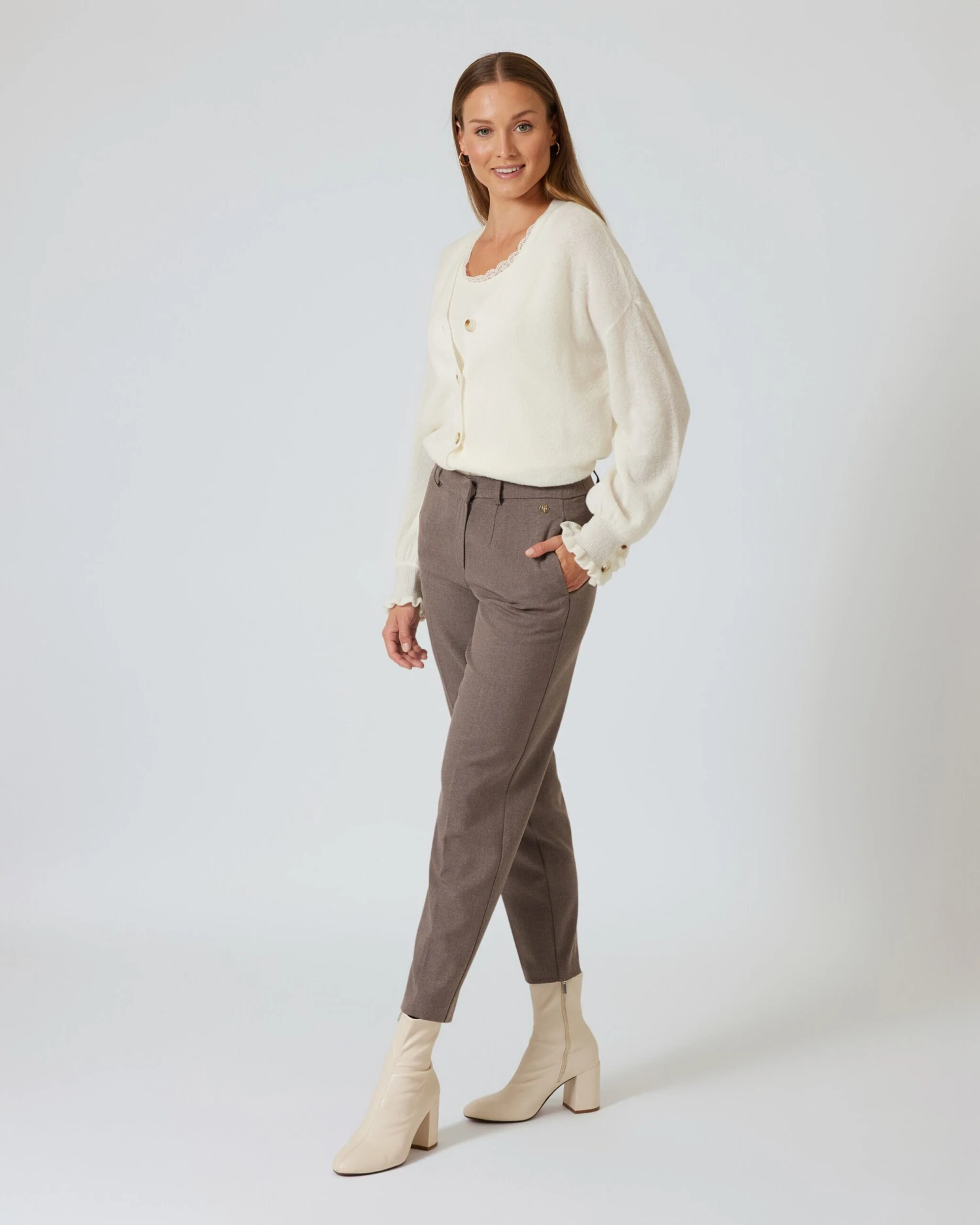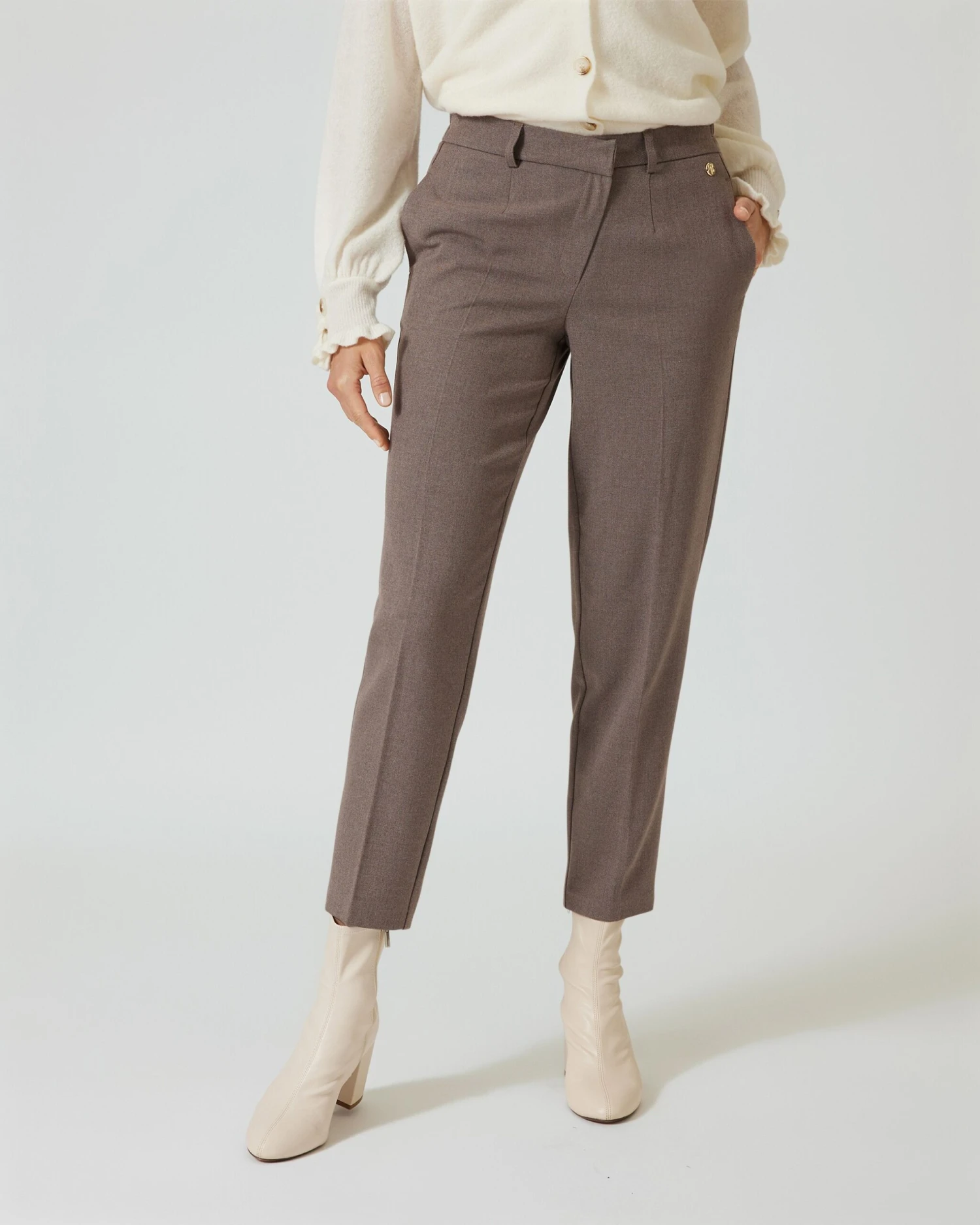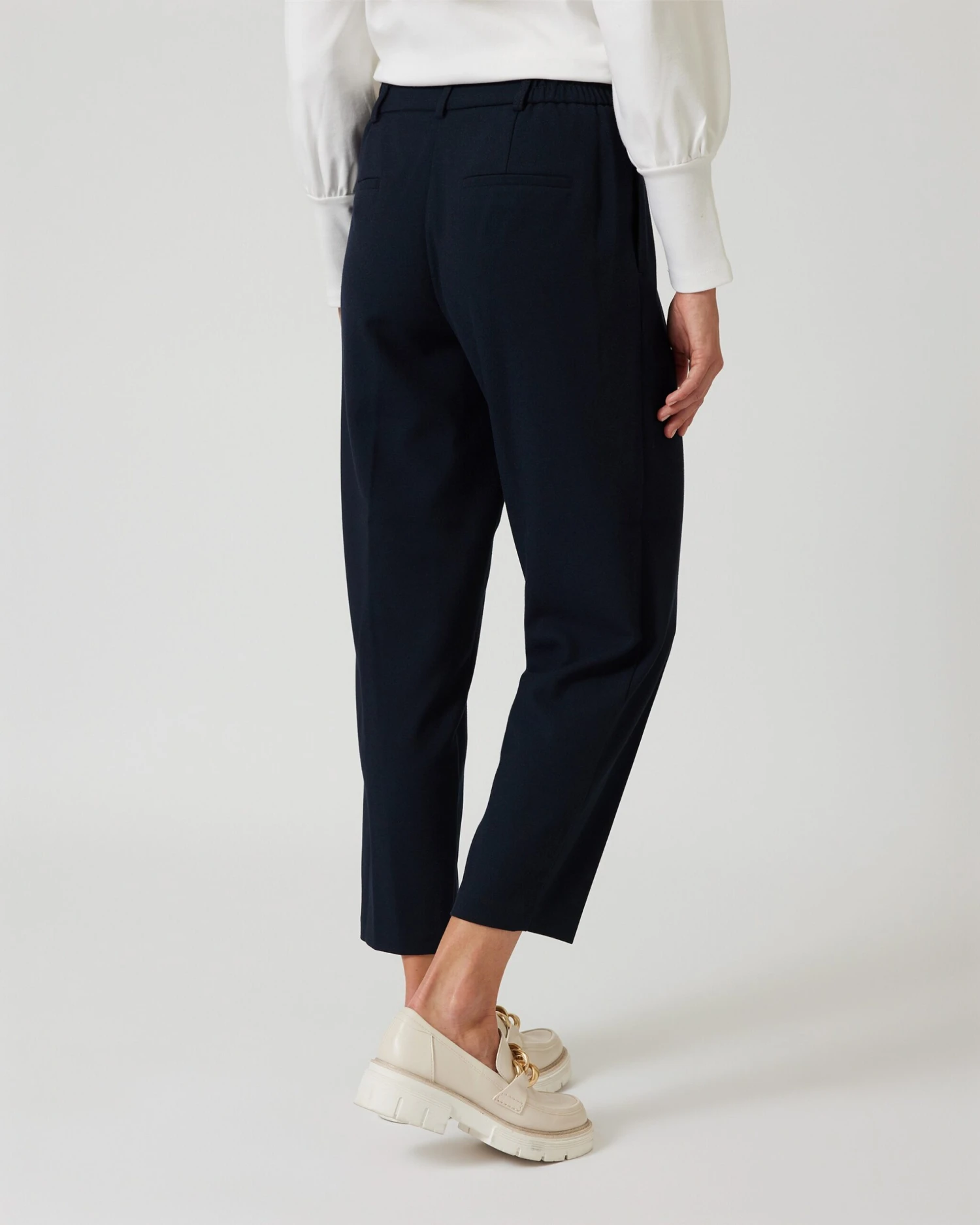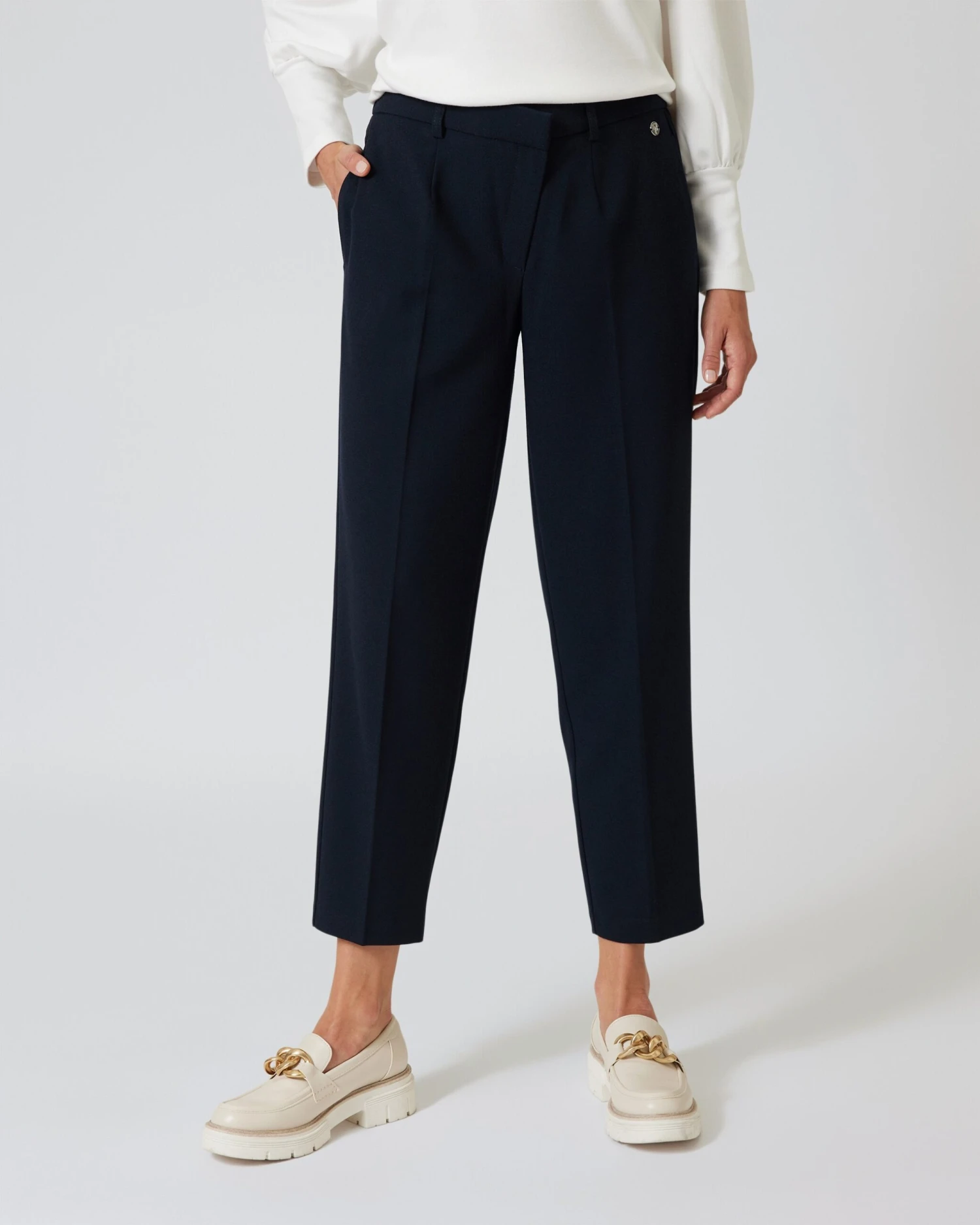 Diese Hose ist ein absolutes Must-have für alle Frauen, die Wert auf eine moderne Passform und Bewegungsfreiheit legen. Die 7/8-Länge verleiht der Hose einen luftigen und trendigen Look und lässt sich ideal zu verschiedenen Outfits kombinieren. Das Design von Bund und Verschluss ist asymmetrisch gestaltet und macht das Design zum echten Hingucker. Die elastischen Seiteneinsätze am Bund sorgen für einen bequemen Sitz: Ein Komfort, den Sie vom ersten Tag an lieben werden. Die Bügelfalte am Bein wirkt streckend und zaubert eine schlanke Silhouette. Durch den Anteil an Recycled Polyester im Gewebe-Mix ist dieses Fashion-Highlight zudem nachhaltig gefertigt.