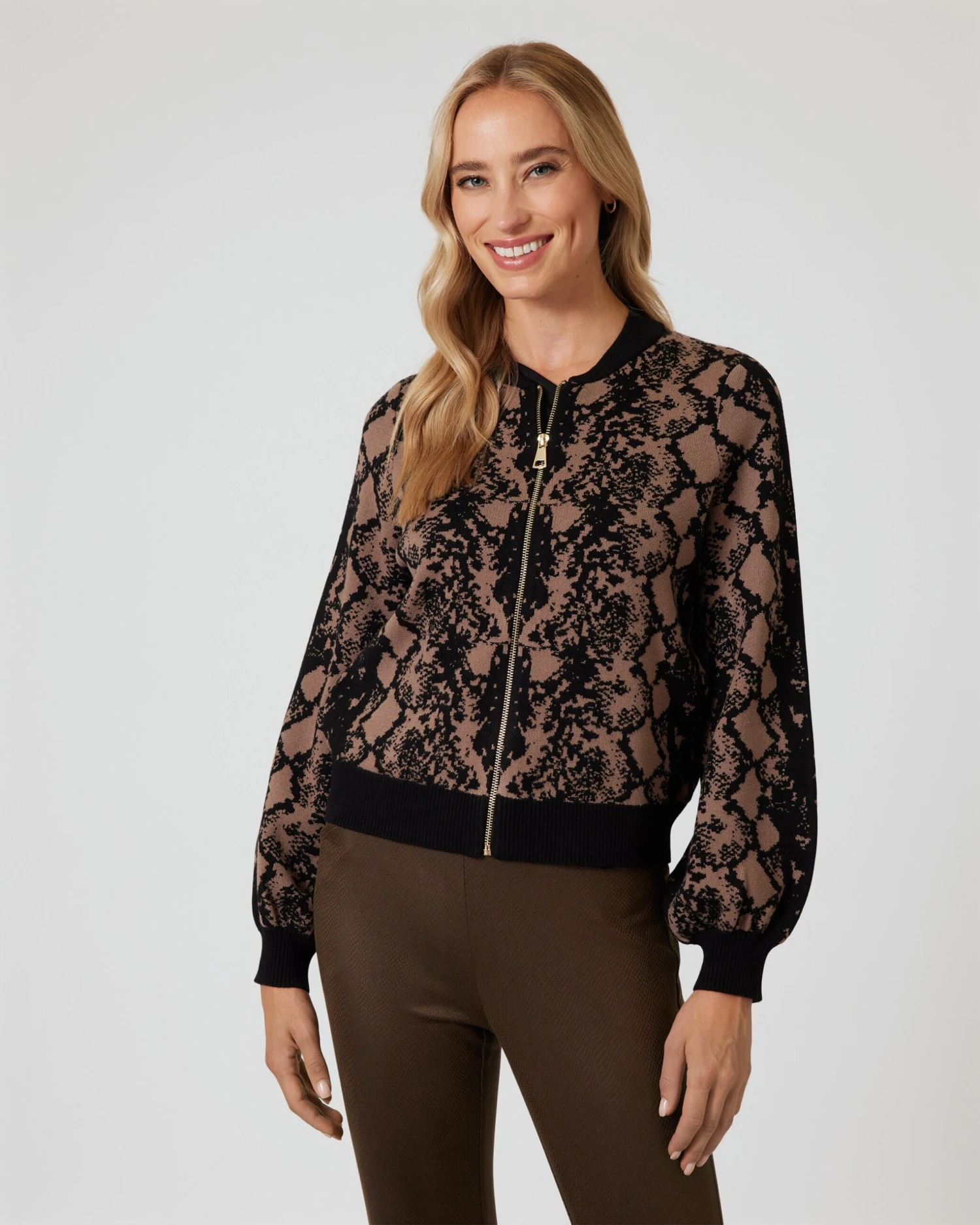 Elegant und super stylisch: Der Blouson von Judith Williams macht aus all Ihren Kombis sofort ein Hingucker-Outfit. Die Besonderheit der Strickware liegt im zweifarbigen Animalmuster im edlen Jacquard-Design. Mit dem Fashion-Piece setzen Sie zu all Ihren Hosen, Röcken und Kleidern ein modisches, unübersehbares Statement. Die jugendliche, figurbetonte Schnittführung mit Reißverschluss, Stehkragen und seitlichen Taschen wird durch uni schwarze Abschlüsse betont. Ein Must-have für alle Frauen, die aufregende Styles lieben.