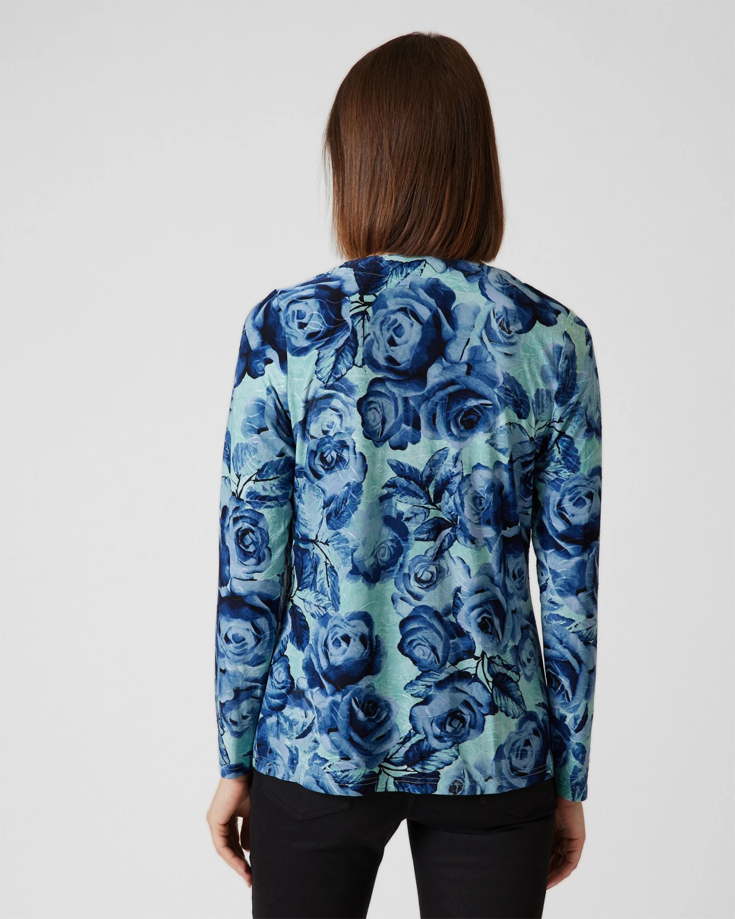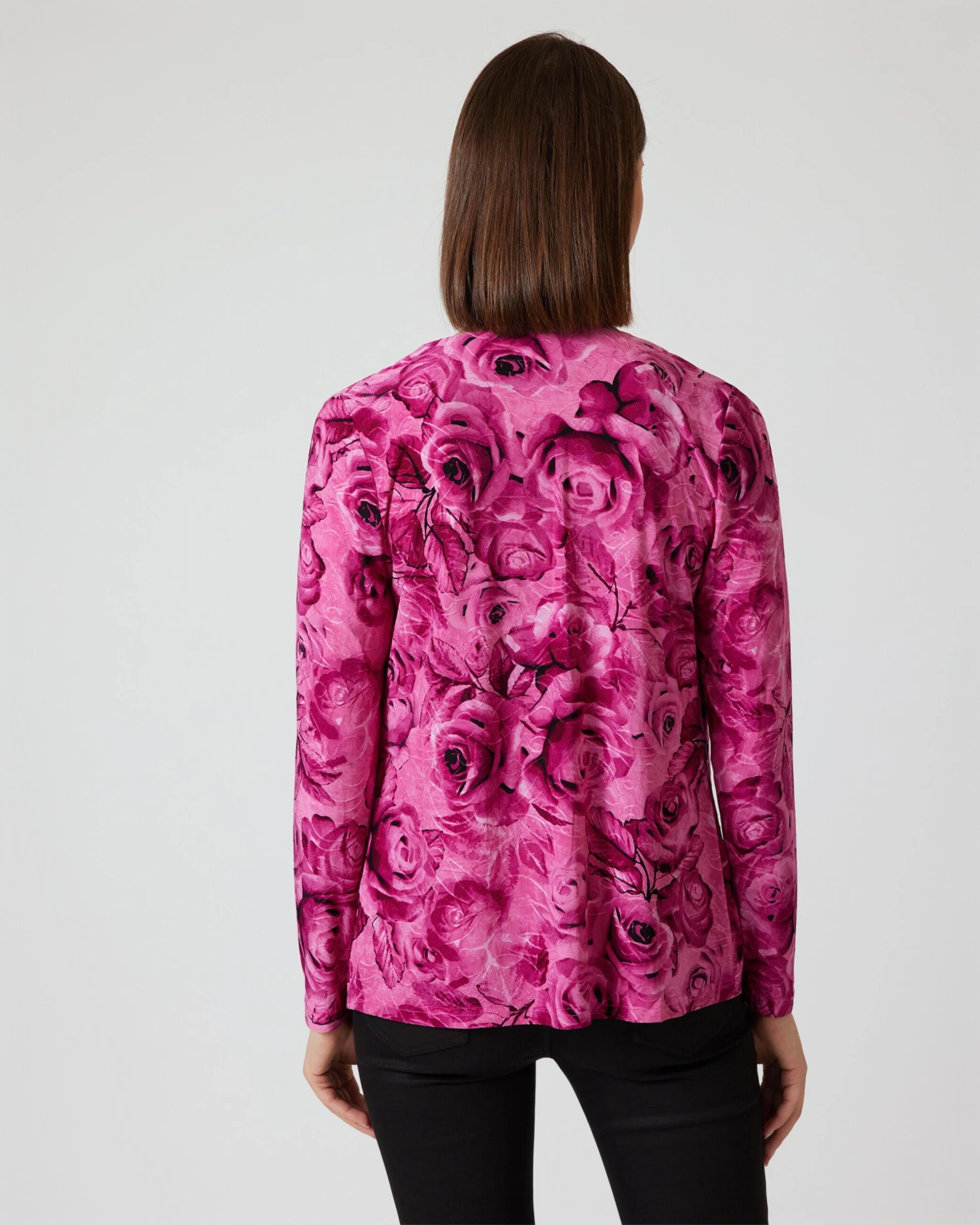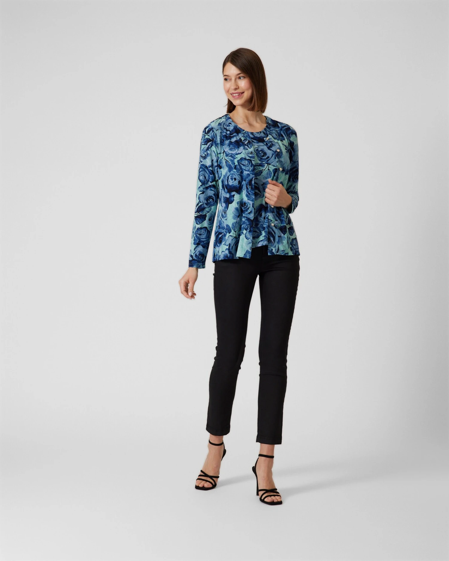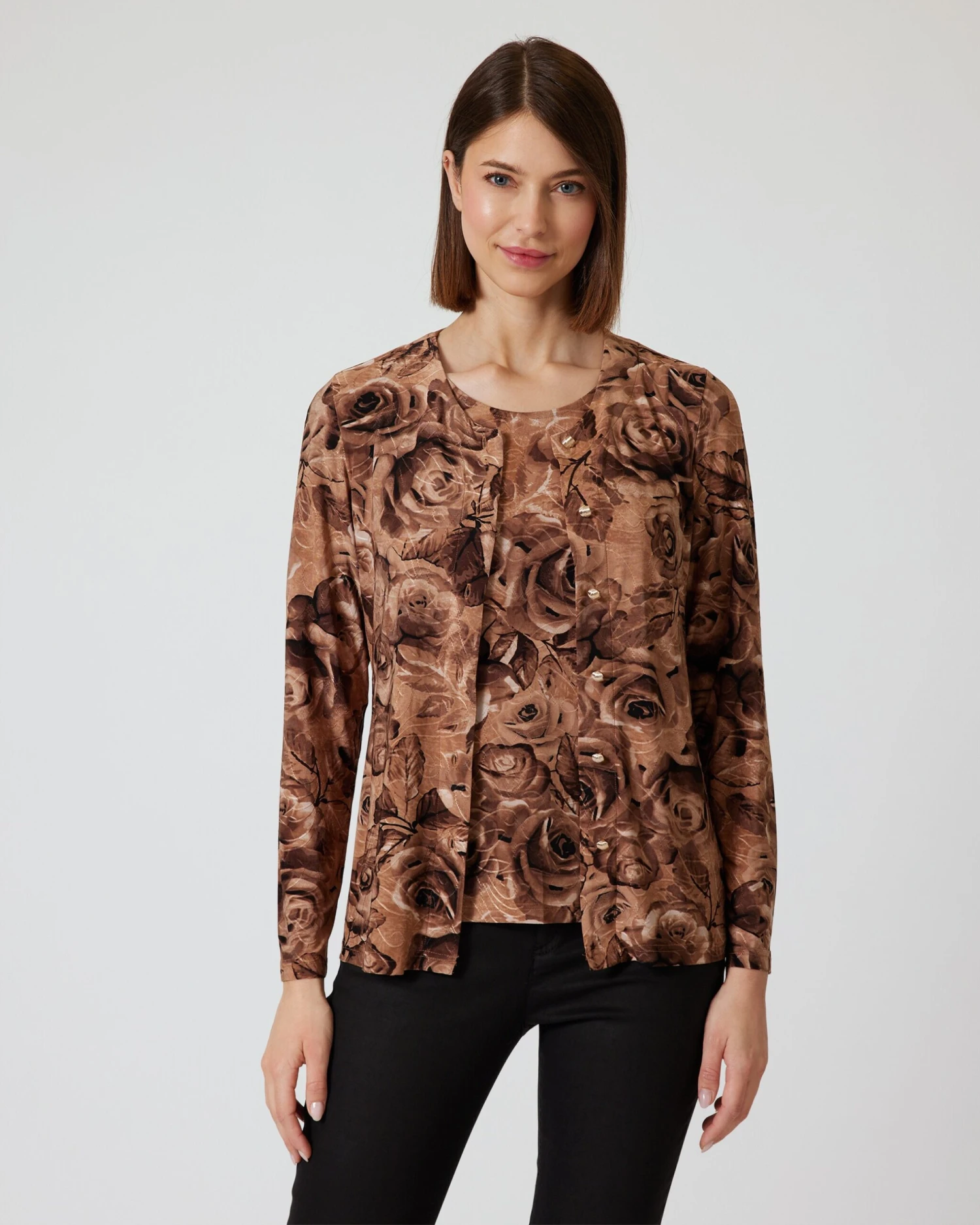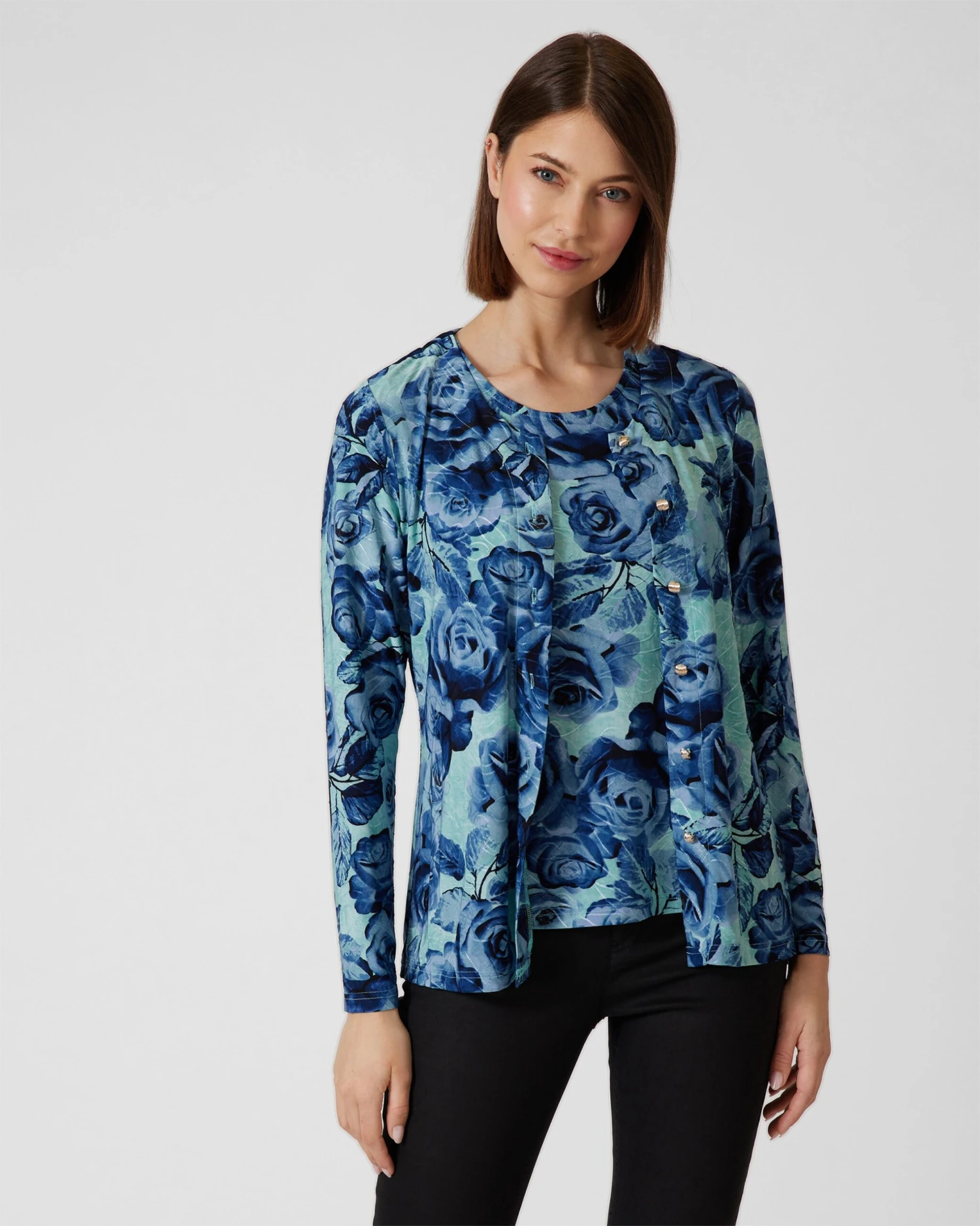 Cardigan und Shirt sind über und über mit üppigen Rosenblüten bedruckt. Die Farbgestaltung ist Ton-in-Ton in feinen Farbnuancen. Die Passform ist dezent tailliert, sodass Ihre Figur vorteilhaft in Szene gesetzt wird.