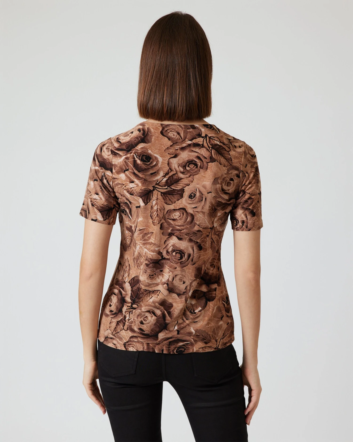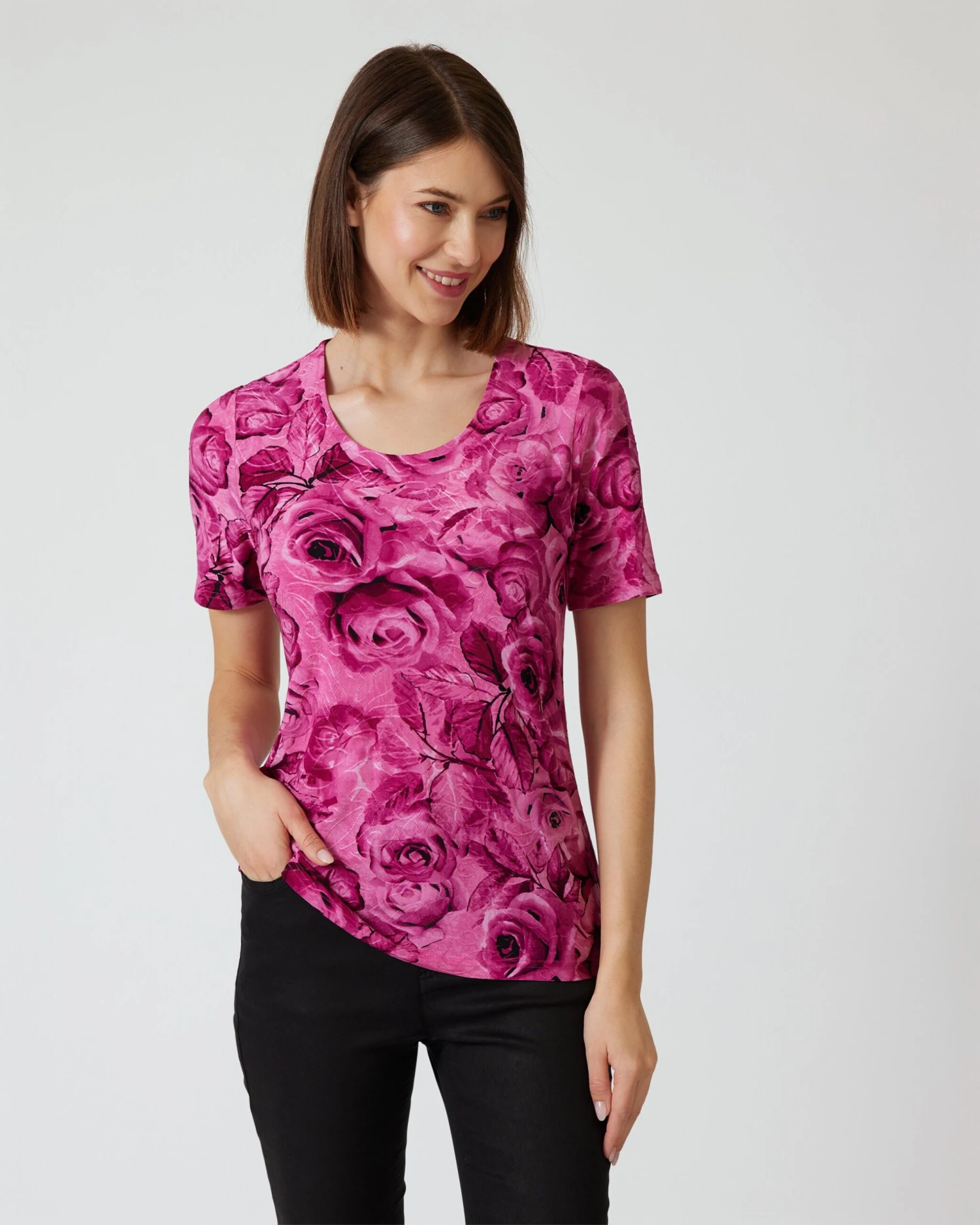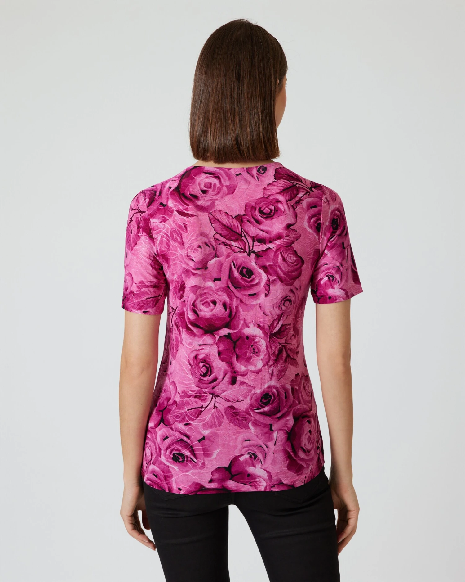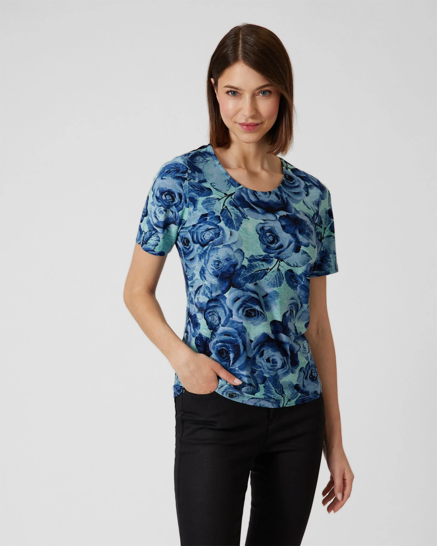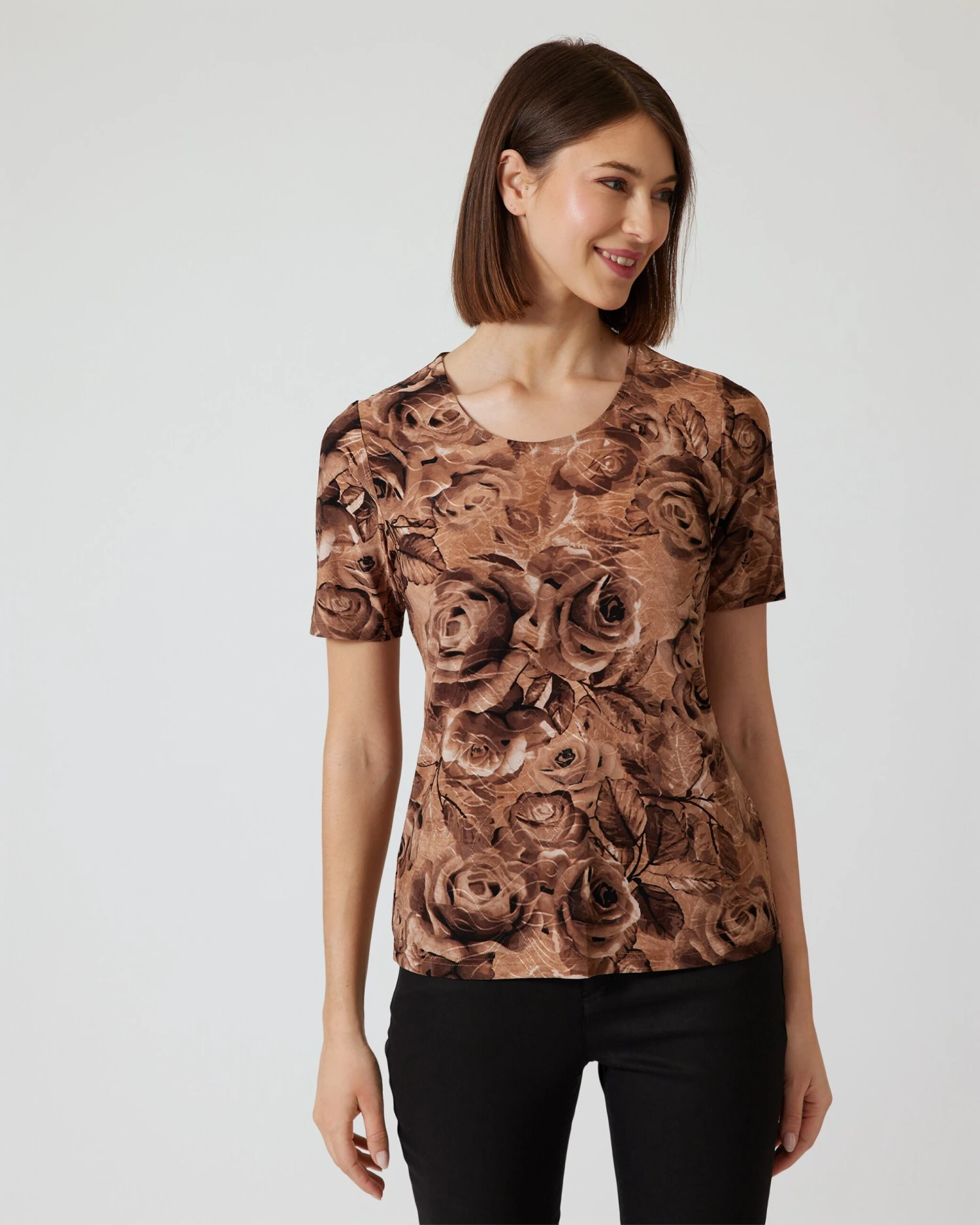 Cardigan und Shirt sind über und über mit üppigen Rosenblüten bedruckt. Die Farbgestaltung ist Ton-in-Ton in feinen Farbnuancen. Die Passform ist dezent tailliert, sodass Ihre Figur vorteilhaft in Szene gesetzt wird.