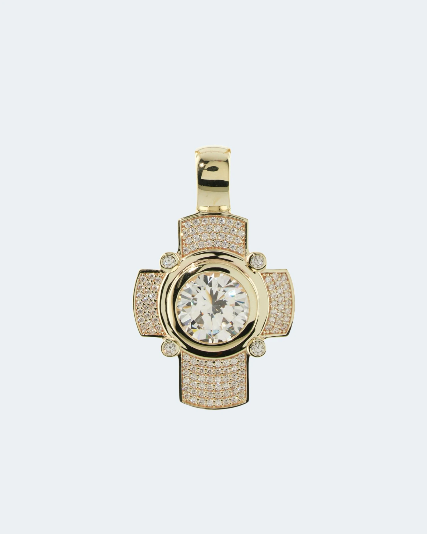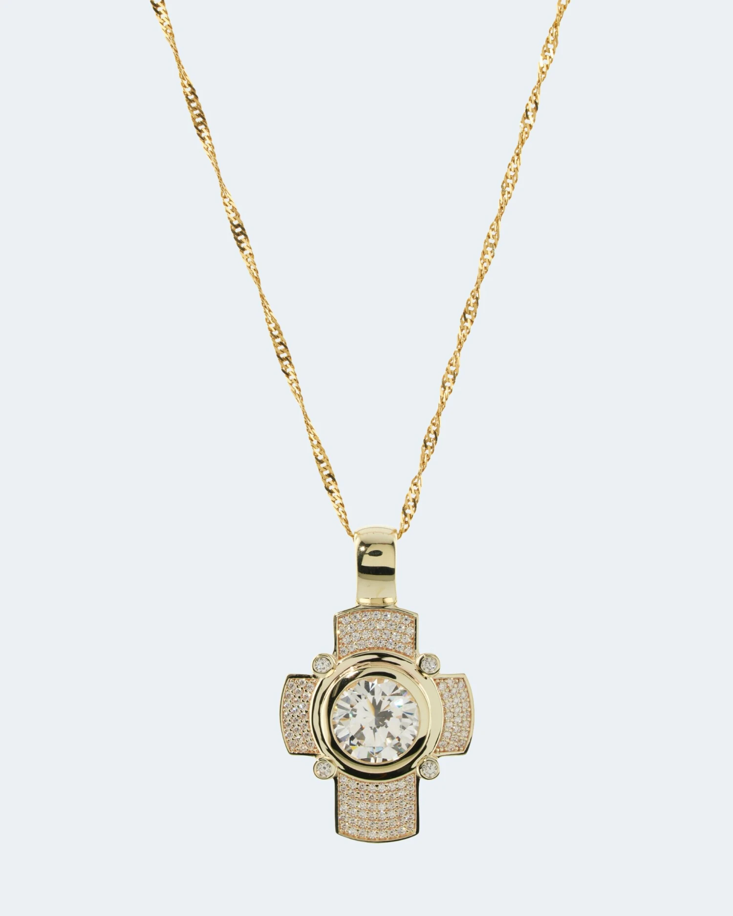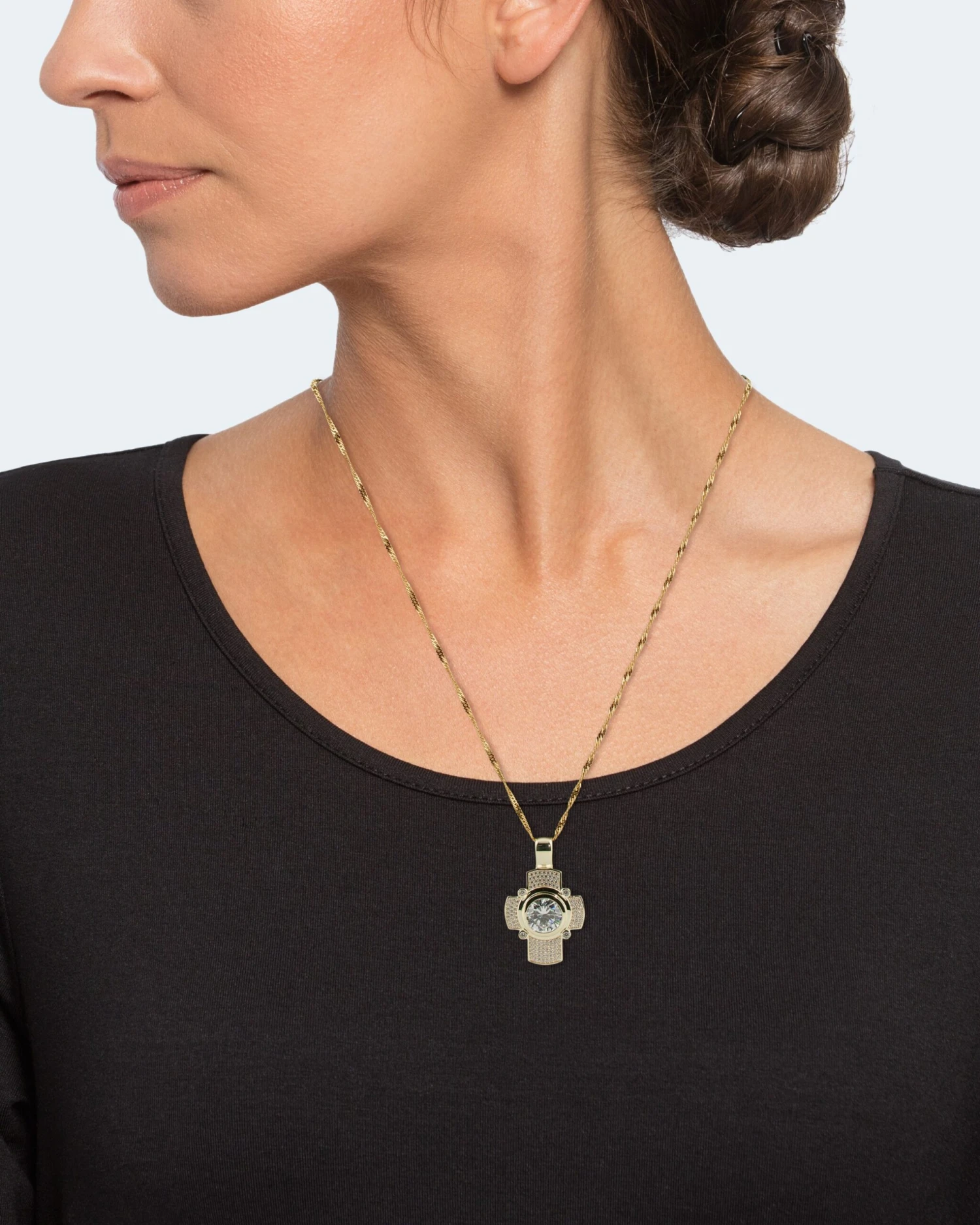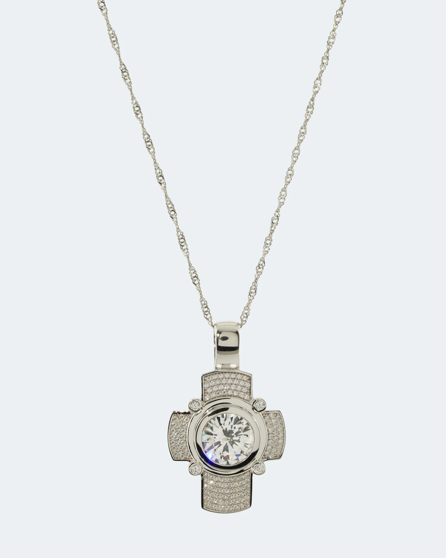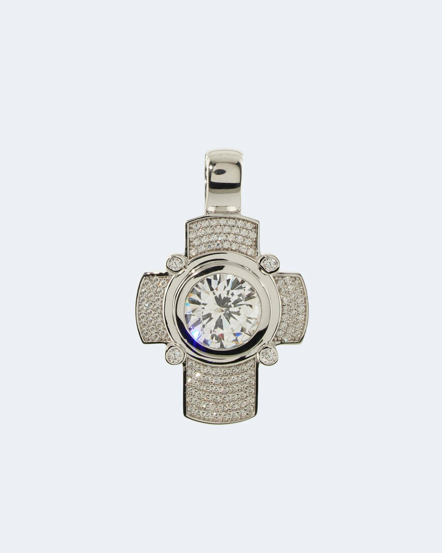 Das Kreuz besteht aus betont breiten Balken, die über und über mit weißen Zirkonia besetzt sind. In der Mitte thront zudem ein großer Zirkonia, der durch sein wildes Glitzern für atemberaubende Lichteffekte sorgt!