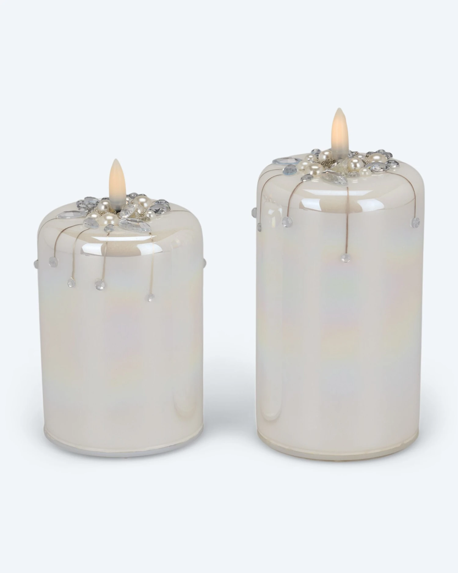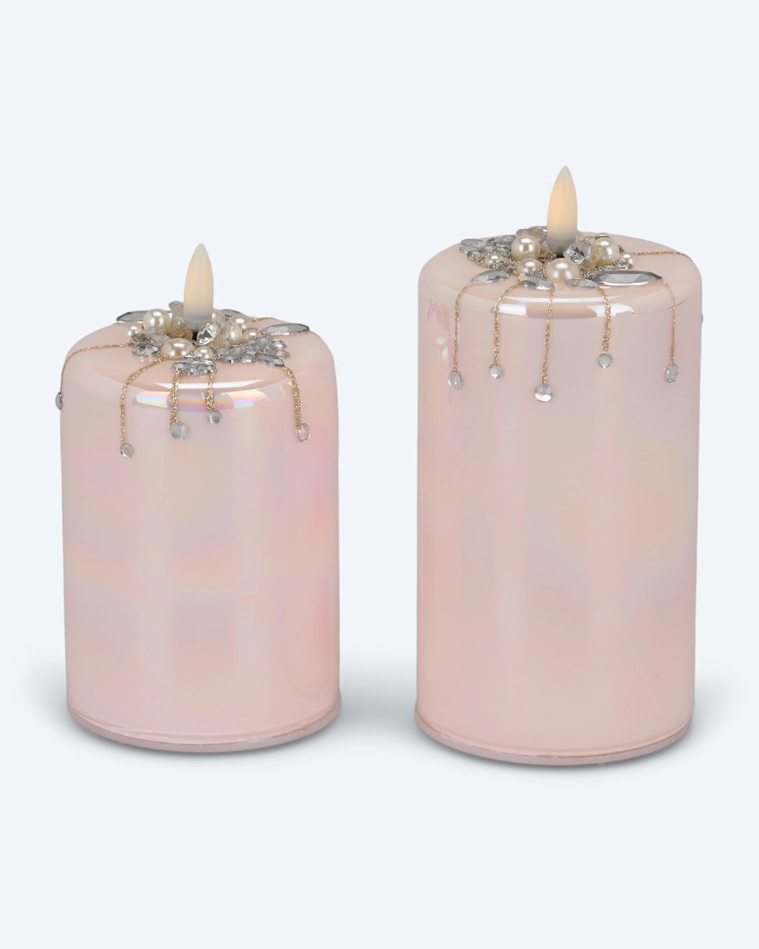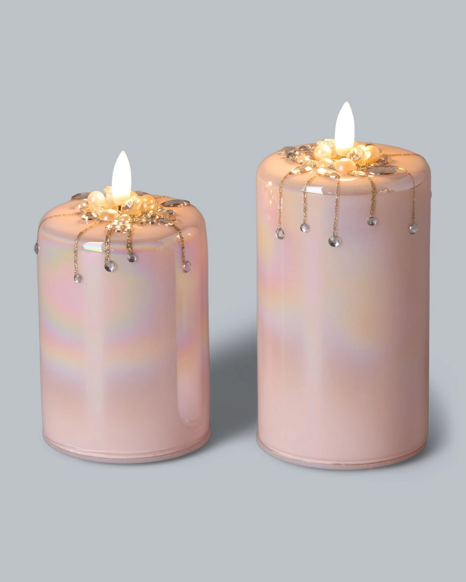 Diese beiden zauberhaften LED-Glaskerzen sind ein echter Blickfang – beleuchtet oder unbeleuchtet. Die Glaskerzen verströmen ein warmweißes Licht und sind mit Perlen und Dekosteinchen verziert. Sie sind 12,5 cm und 17,5 cm hoch und haben eine Brenndauer von bis zu 150 Stunden. Und damit die LEDs zu Ihrer Wunschzeit leuchten sind sie mit einem 6-Stunden-Timer ausgestattet. Der sorgt dafür, dass sich die LEDs täglich zu selben Zeit einschalten, dann sechs Stunden leuchten und sich dann wieder abschalten.