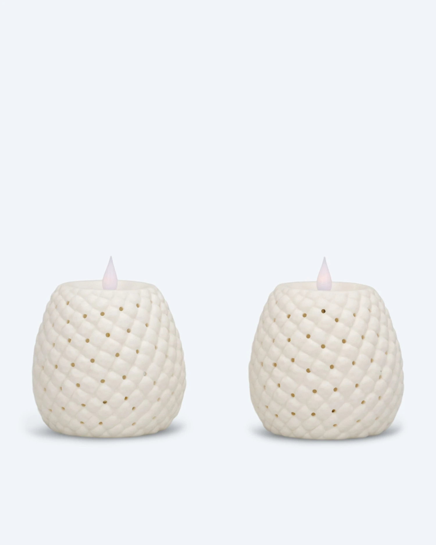 Was ist schon ein entspannter Abend ohne gemütliches Kerzenlicht? Zaubern Sie Atmosphäre in Ihr Zuhause mit diesen wunderschönen Keramikkerzen. Die Kerzen sind liebevoll aus weißer und matter Keramik in Tannenzapfen-Form gestaltet. Mit kleinen Aussparungen, durch die das LED-Licht nach außen scheint. Die perfekte Romantik-Deko für Herbst und Winter, jedes Jahr wiederverwendbar. Mit praktischer 6h-Timer-Funktion.